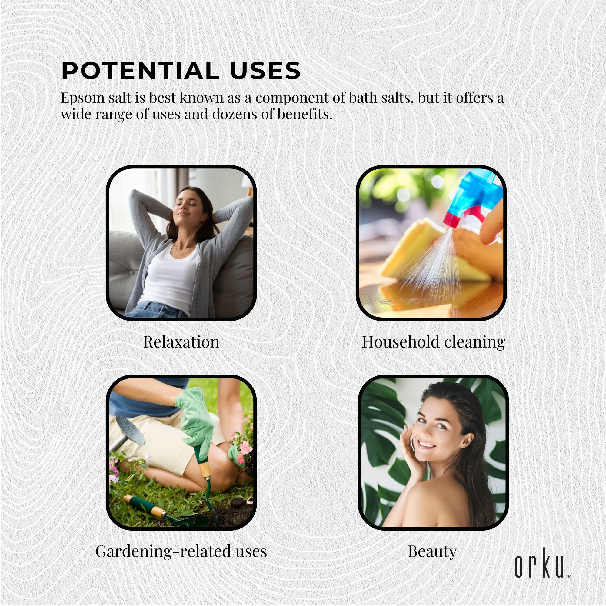 This product is pharmaceutical-grade Epsom salt, known for its high purity and natural composition. It offers a variety of uses including therapeutic baths, gardening, and household cleaning, providing numerous benefits for health and wellness.