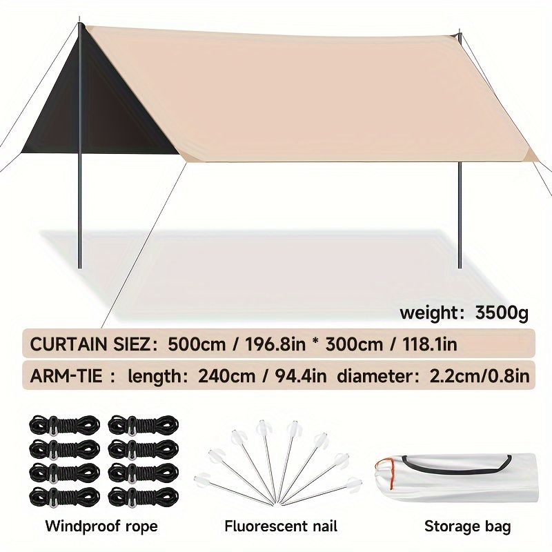 This outdoor camping square sky curtain is designed to provide sun and rain protection, measuring 500 by 300 centimeters. It is suitable for outdoor activities and offers a durable and reliable shelter solution for various weather conditions.