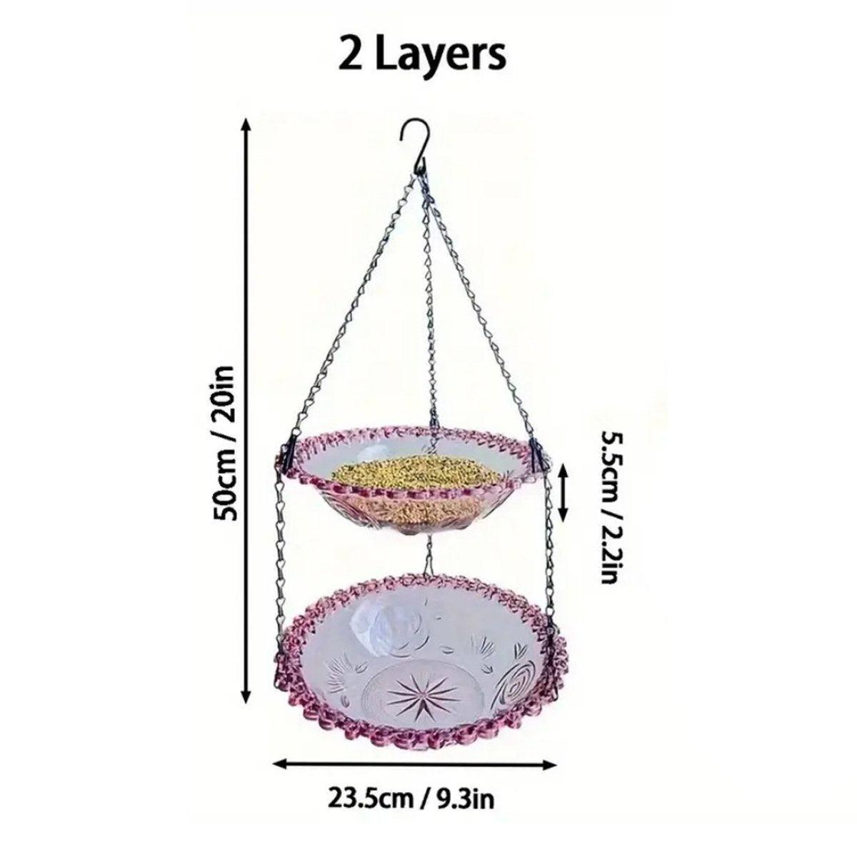 This outdoor hanging bird feeder and bath decoration is designed to enhance your garden or patio. It features an attractive two-layer design with intricate patterns and vibrant colors, providing a functional space for birds to feed and bathe. Made from durable materials, it is suitable for outdoor use and easy to hang in various settings.