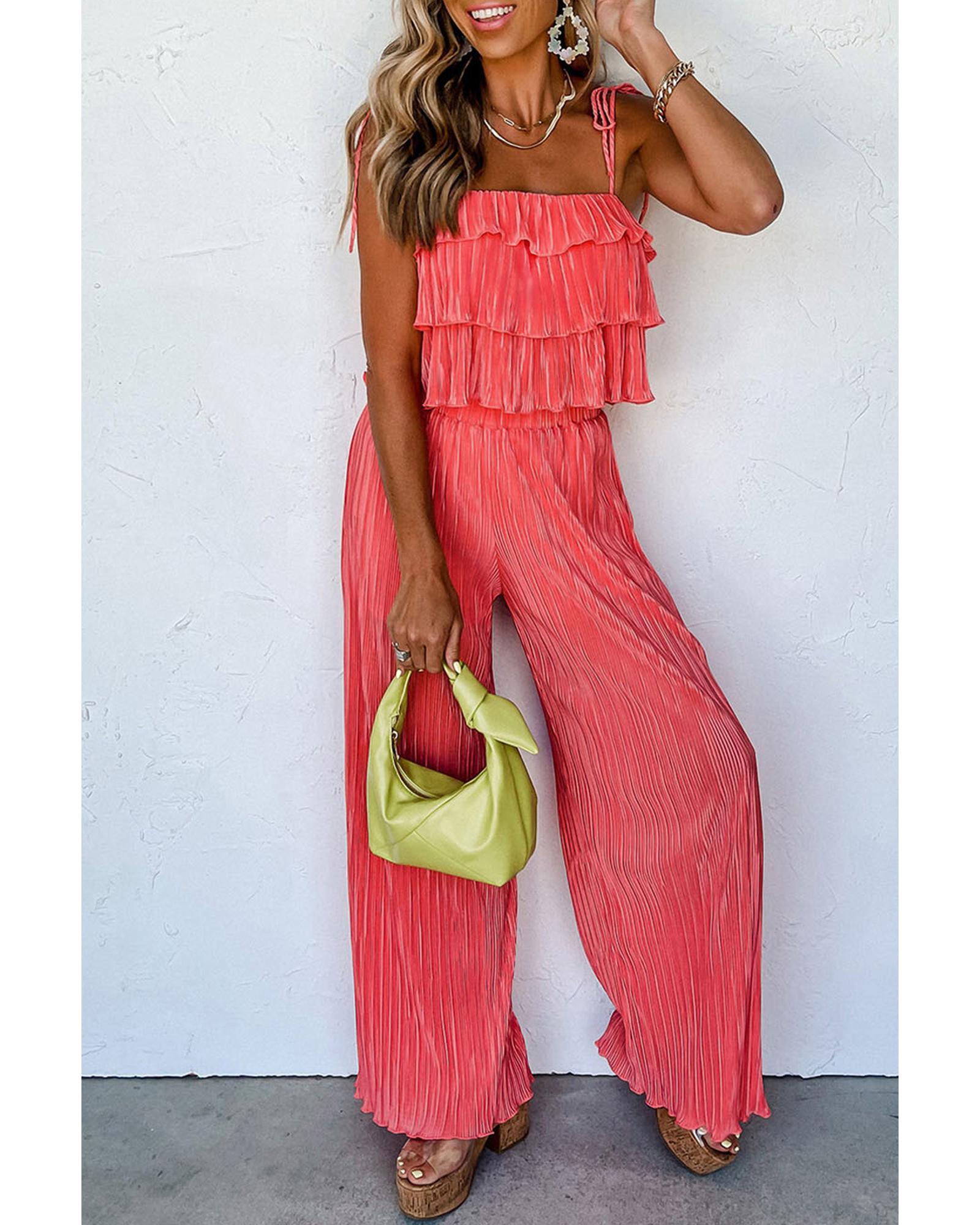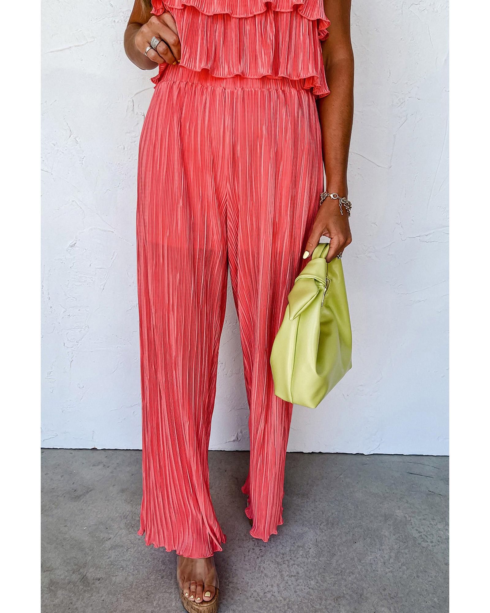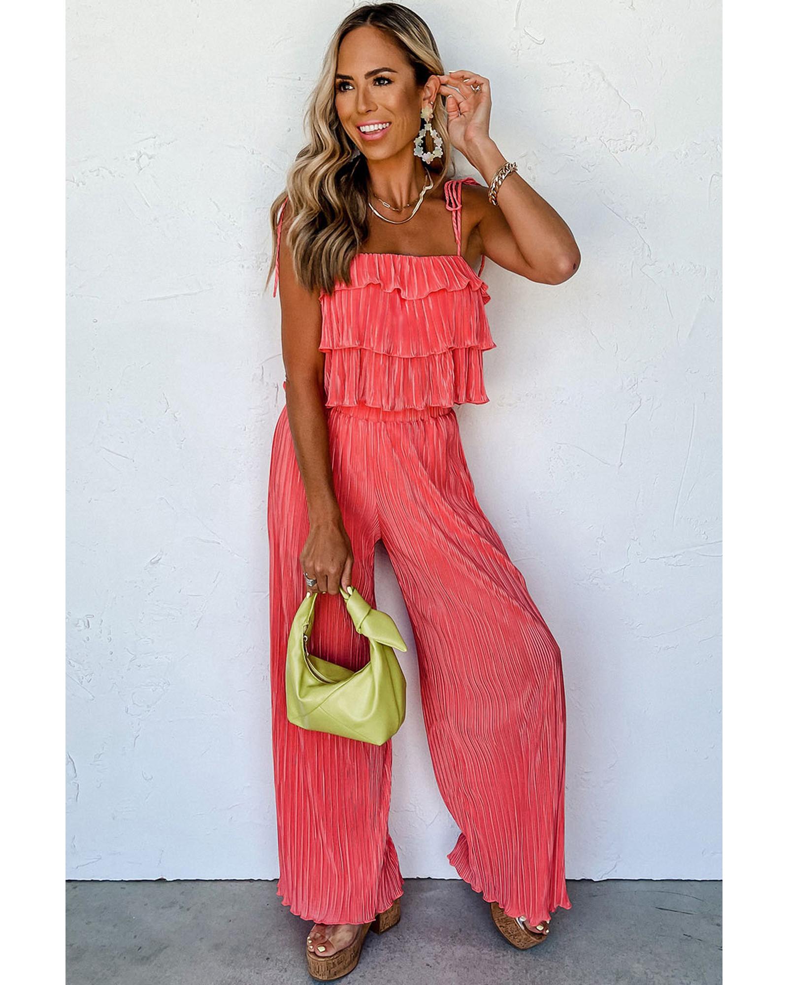 This stylish set features a pleated tank top paired with wide-leg pants, creating a trendy and feminine look. The ruffle tiered detailing adds a playful touch, making it suitable for various occasions. Designed with a fitted silhouette, it offers a chic and sophisticated appearance.