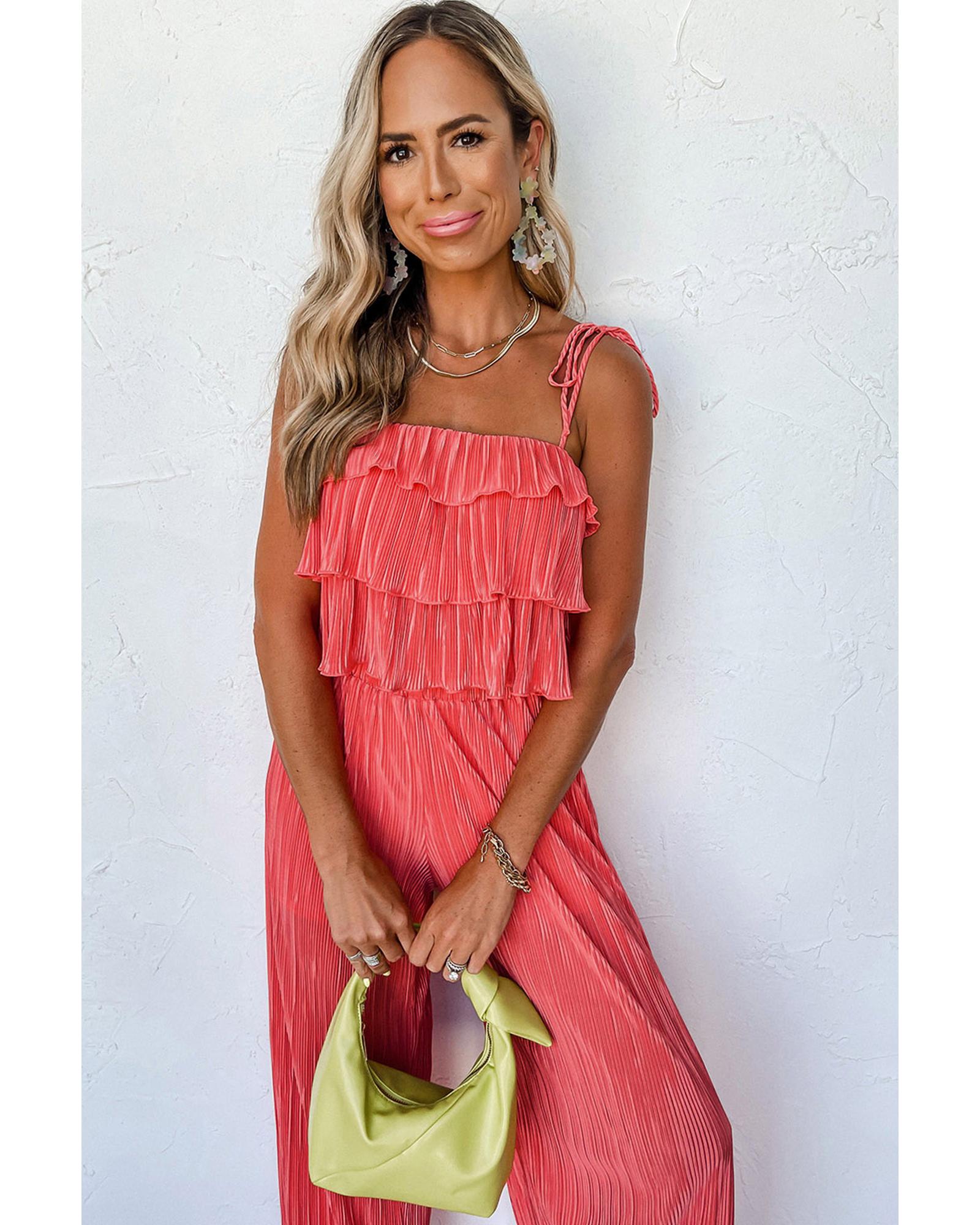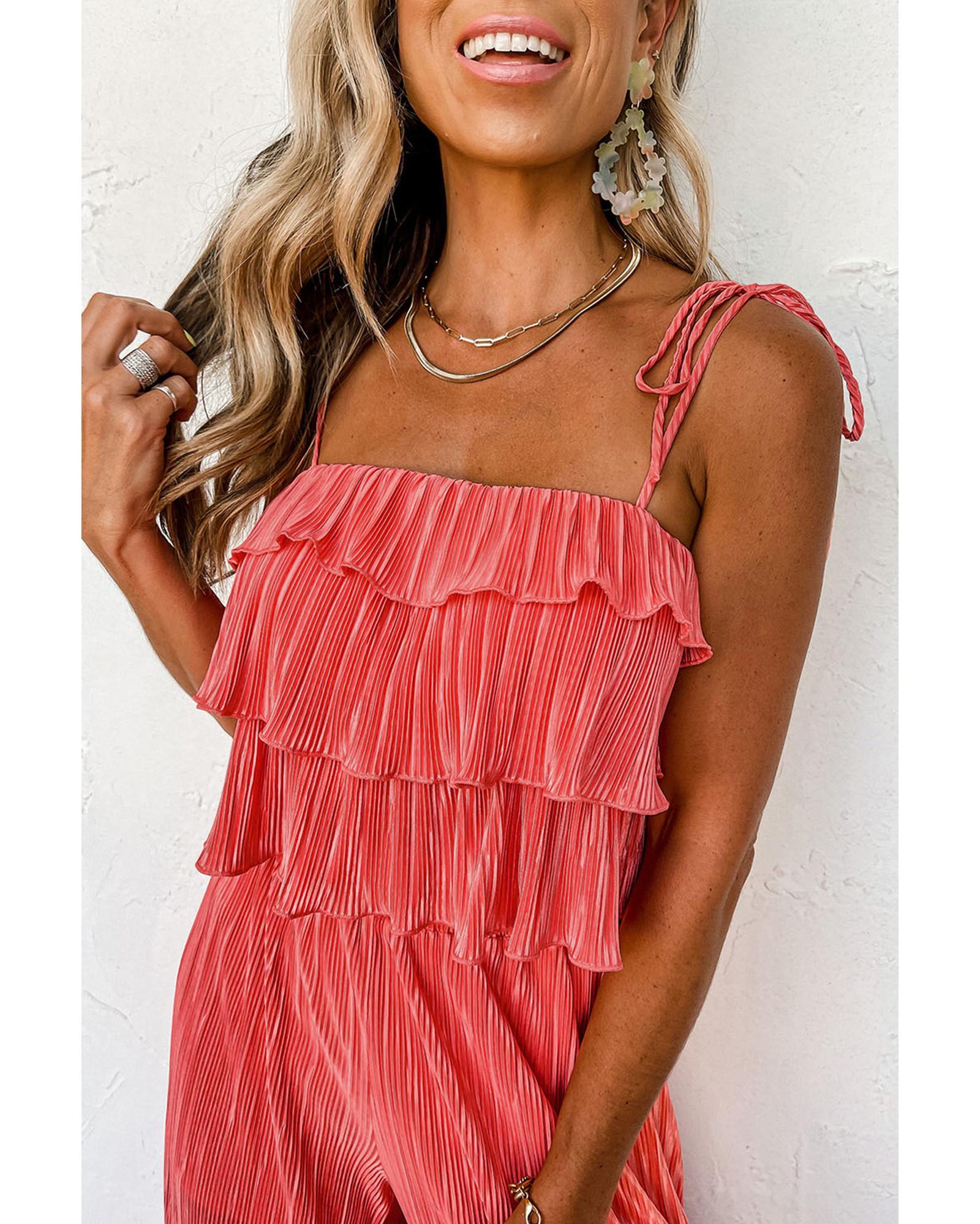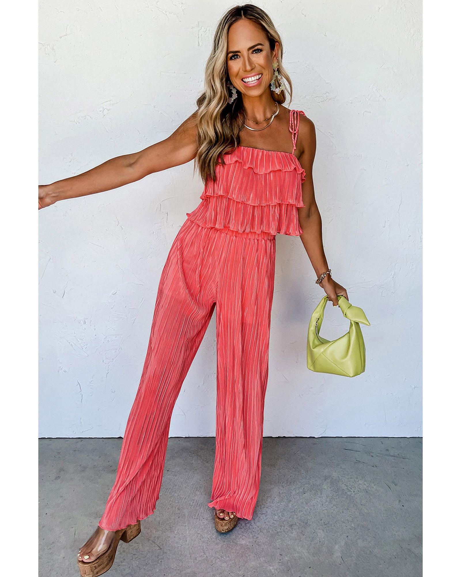This stylish set features a pleated tank top paired with wide-leg pants, creating a trendy and feminine look. The ruffle tiered detailing adds a playful touch, making it suitable for various occasions. Designed with a fitted silhouette, it offers a chic and sophisticated appearance.