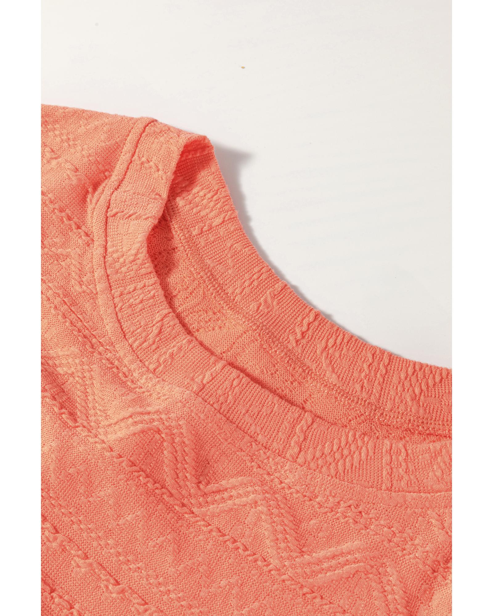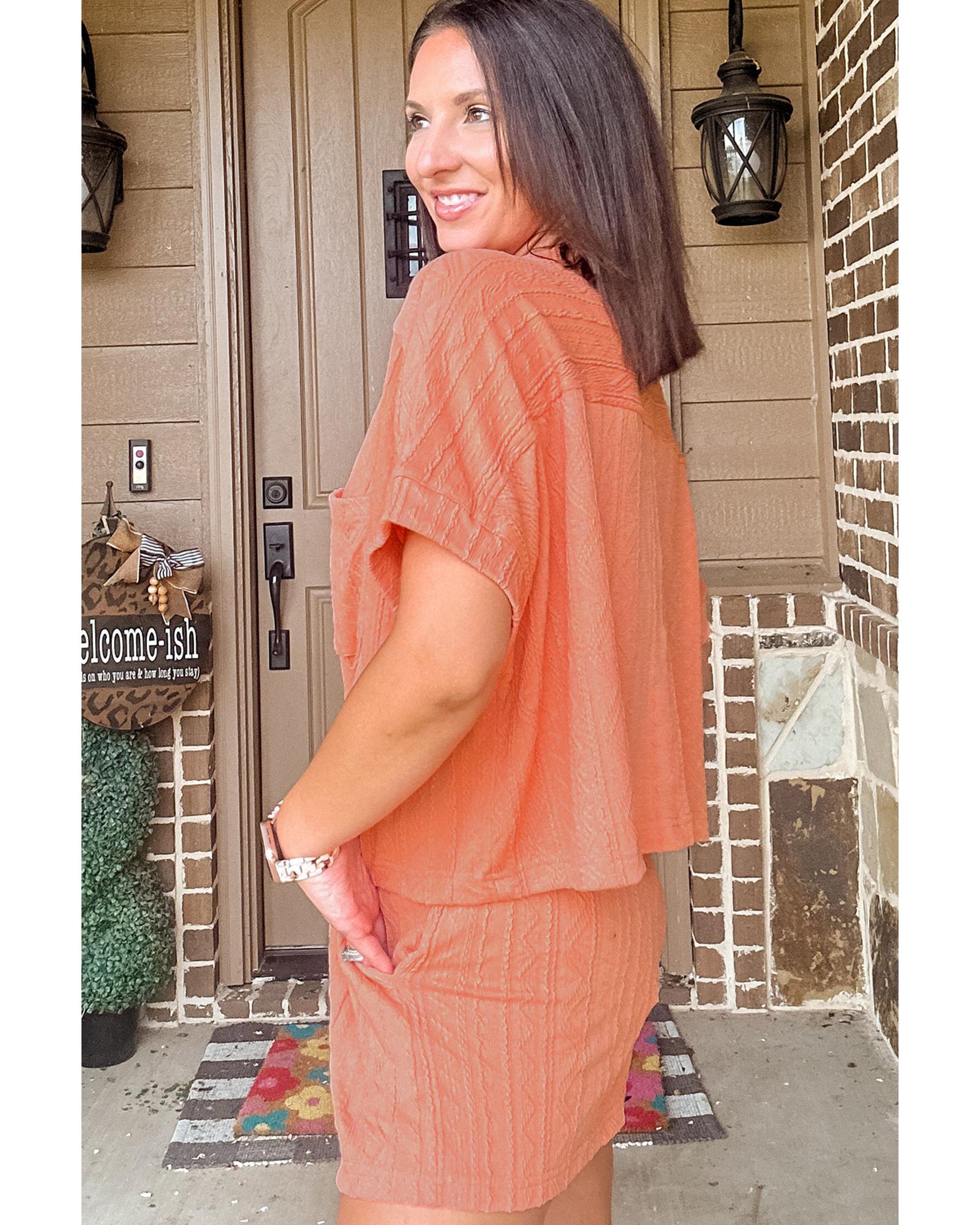 This stylish short sleeve top and drawstring shorts set features a textured fabric in a pale chestnut color, offering a trendy and comfortable look. Designed with a loose crew neck and patched pocket details, it provides a versatile and fashionable option suitable for various occasions and body types.