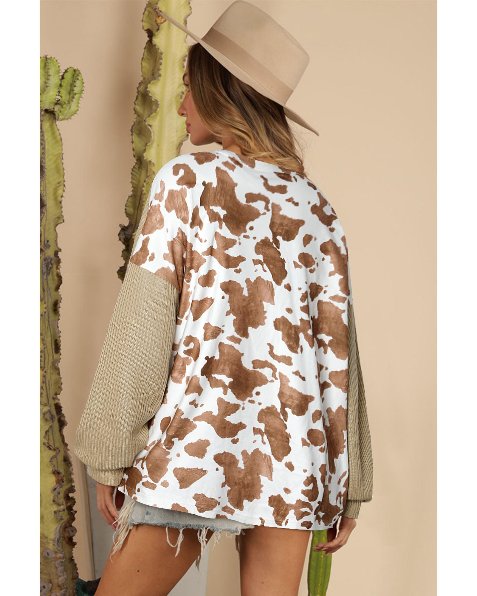 Apricot Leopard Splicing Exposed Seam Waffle Knit Top - M