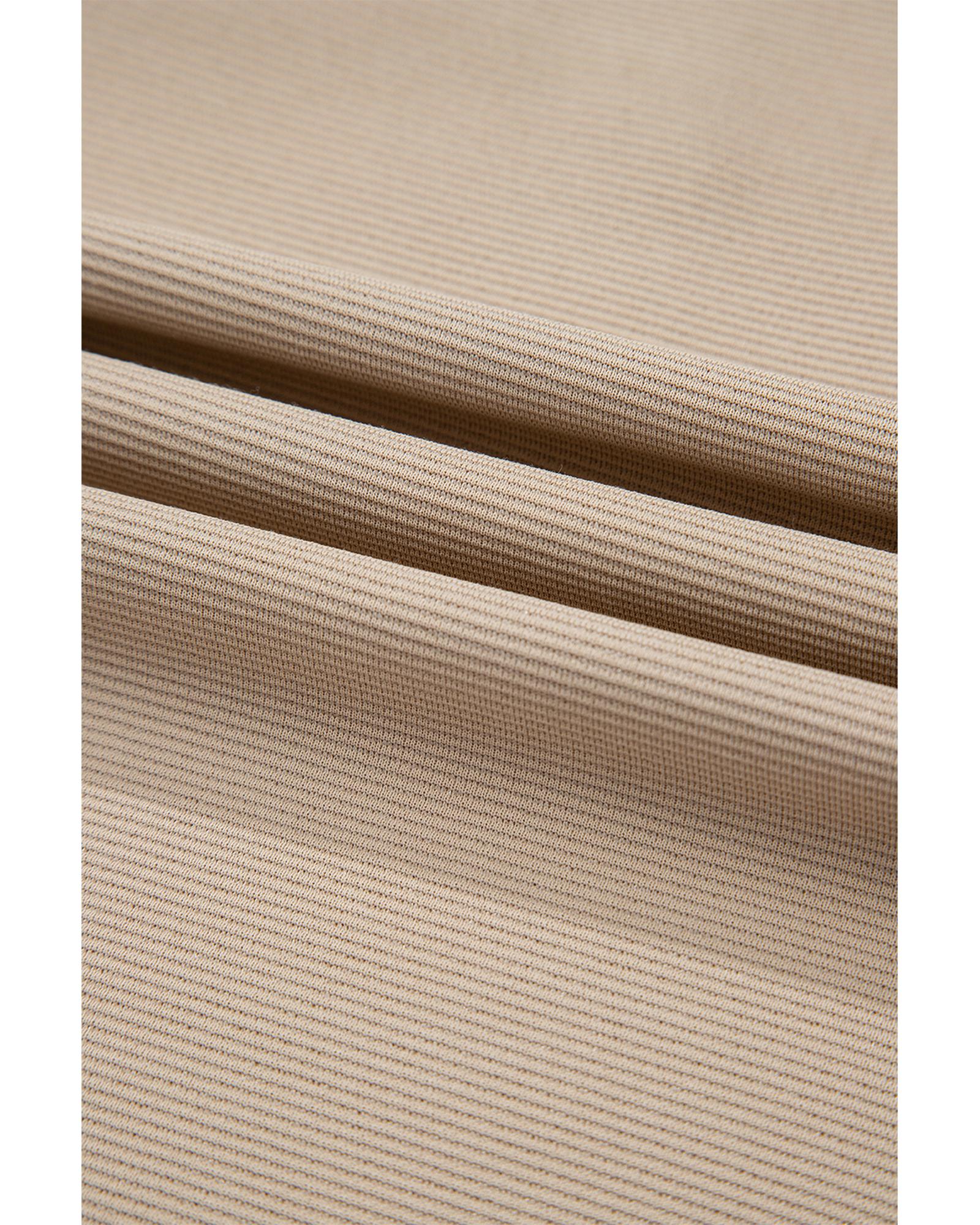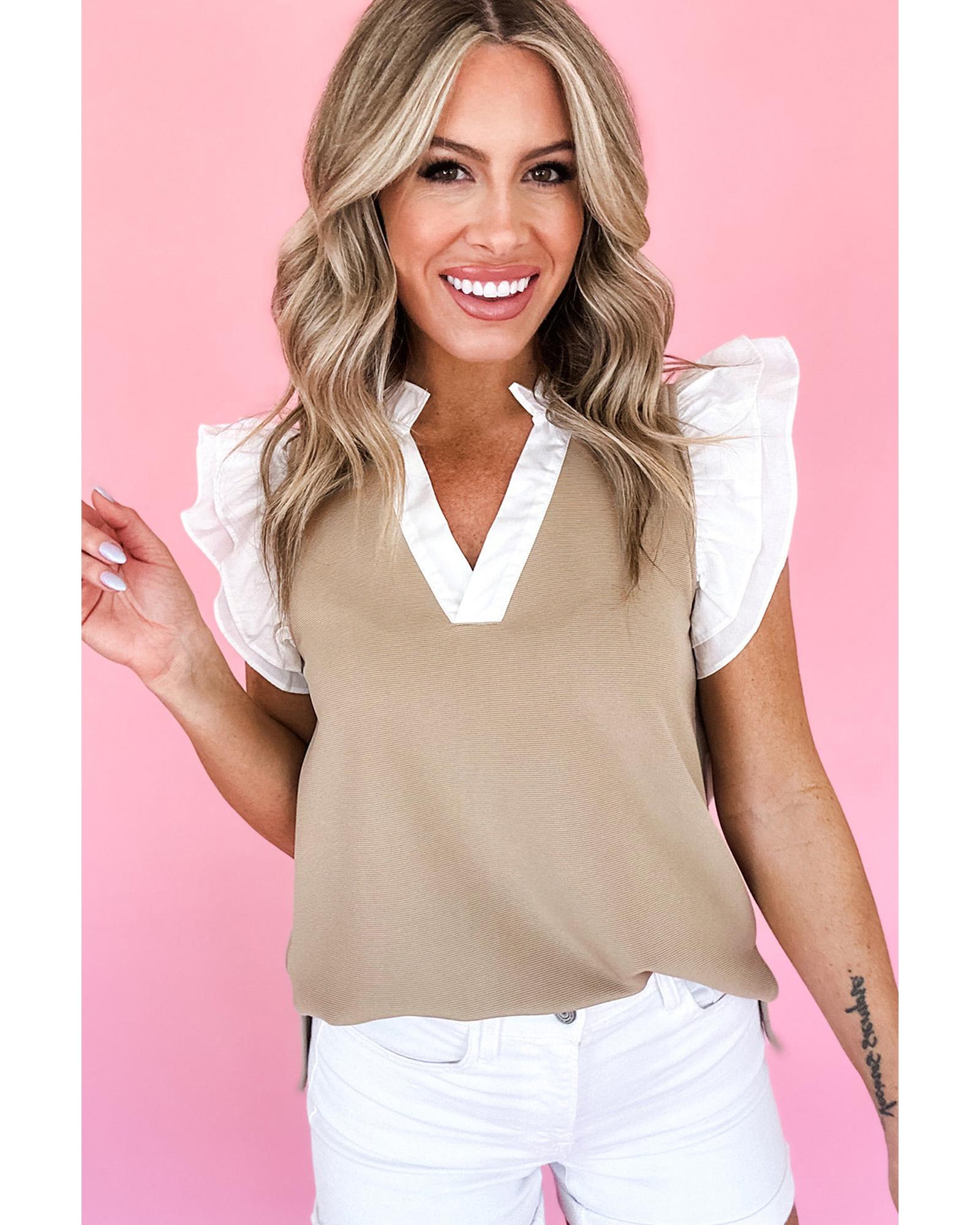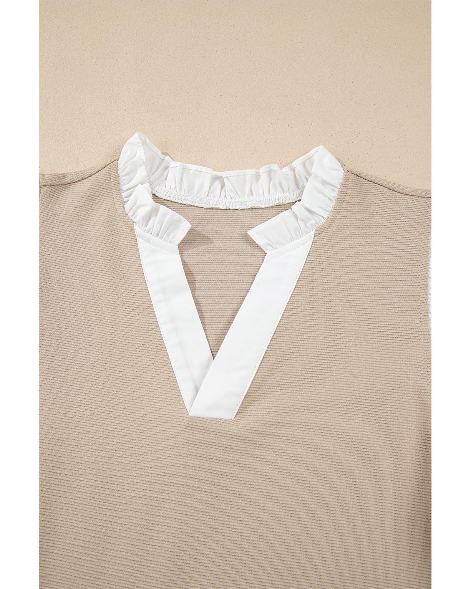 This Pale Khaki Contrast V Neck Ruffled Textured Knit Top offers a stylish and trendy fitted look, designed to enhance your wardrobe with its unique textured fabric and ruffled details. Perfect for casual or semi-formal occasions, it combines comfort with fashionable appeal.