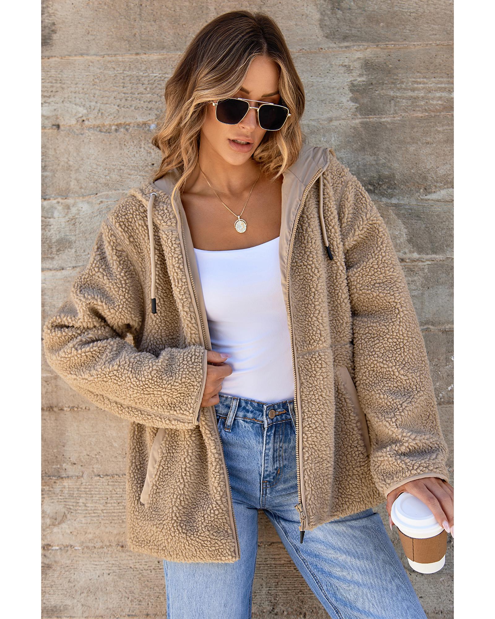 This fleece zip-up jacket features a stylish and comfortable design, perfect for layering or wearing on its own. It offers a cozy fit with practical details suitable for chilly days and relaxed evenings.