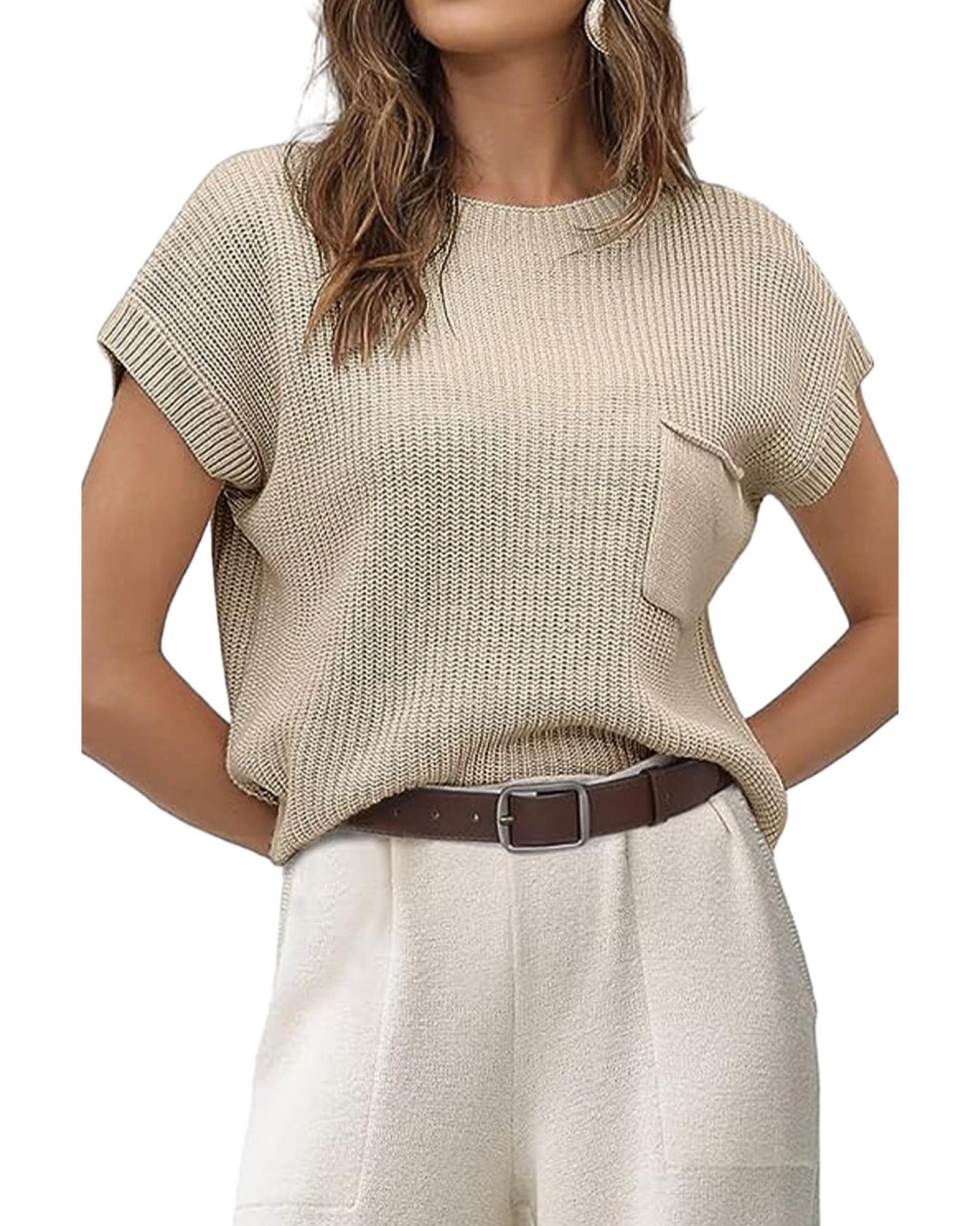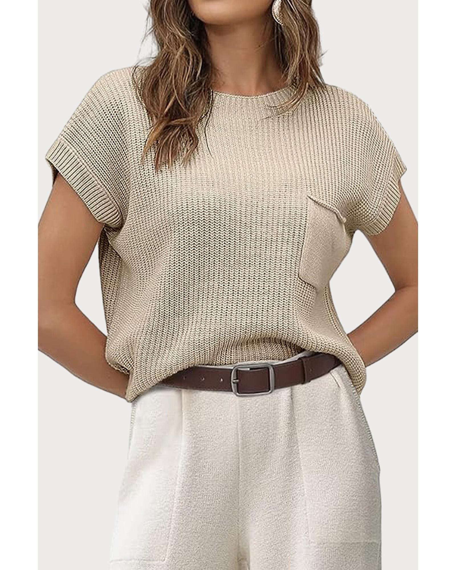 This short sleeve sweater features a stylish pale khaki color with a patch pocket design, offering a versatile and trendy look suitable for various casual occasions. Made from a soft and breathable fabric blend, it provides all-day comfort and pairs effortlessly with jeans, skirts, or shorts. Available in multiple styles and sizes, it is an ideal transitional piece for your wardrobe.