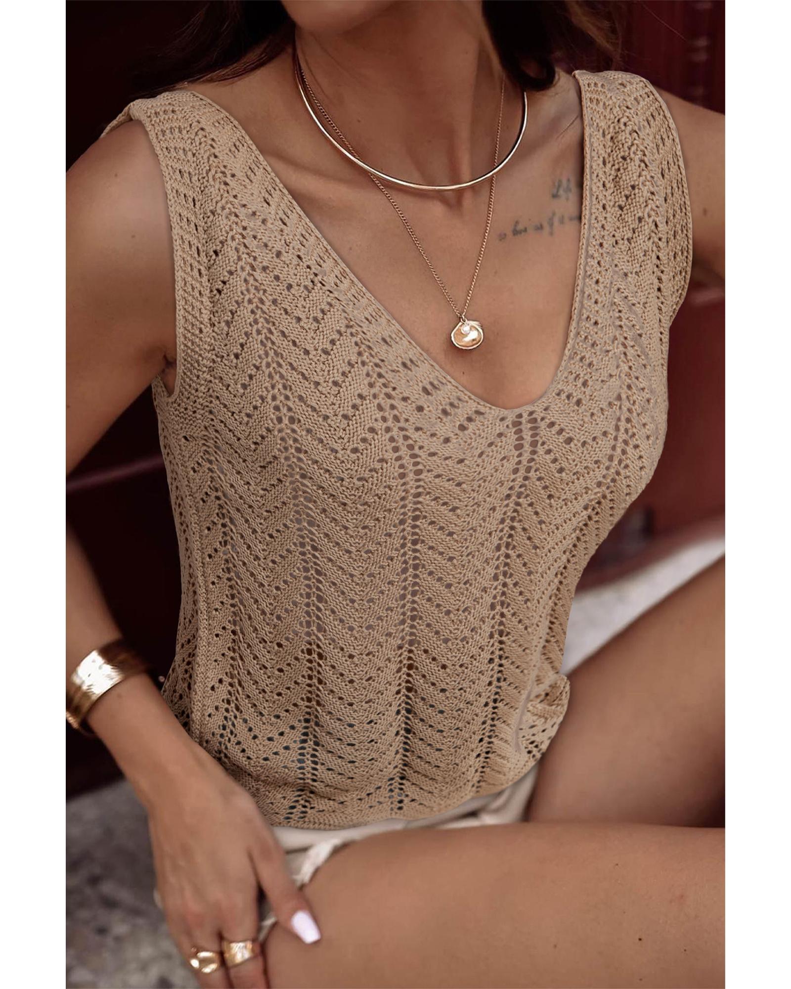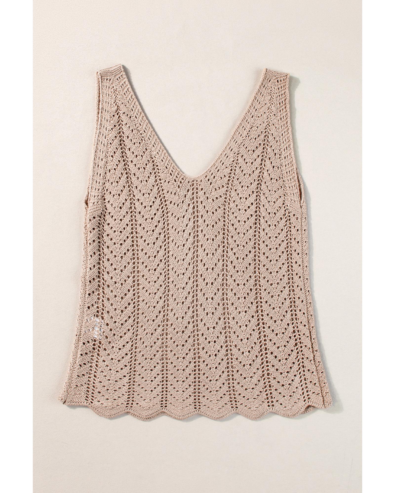 This vest features a trendy fitted design with a scalloped hem and a V-neckline, creating a chic and boho-inspired look. Its openwork crochet knit pattern adds an exquisite touch, making it a versatile piece suitable for pairing with denim shorts and skirts for a stylish appearance.