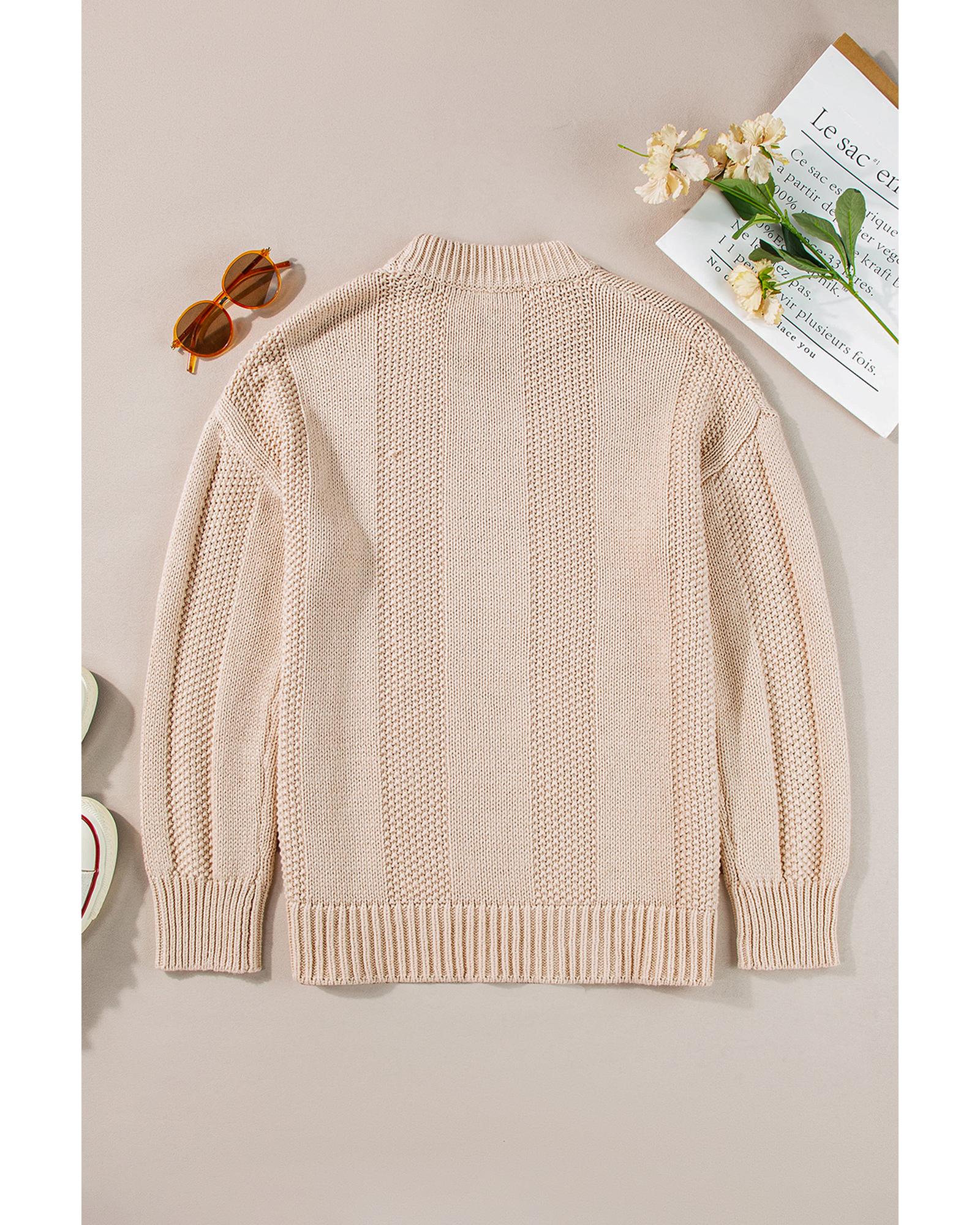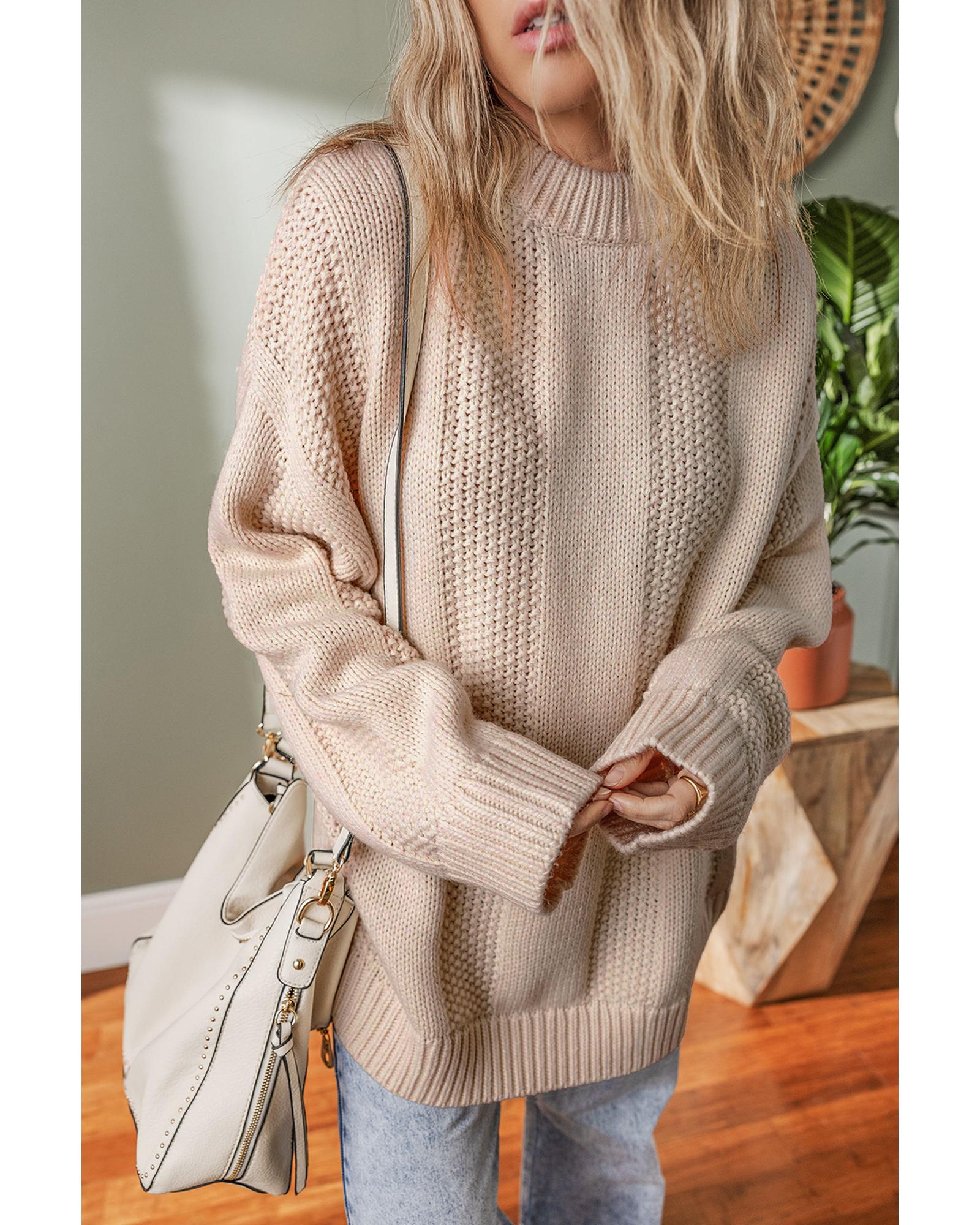 Pale Khaki Solid Color Cable Knit Ribbed Loose Sweater – S