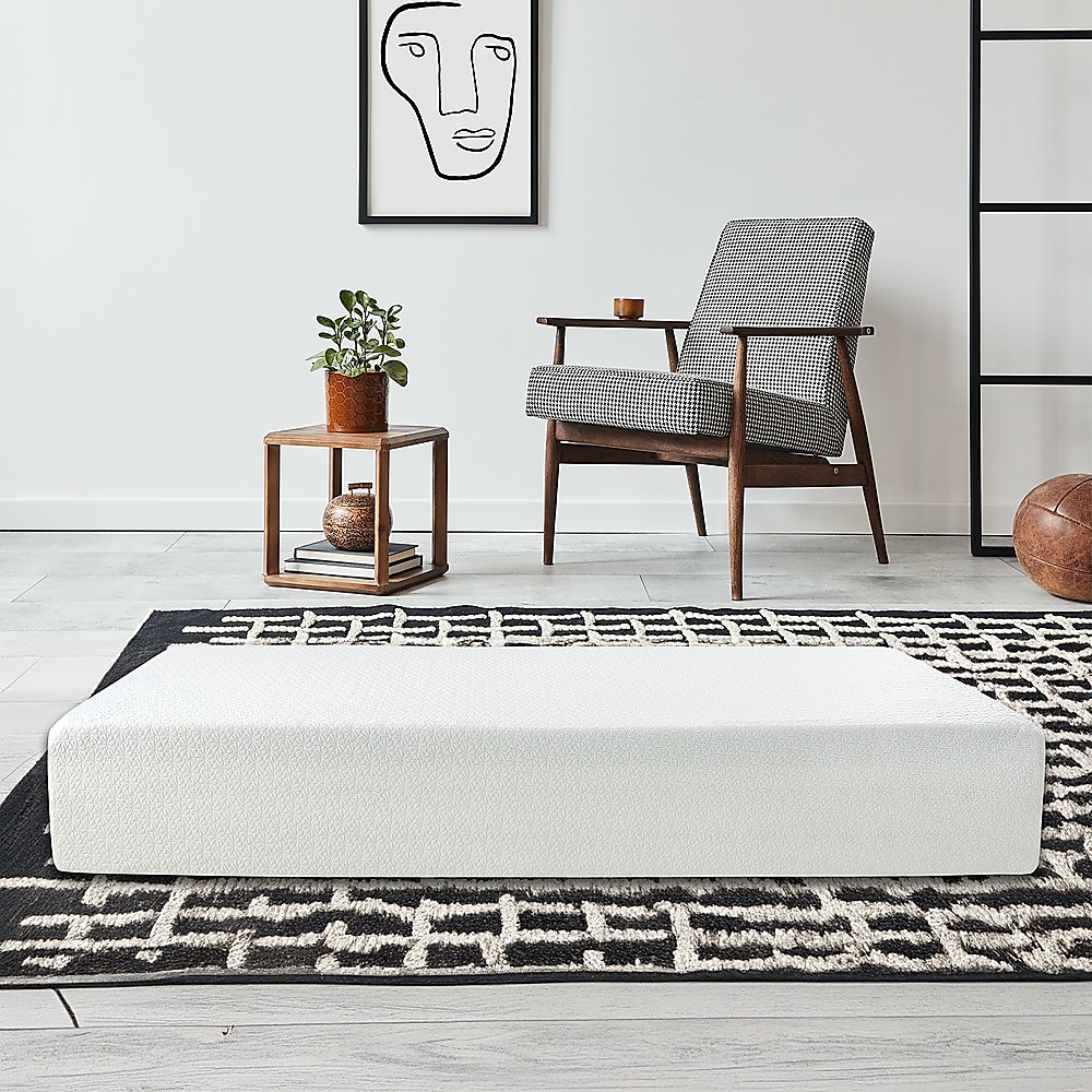 Features include pressure relief, body contouring, and a medium firmness level. The mattress is compressed and rolled for easy delivery and requires 48-72 hours to fully expand. It is made with CertiPUR-US certified foam, ensuring low emissions, durability, and performance.