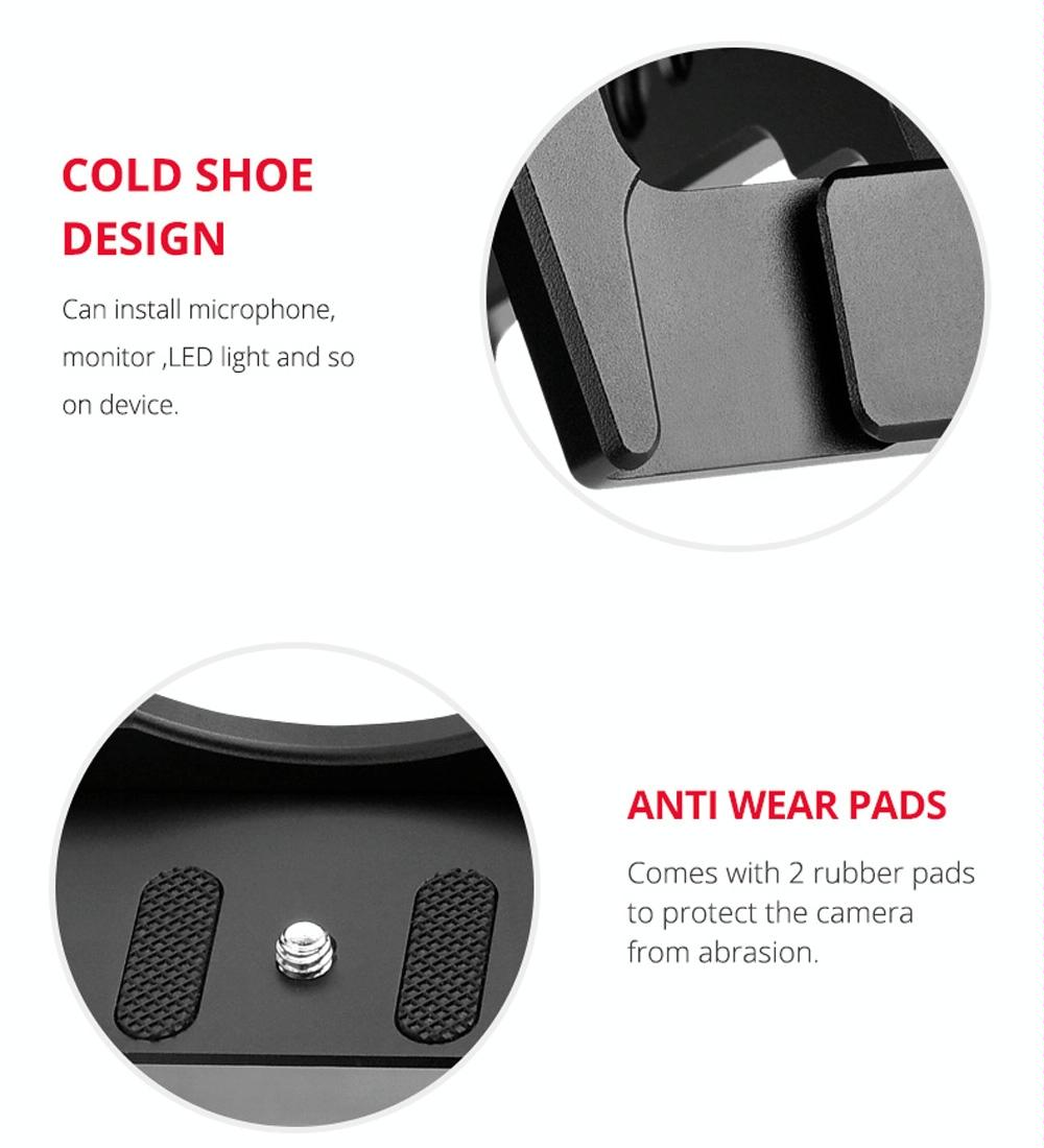 This camera cage stabilizer is designed to provide a sturdy and reliable support for compatible camera models. Crafted with precision, it offers durability and ease of use for professional videographers and photographers.