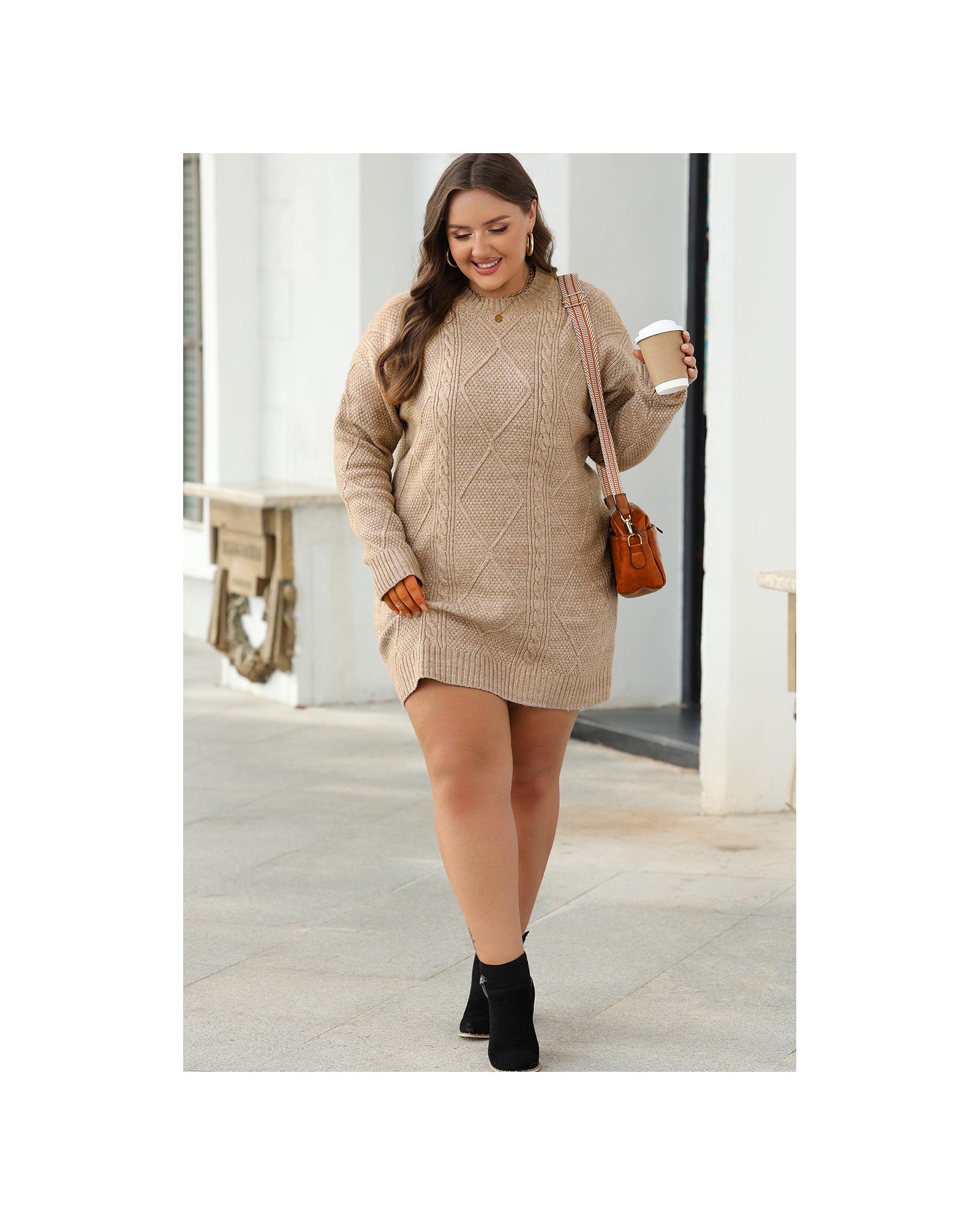 This sweater dress features a cozy cable knit design combined with a relaxed fit, making it a versatile addition to any wardrobe. Its drop shoulder silhouette adds a casual yet stylish touch, suitable for various occasions and easy to dress up or down.