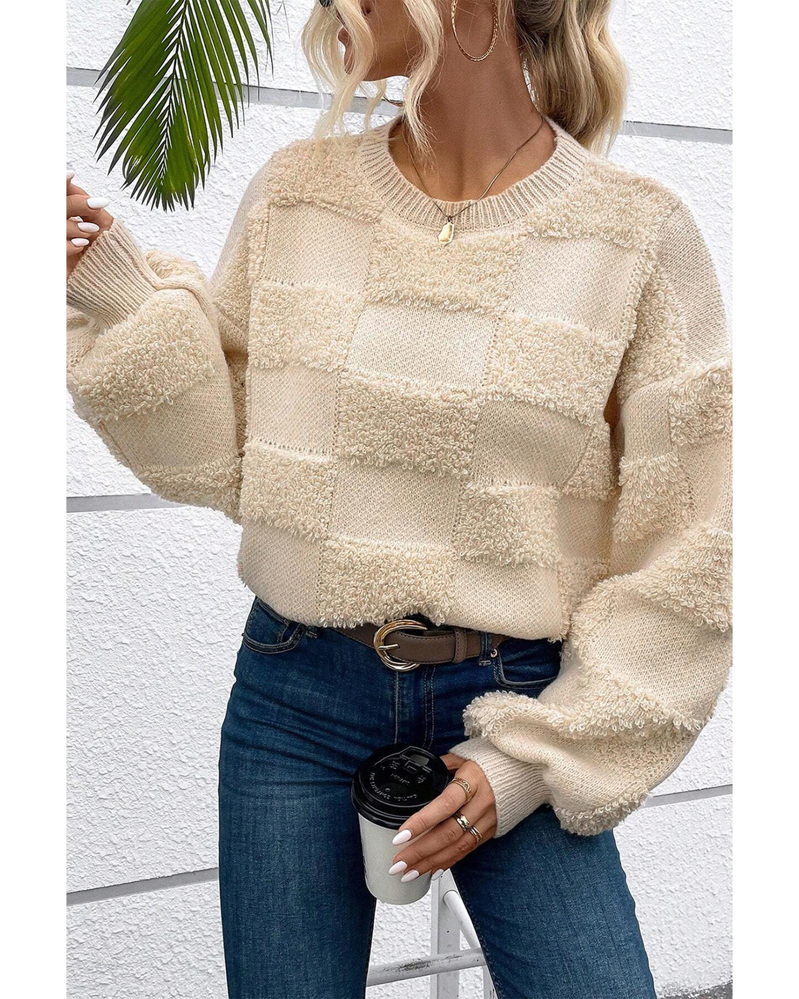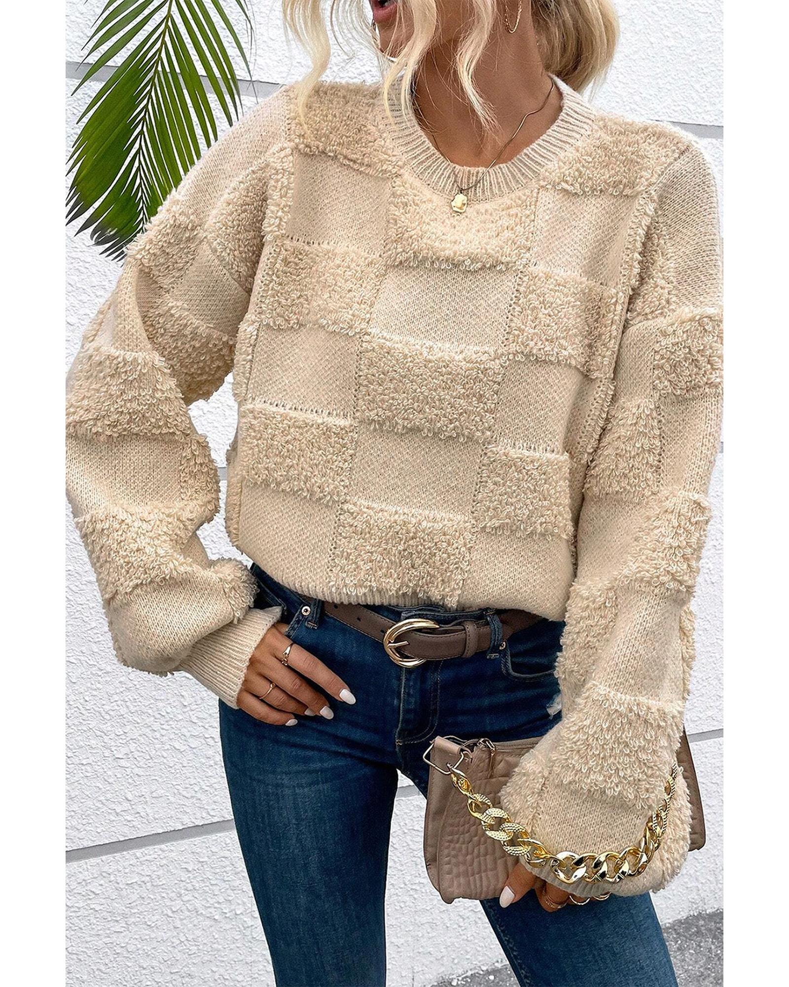 Parchment Checkered Sherpa Crew Neck Loose Sweater – XL
