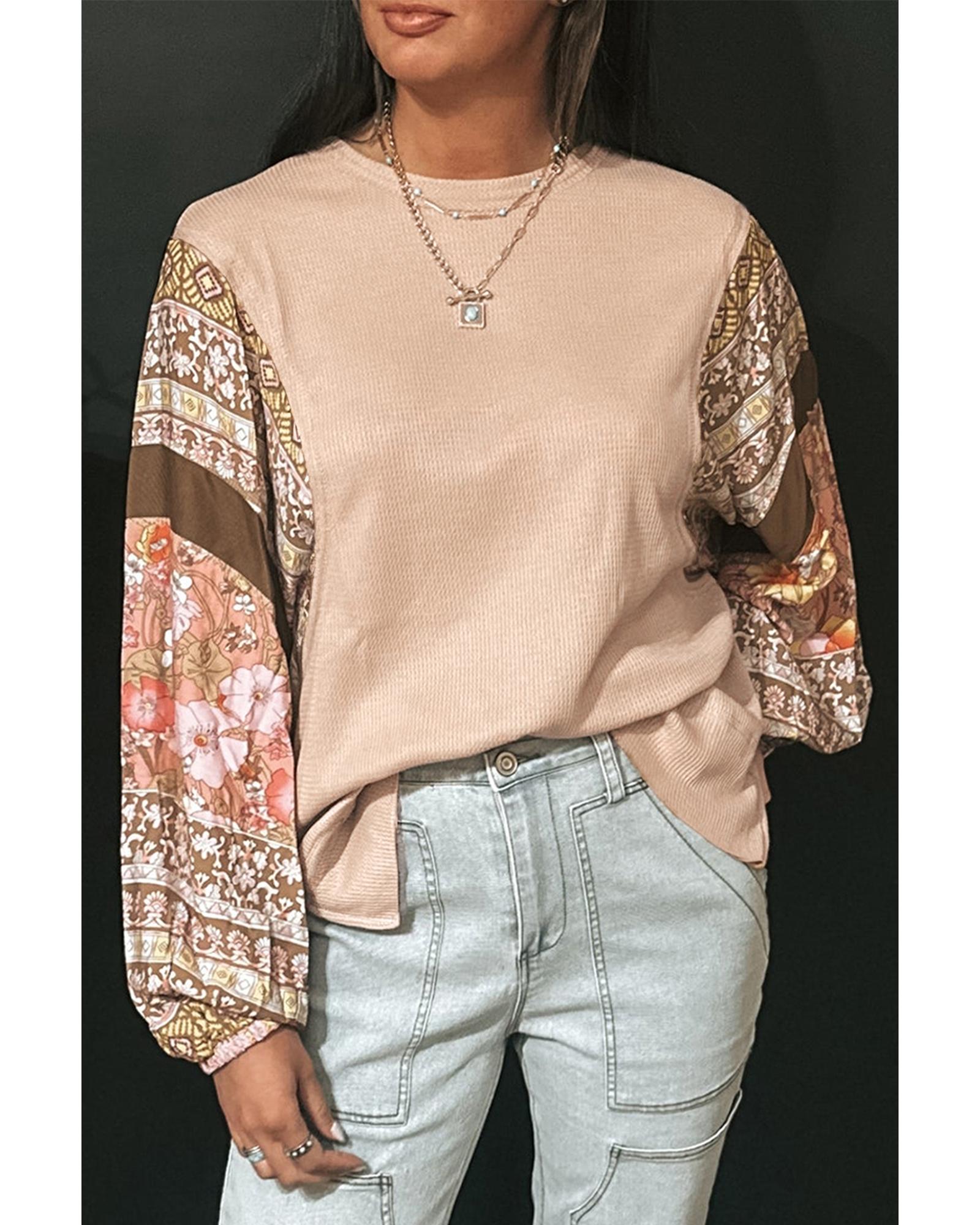 Parchment Contrast Floral Patchwork Puff Sleeve Waffle Knit Top – L