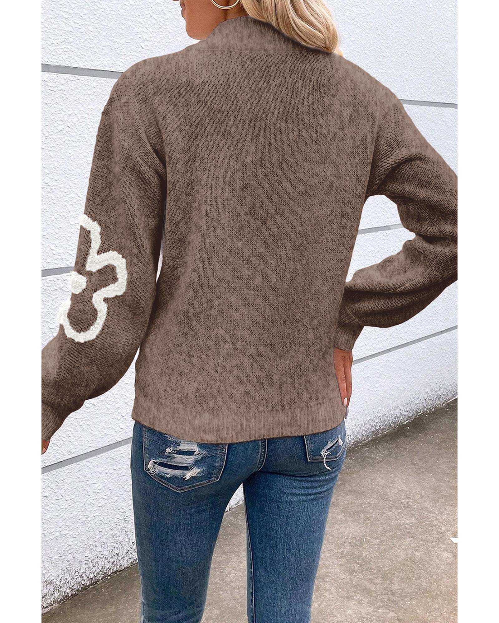 Parchment Contrast Flower Half Zipper Stand Neck Sweater – L