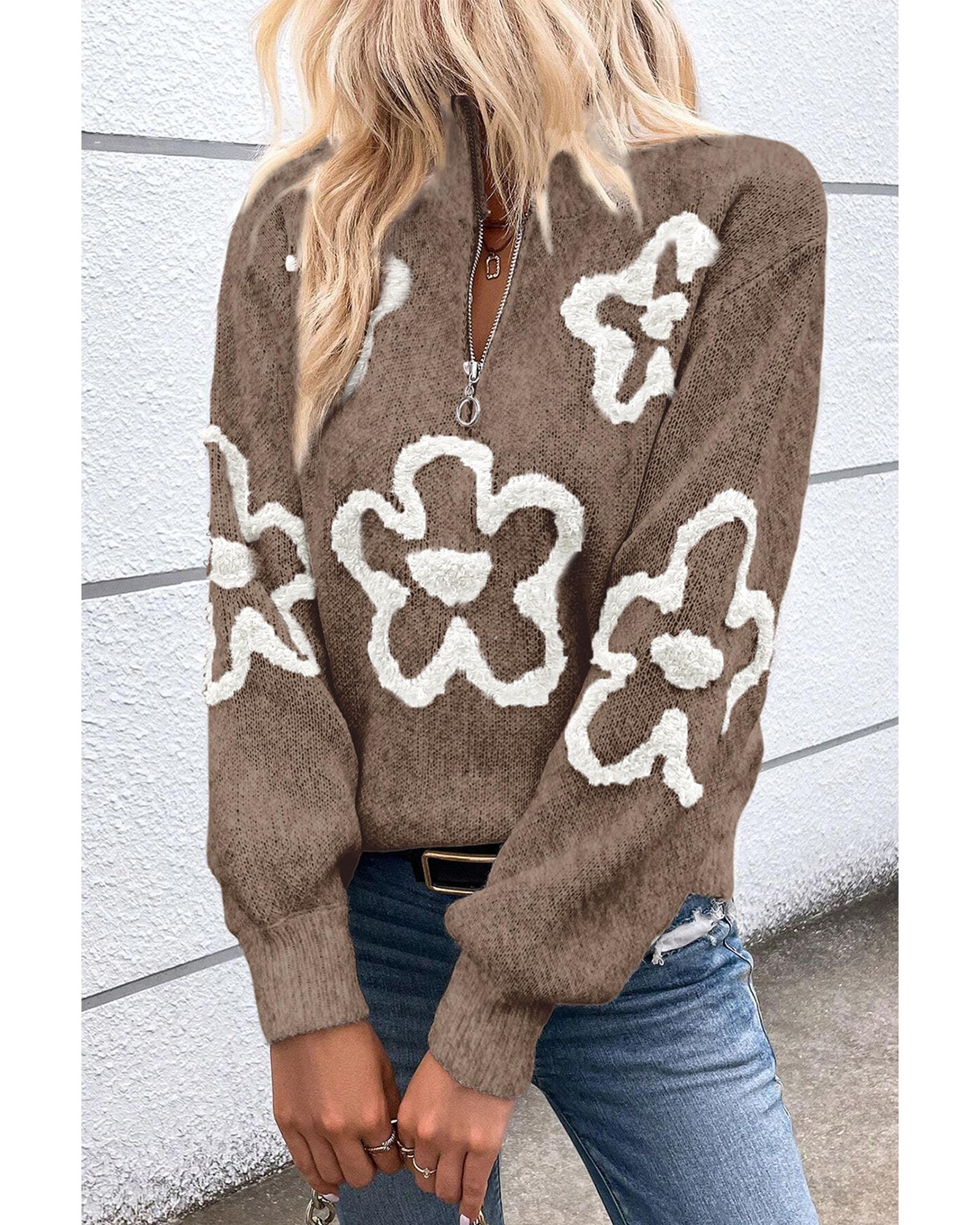 This stylish knitted sweater features a contrasting flower pattern and a stand neck design, offering a warm and chic look suitable for casual outfits. Its half zipper adds flexibility and ease of wear, making it a versatile addition to your wardrobe.