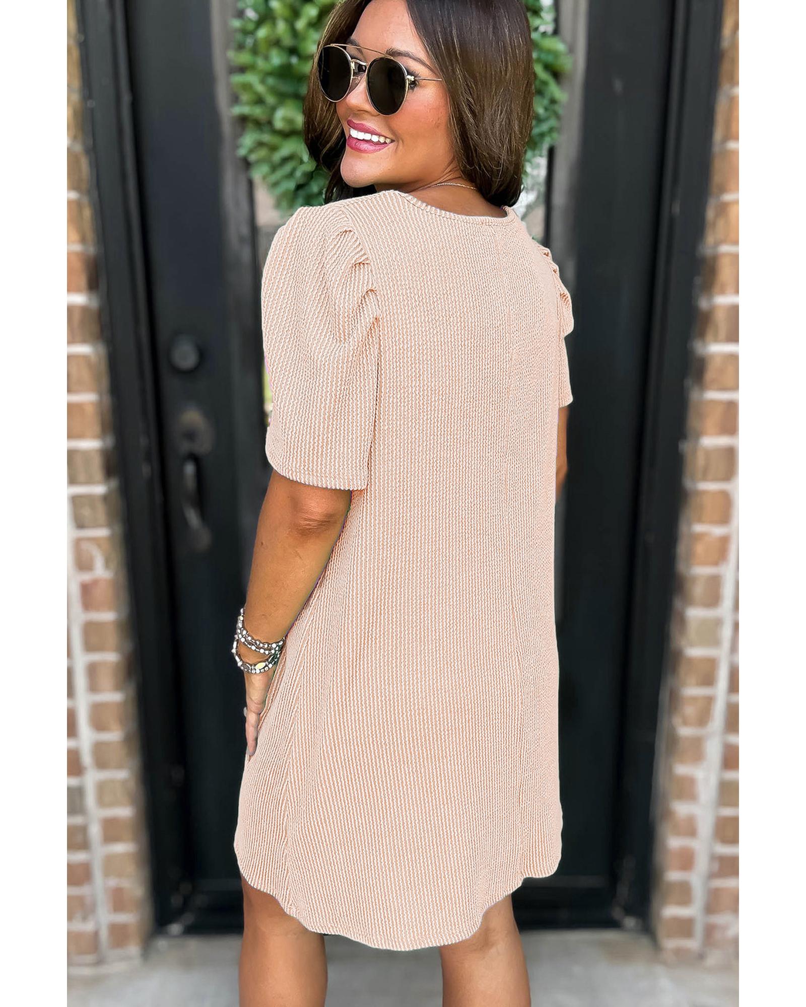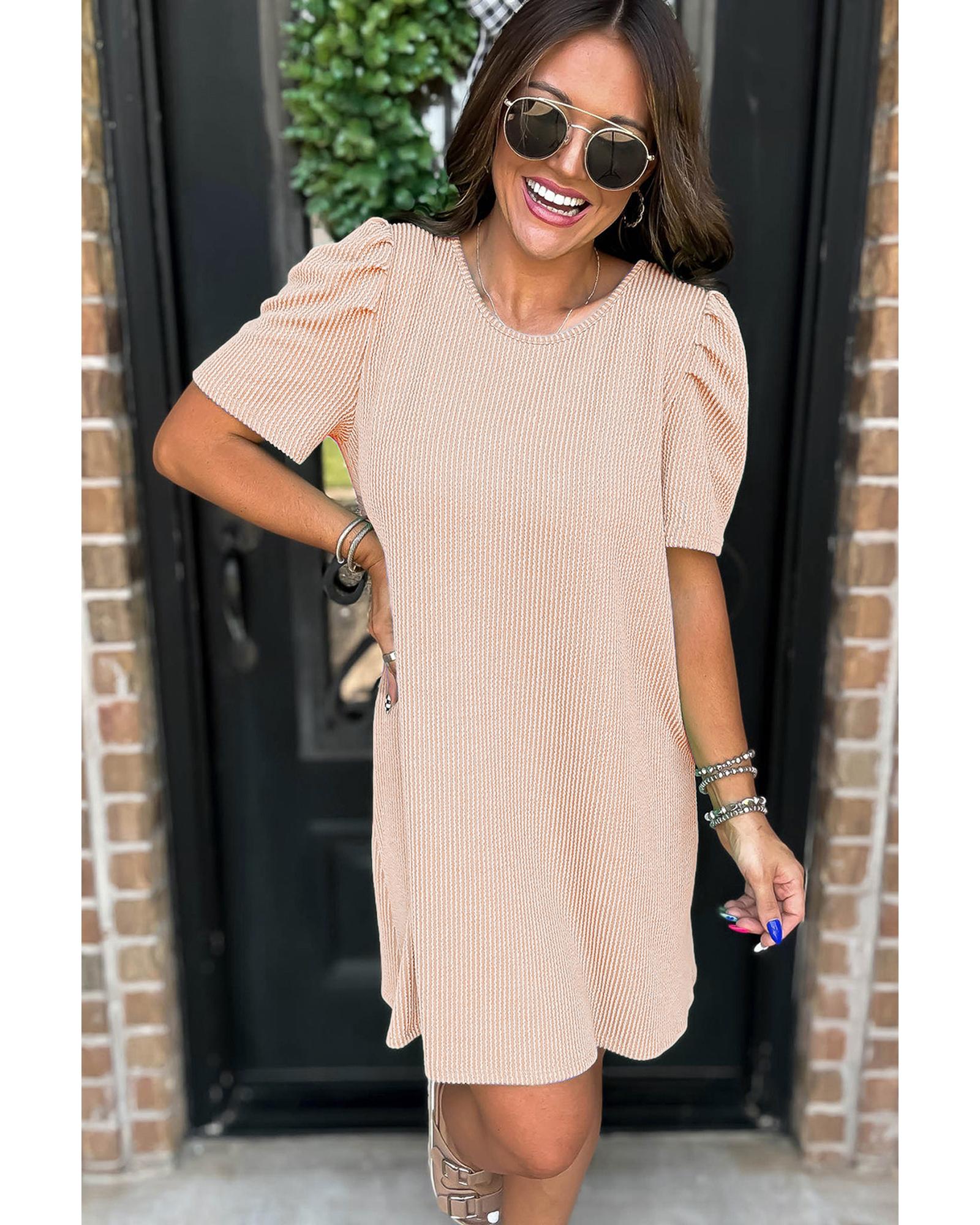 This shift mini dress features a versatile solid color design and is crafted from a luxurious corded knit fabric. It combines a flattering crew neck with chic puff sleeves, creating a stylish and eye-catching look. The dress offers a comfortable fit with its shift silhouette, making it suitable for various occasions.