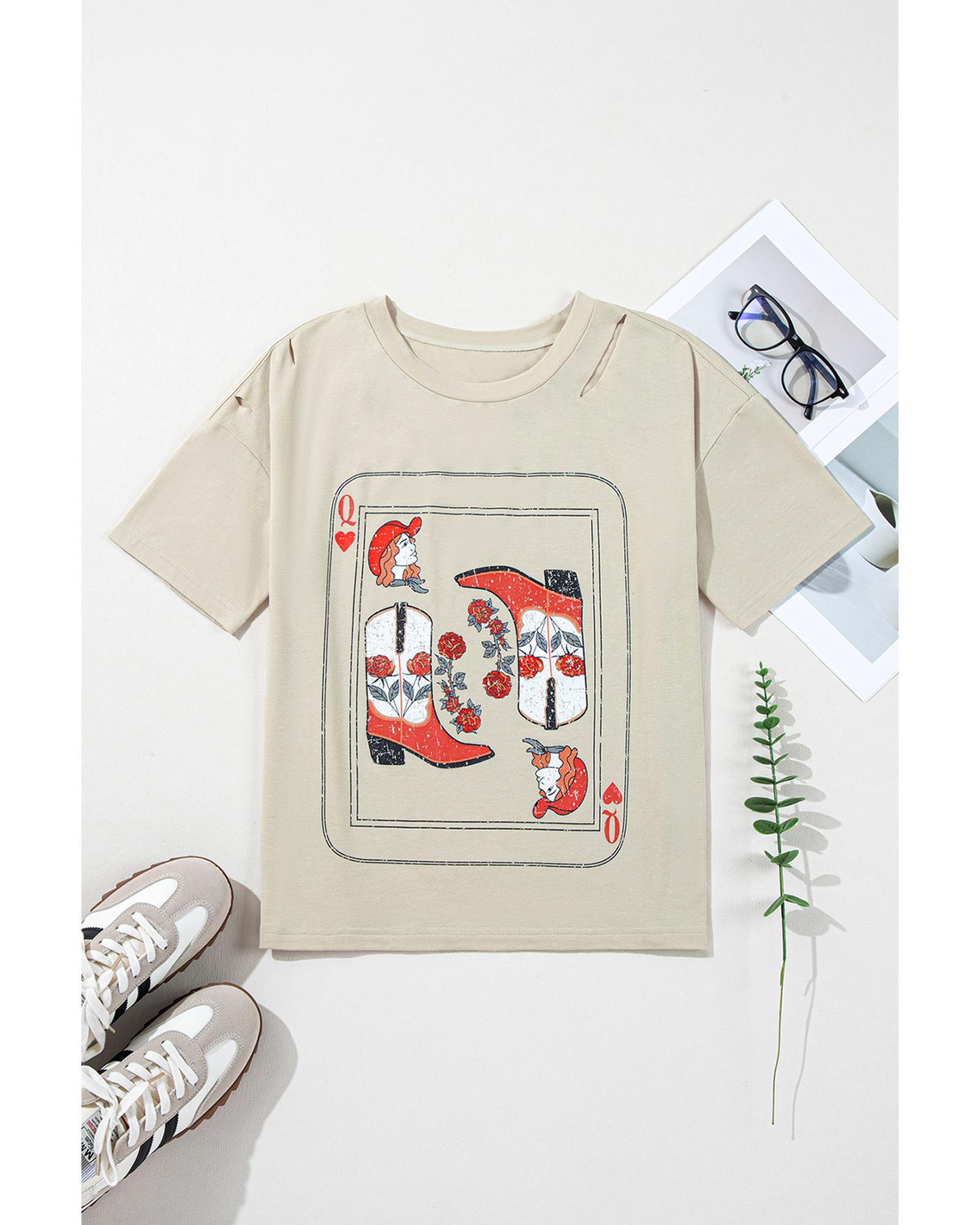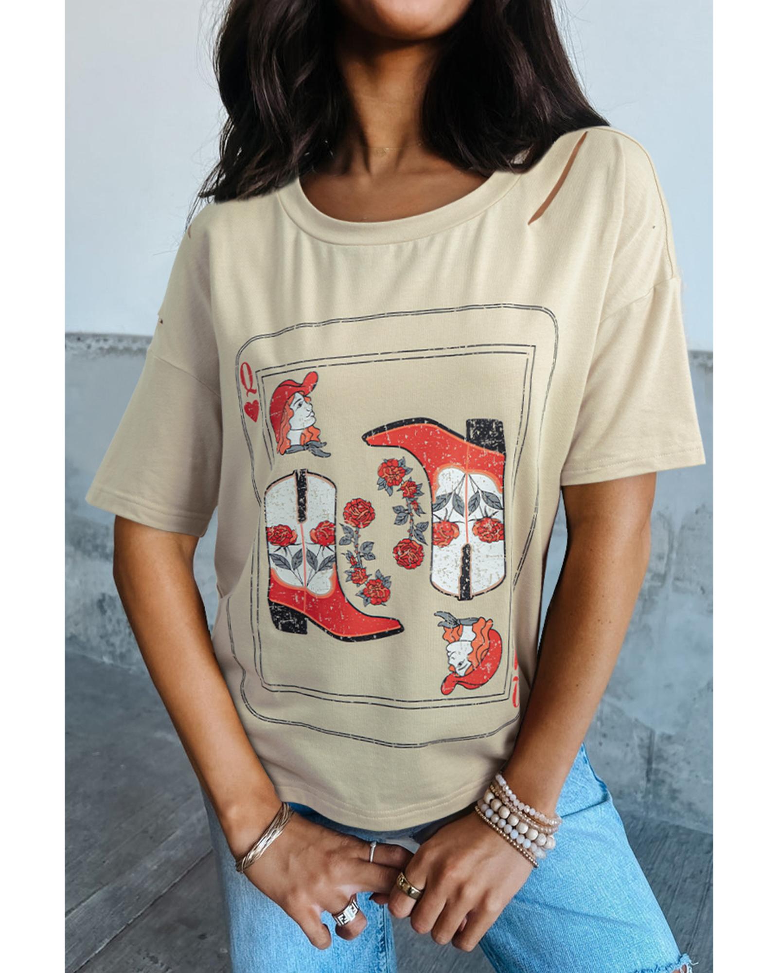 - Distinctive cowgirl playing card graphic with a vintage distressed round neckline