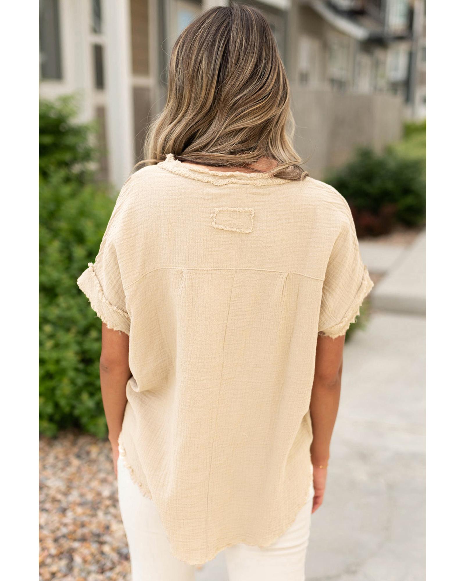 - Casual short sleeve top with textured crinkled fabric and frayed trim