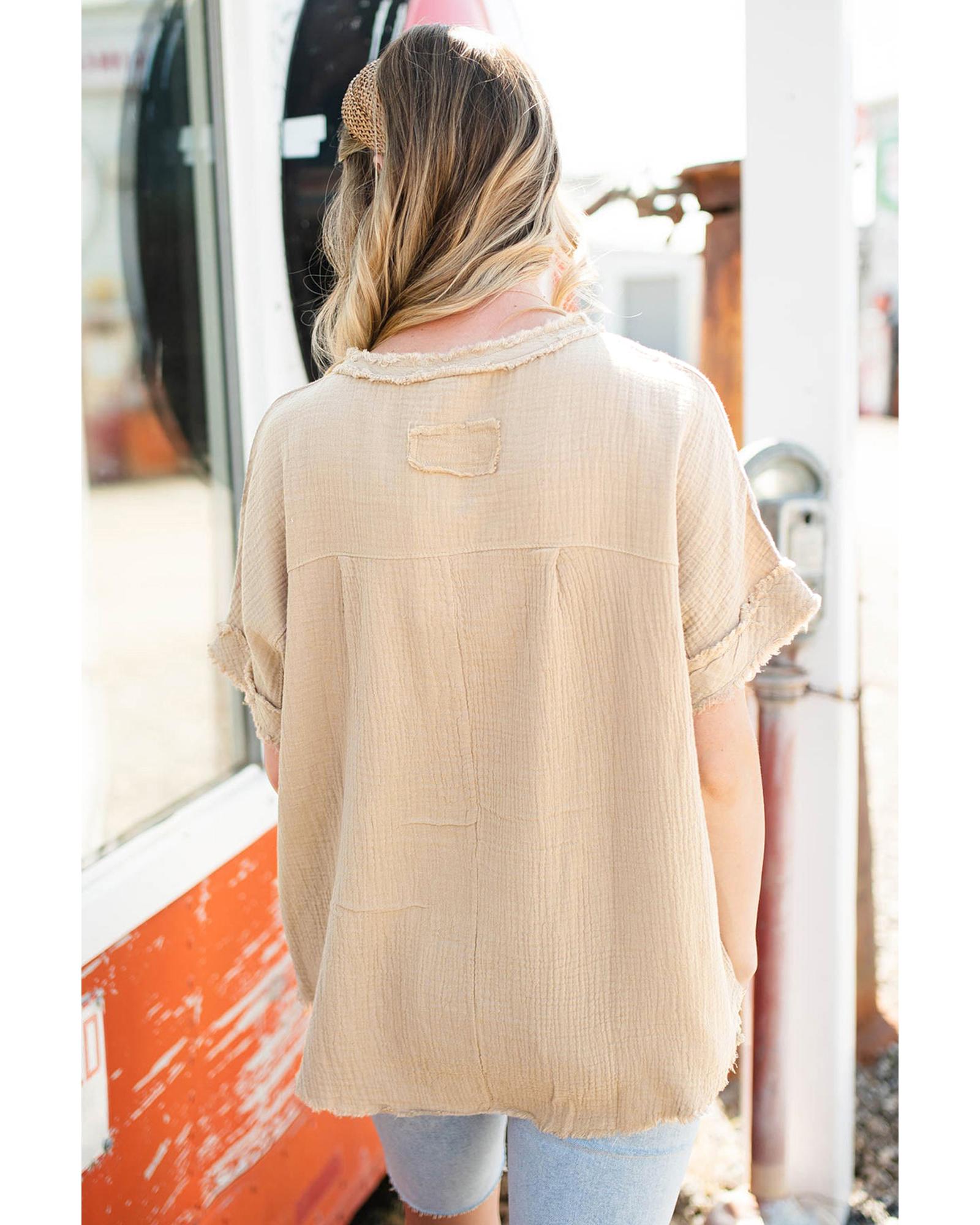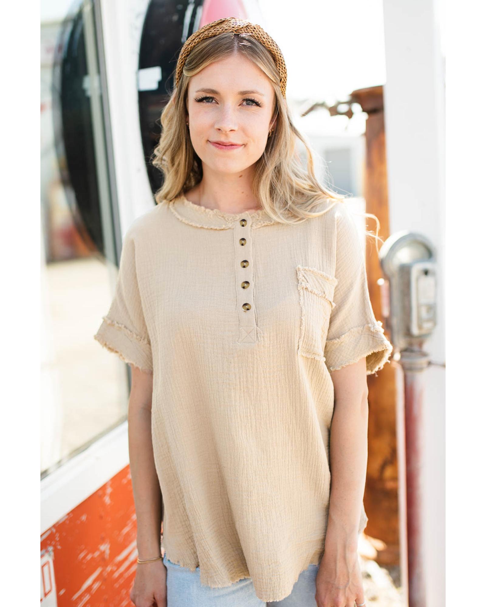 Parchment Crinkle Textured Frayed Trim Half Button Short Sleeve Top – M