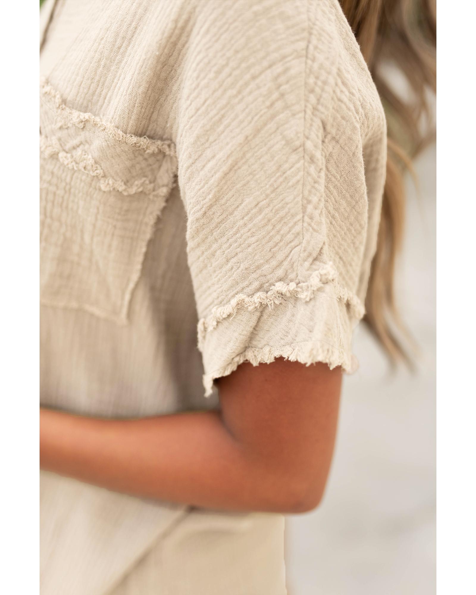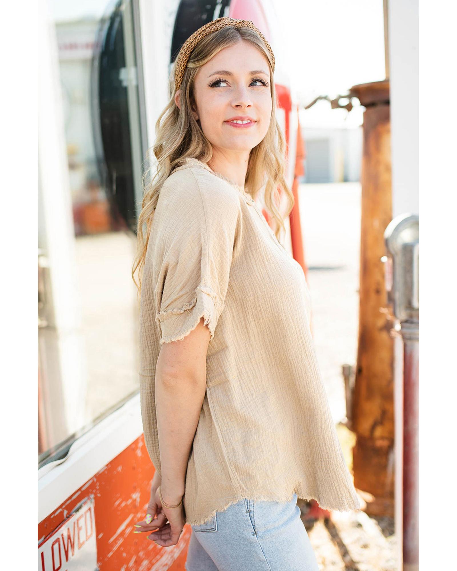 - Casual short sleeve top with textured crinkled fabric and frayed trim