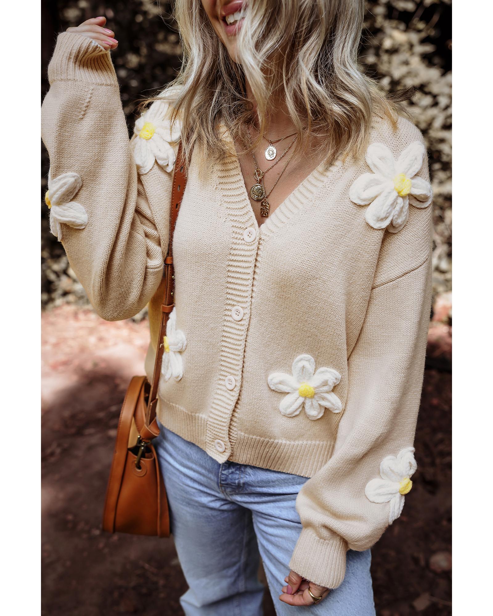 This elegant flower decor button front cardigan combines style and comfort with a trendy fitted design. Crafted from a soft knitted fabric, it offers warmth and a sophisticated appearance suitable for various occasions.