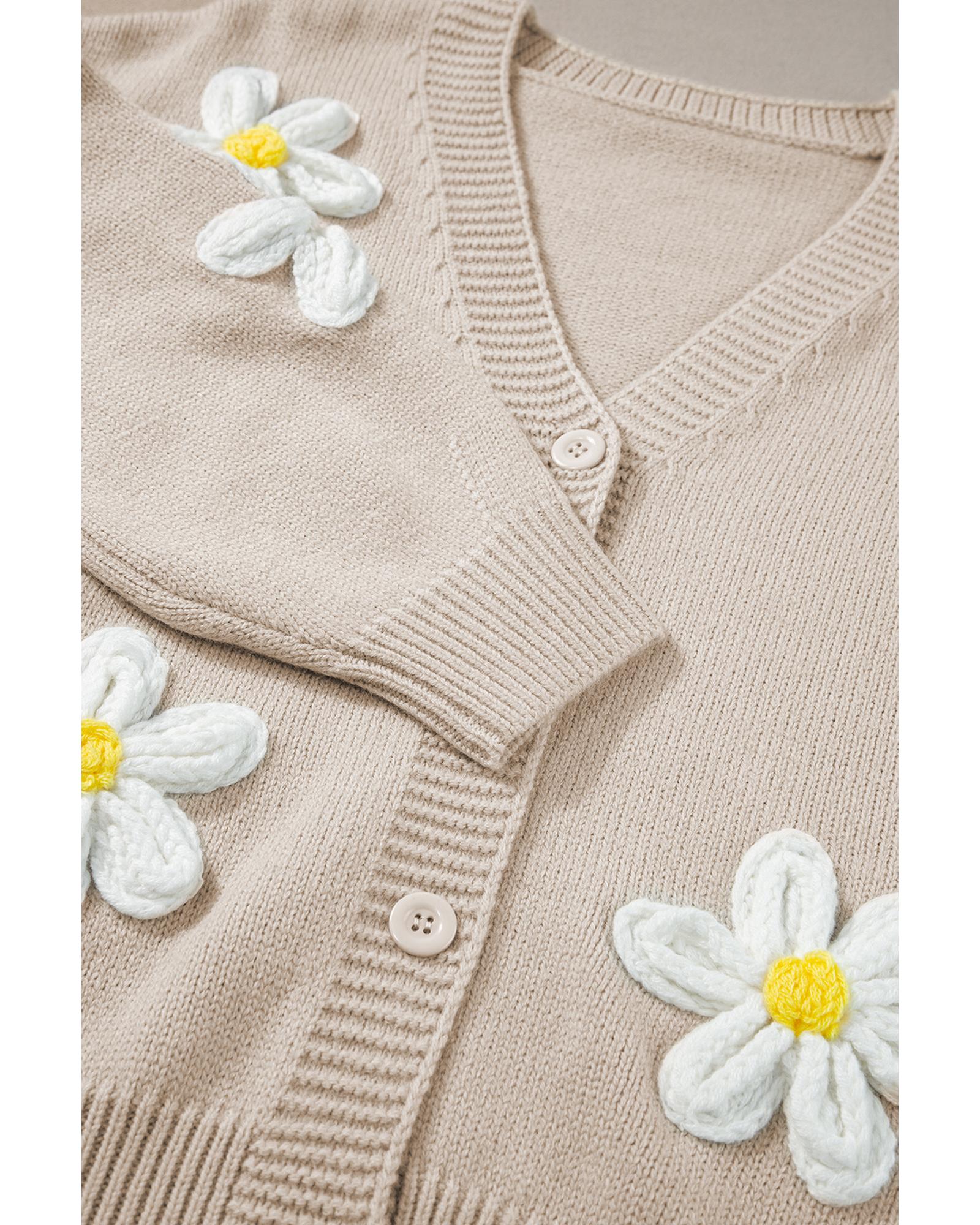 This elegant flower decor button front cardigan combines style and comfort, making it a versatile addition to any wardrobe. Designed with a trendy fitted look, it features intricate floral patterns and a relaxed drop shoulder design for a sophisticated yet casual appearance. Crafted from a soft knitted fabric, it provides warmth and comfort suitable for various occasions.