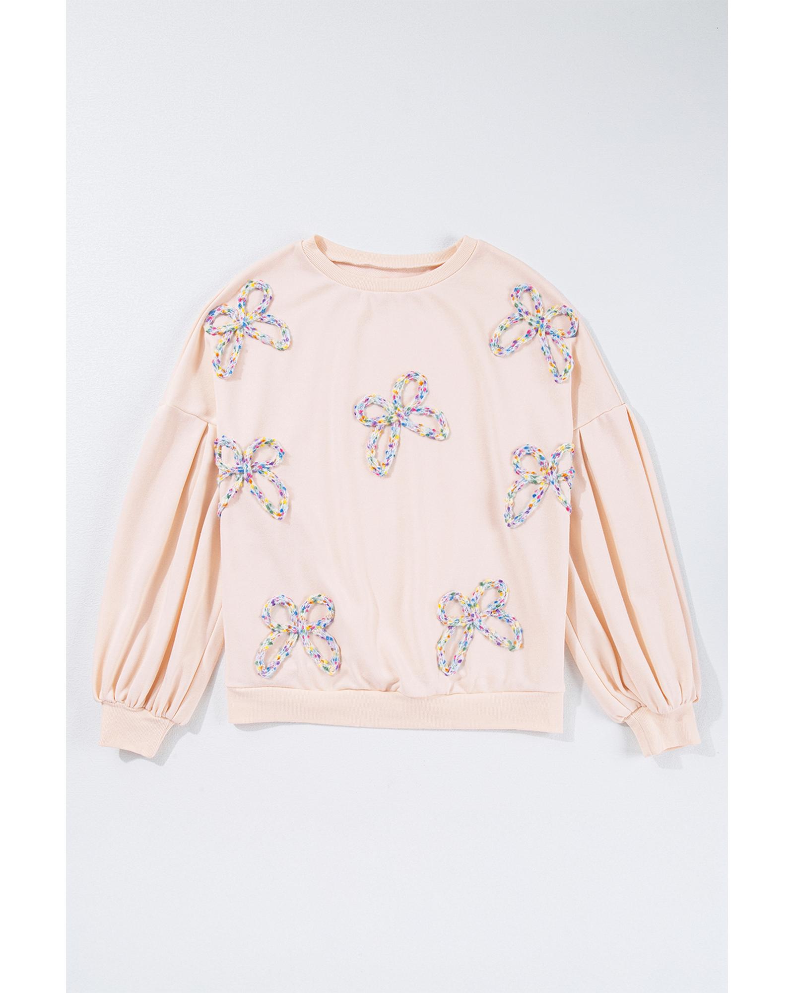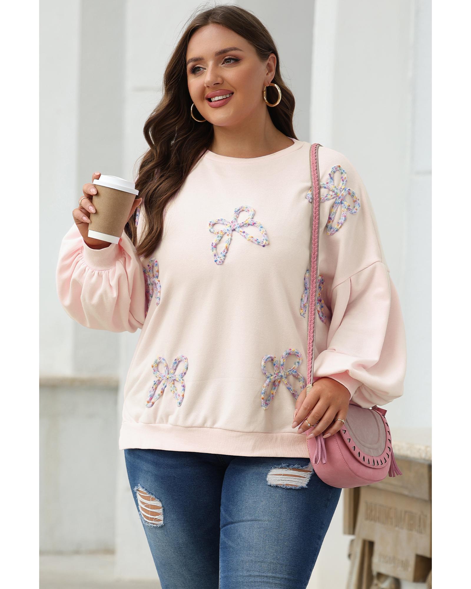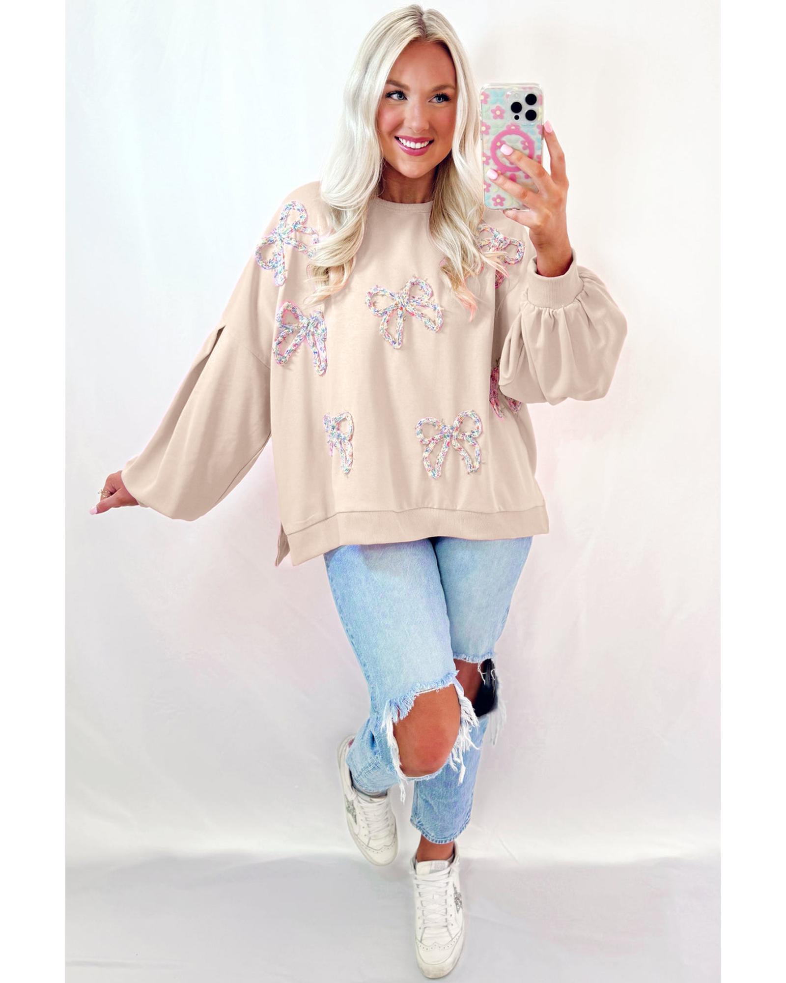 This oversized pullover sweatshirt features a stylish embroidered bow design and lantern sleeves, offering a trendy and feminine look. Its relaxed fit makes it suitable for everyday wear, pairing well with jeans or denim shorts for a casual yet chic outfit.