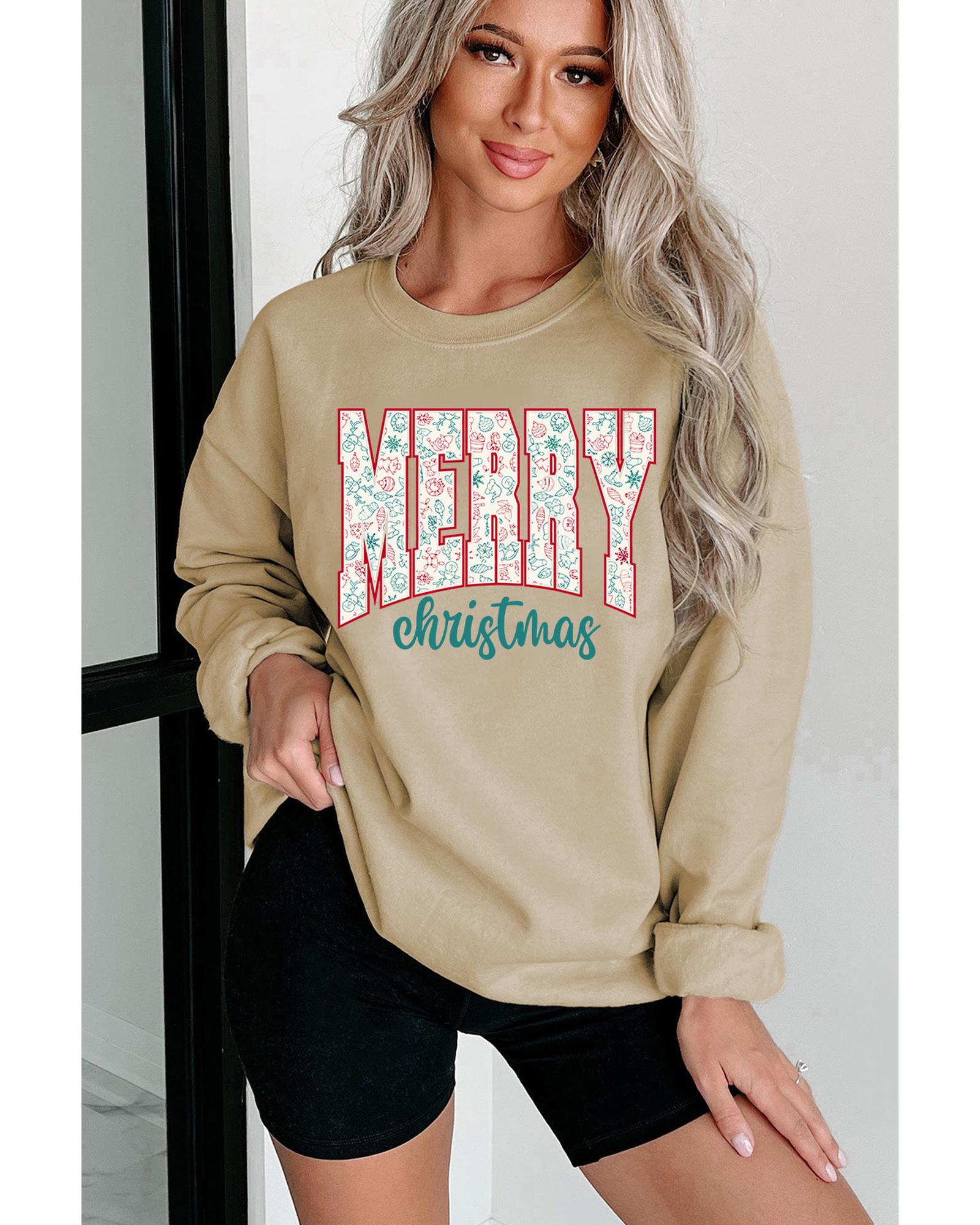 - Festive sweatshirt with a Merry Christmas graphic and seasonal decorative elements such as an elk or Christmas tree.