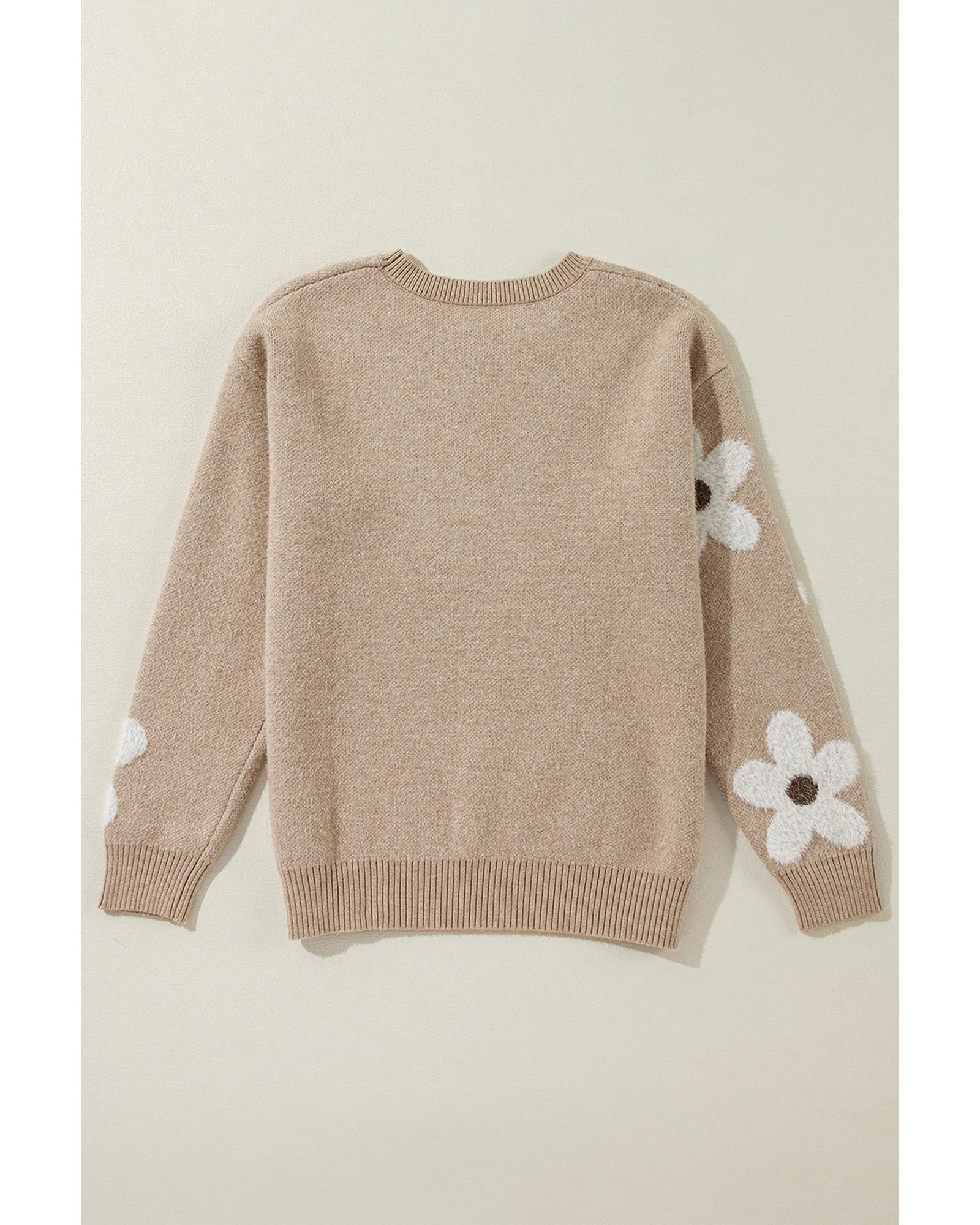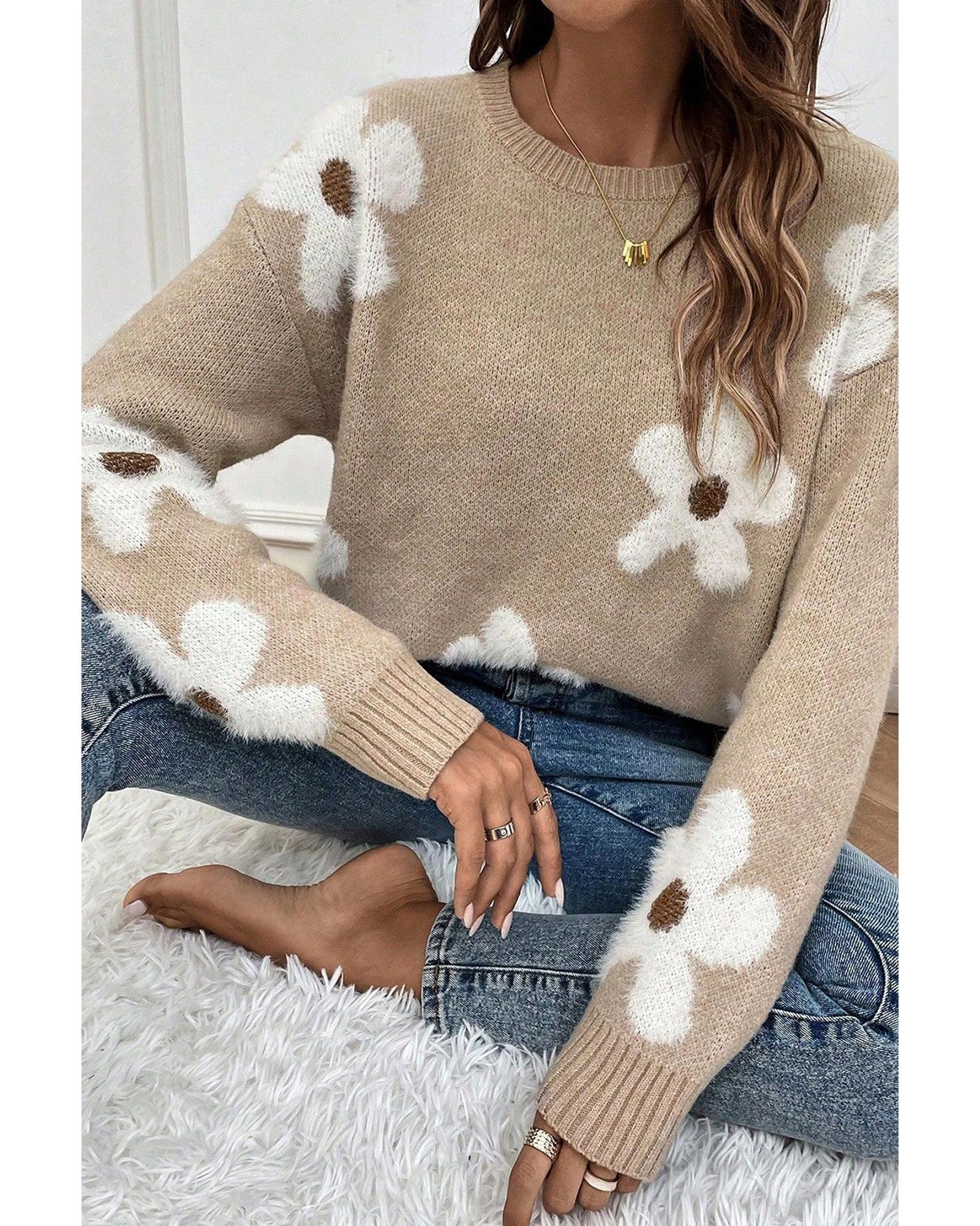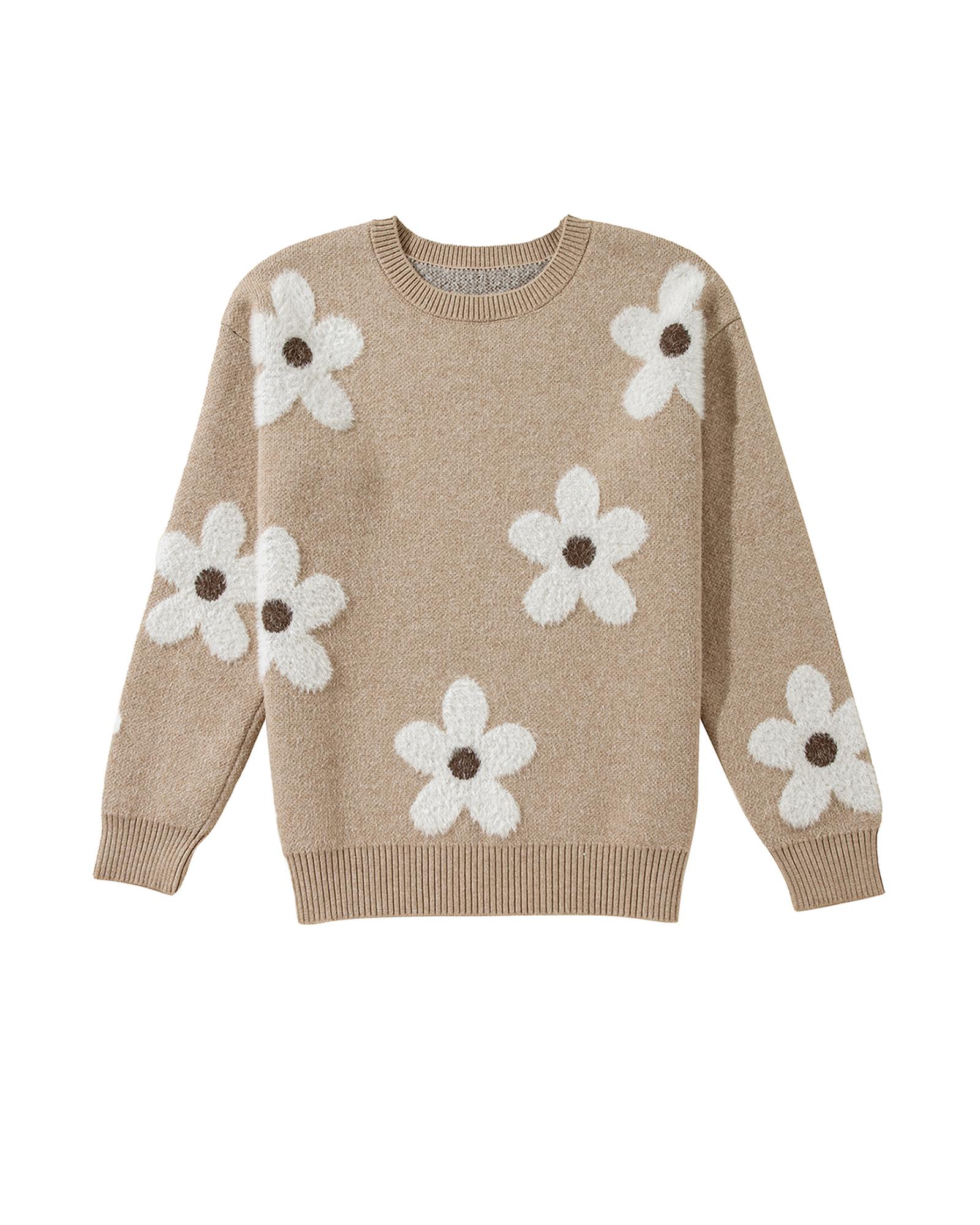 This sweater features a stylish flower pattern with a ribbed trim design, offering a trendy and fitted look. It is made with high elasticity material, ensuring comfort and flexibility. The classic crew neck and long sleeves make it suitable for various occasions, combining delicate cuttings with an attractive appearance.