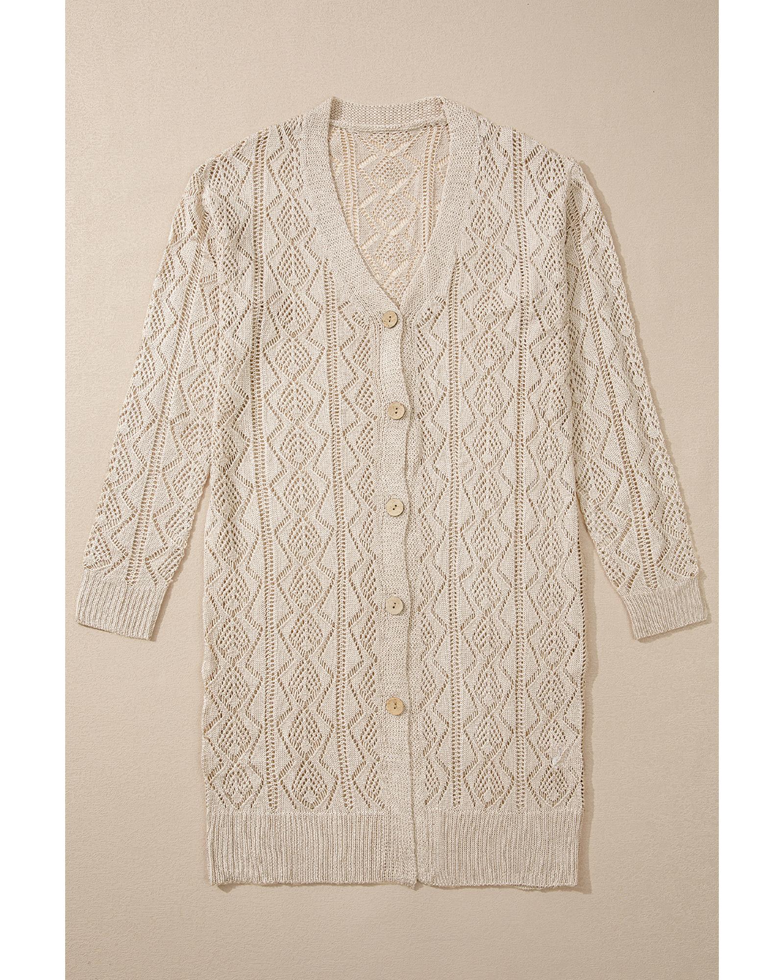 This long cardigan features a stylish hollow-out design with a classic V-neck and button-up front closure. Its tunic length offers a flattering silhouette, making it a versatile addition to your wardrobe for cooler weather.