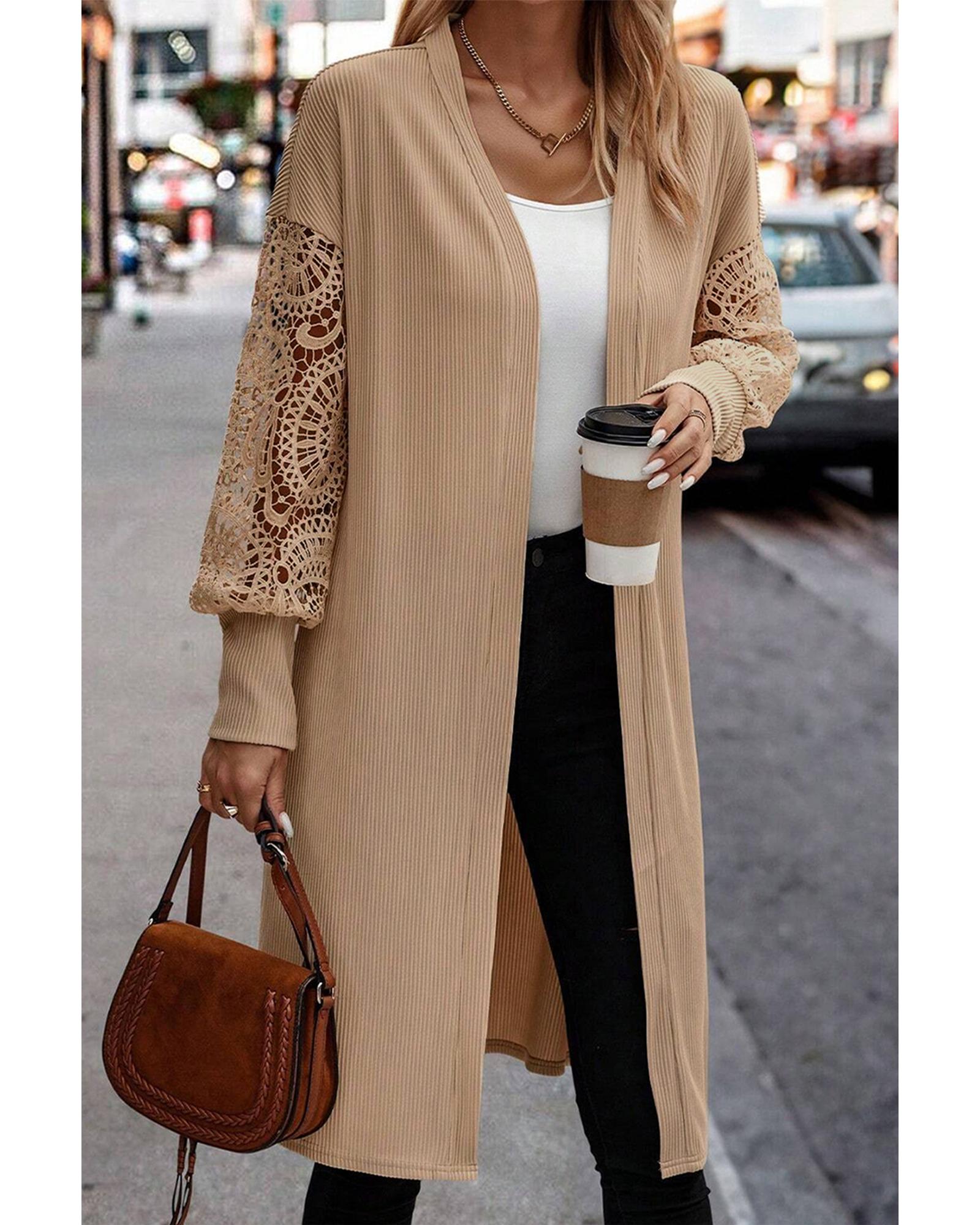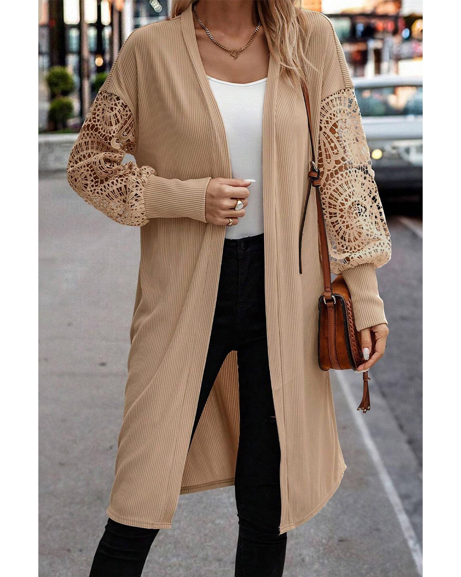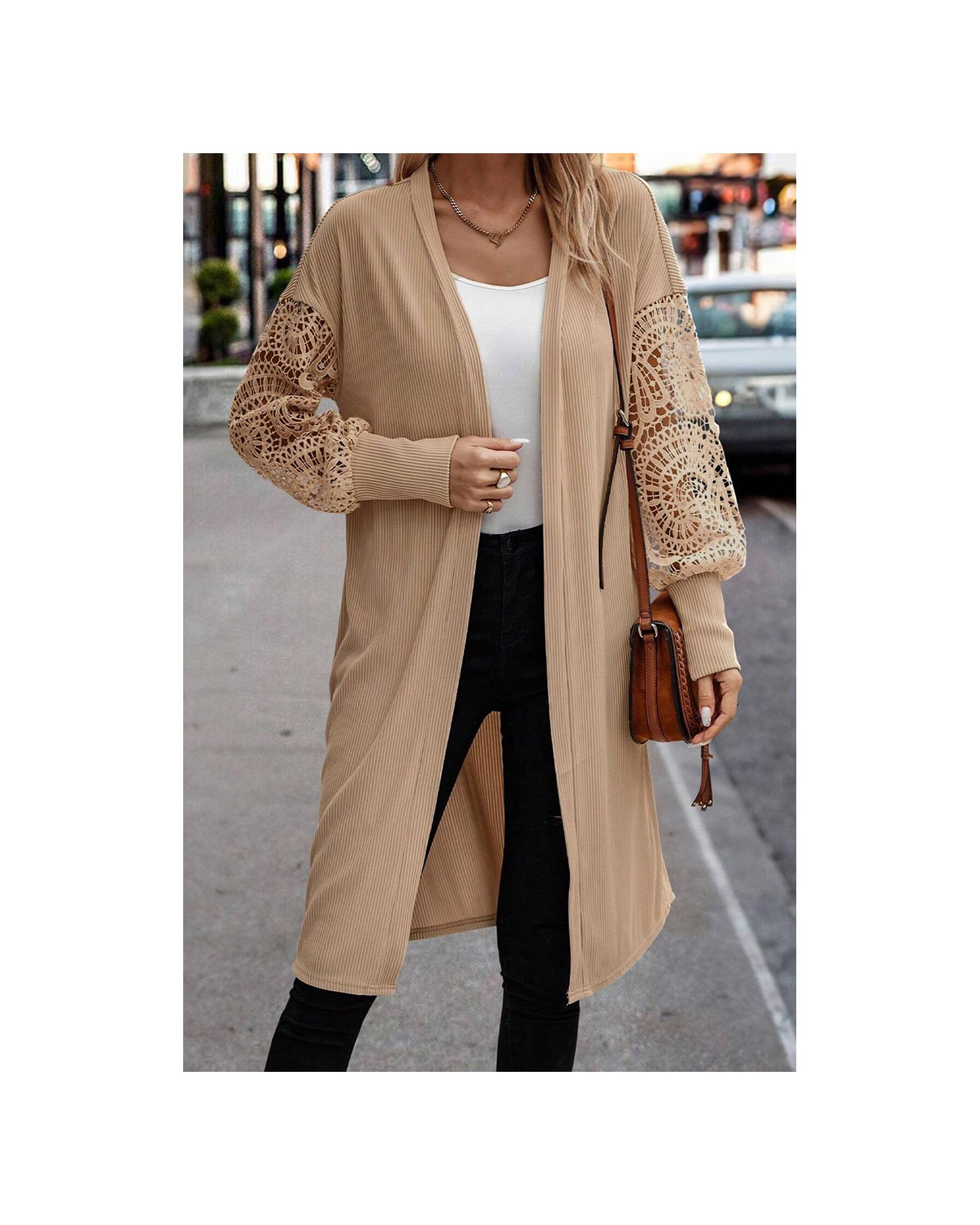 This open front duster cardigan features a ribbed knit fabric with delicate lace patchwork details, offering a feminine and elegant layering piece. Its versatile design makes it suitable for various outfits and occasions, providing both style and comfort.