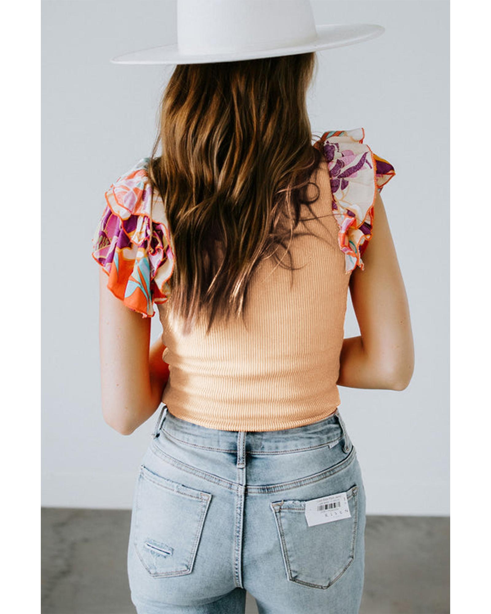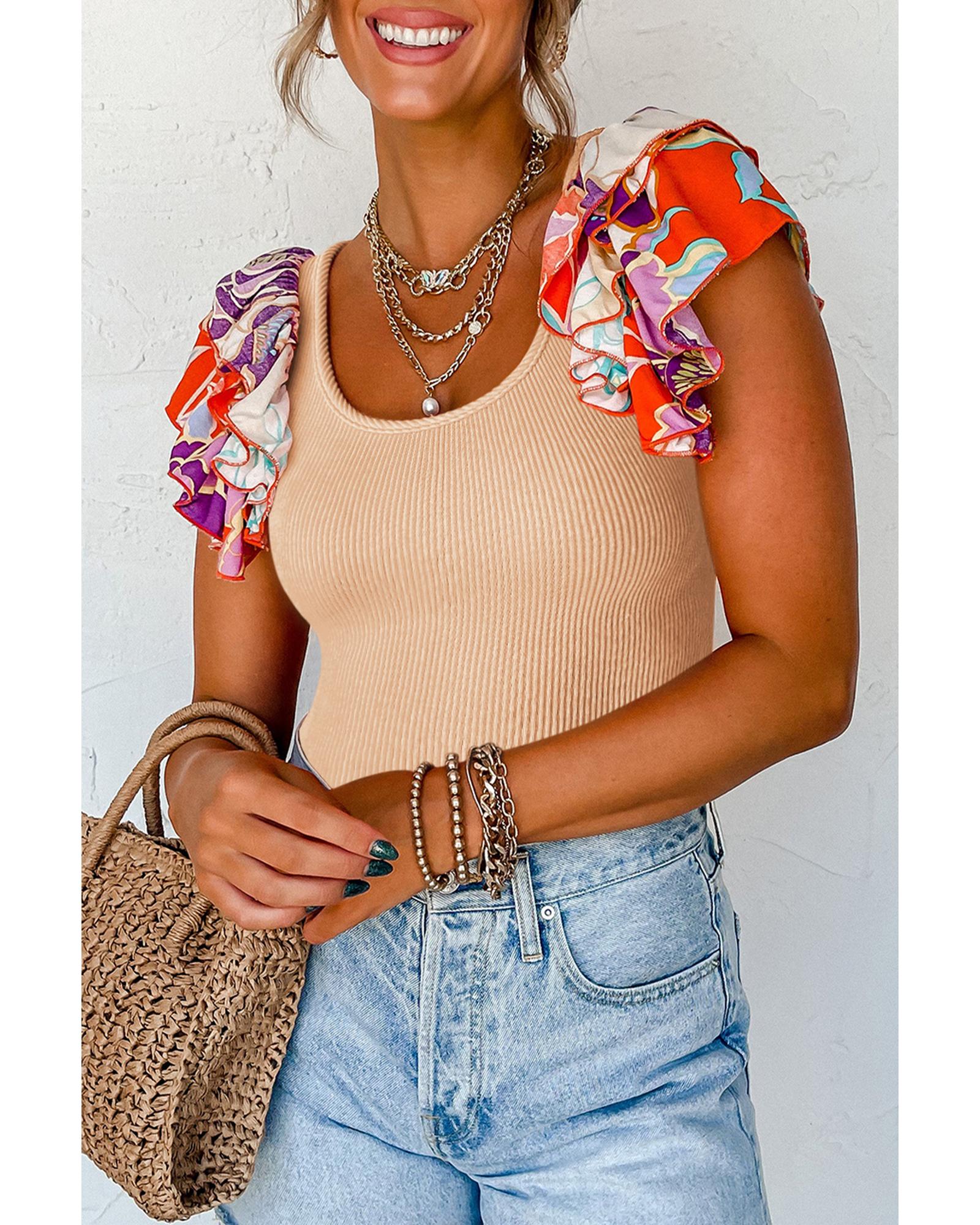 This bodysuit features a trendy fitted design with a ribbed knit texture and tiered ruffled sleeves, offering a feminine and stylish look. Made from a soft and breathable fabric blend, it provides a flattering fit that accentuates curves. The sleek silhouette makes it suitable for layering or wearing alone, with a secure snap closure at the bottom for easy wear.