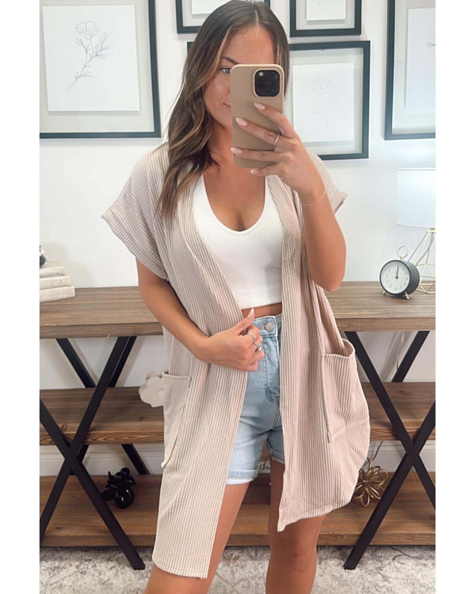 This ribbed pocketed short sleeve open front top features a delicate open kimono style with a ribbed texture, offering a trendy fitted look. Its chic short sleeves and flattering curved hem make it a versatile addition to your wardrobe, perfect for pairing with tank tops and jeans for a stylish appearance. The top includes convenient pockets for added functionality, combining style and practicality effortlessly.