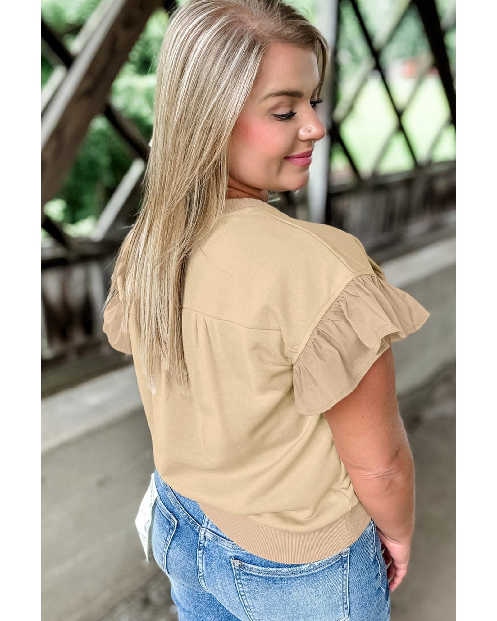 Parchment Ruffled Short Sleeve Bowknot Applique Crew Neck Plus Size Top – 1X