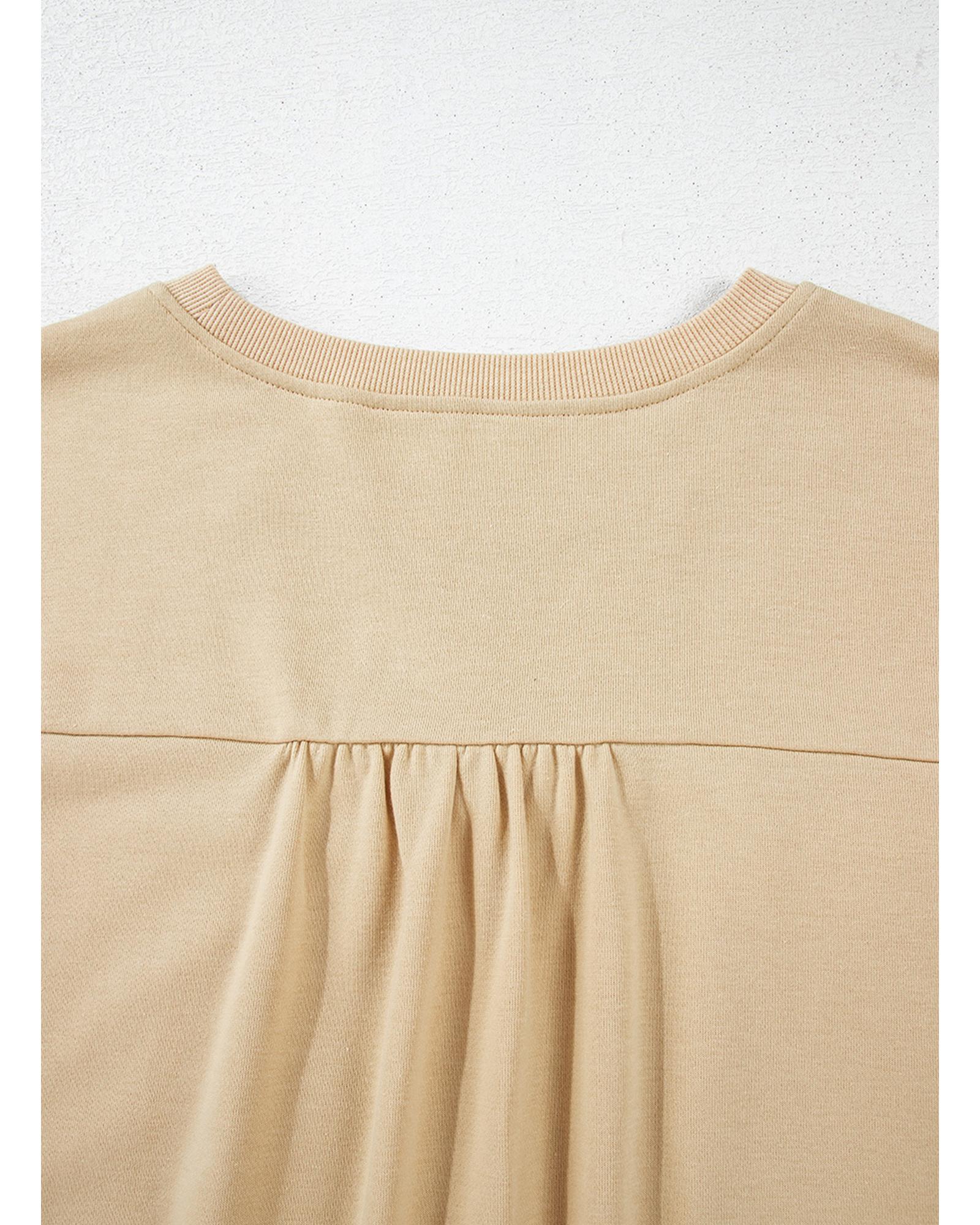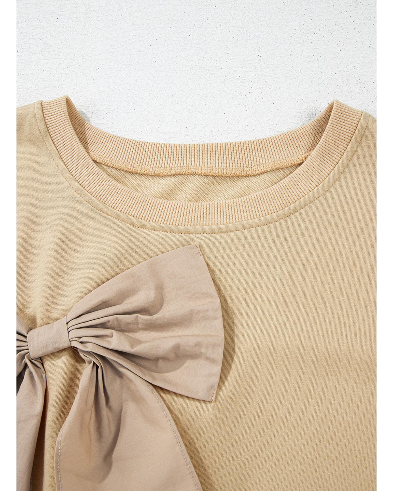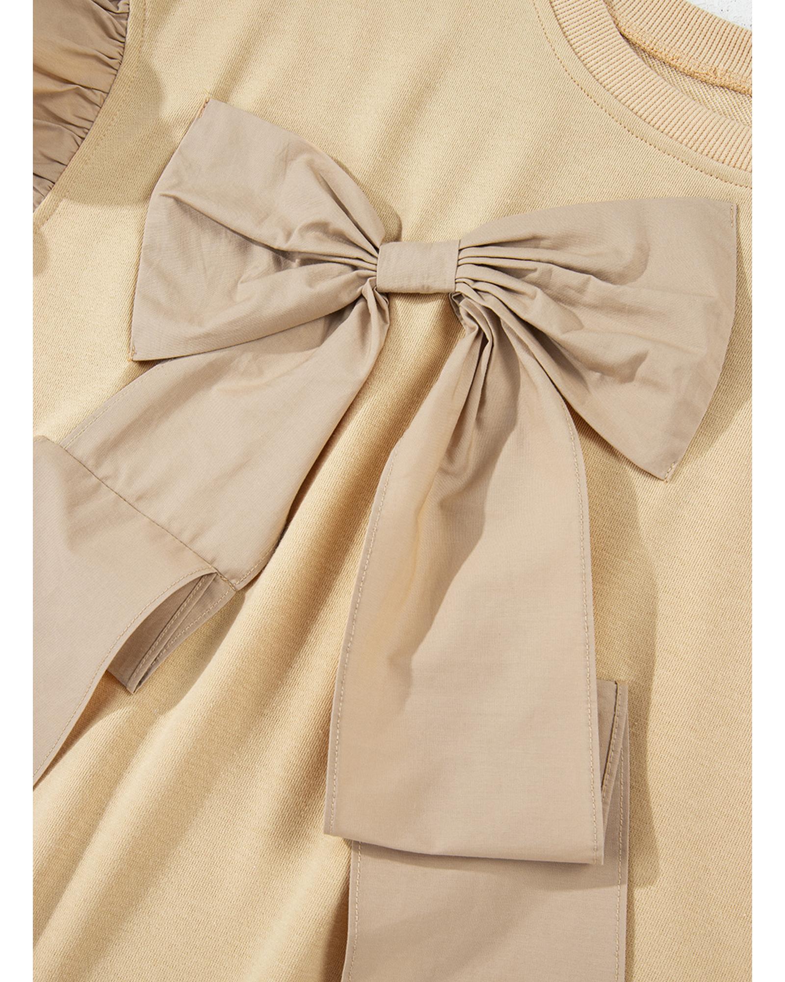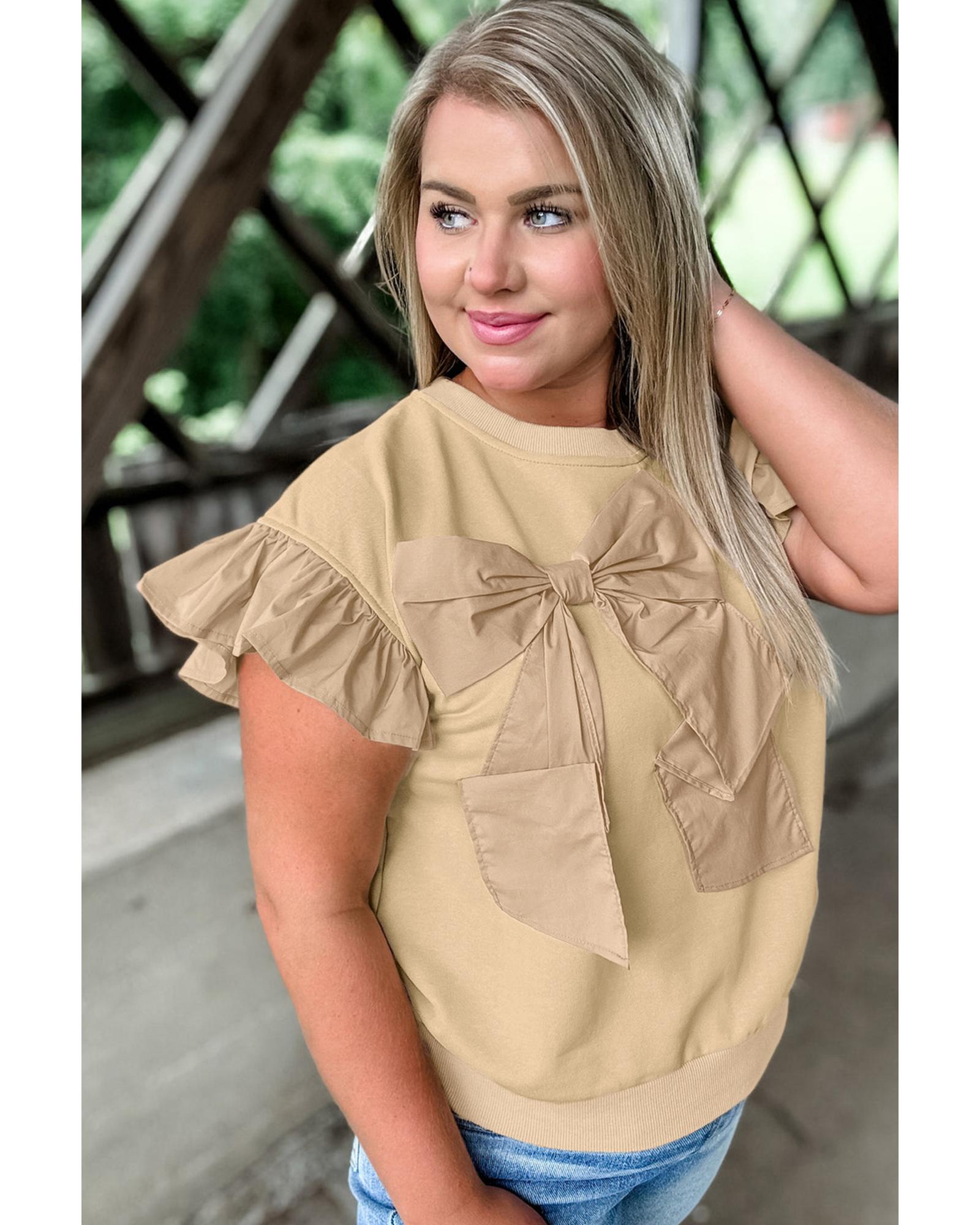 This plus size top features a stylish and feminine design with ruffled details and a sweet bowknot applique. It is made from a comfortable fabric blend and is suitable for various casual occasions. The solid color makes it easy to pair with different outfits, offering both style and comfort.