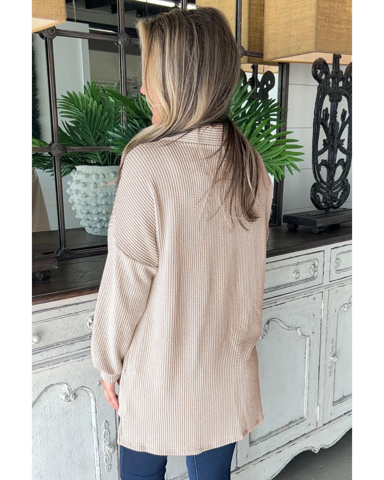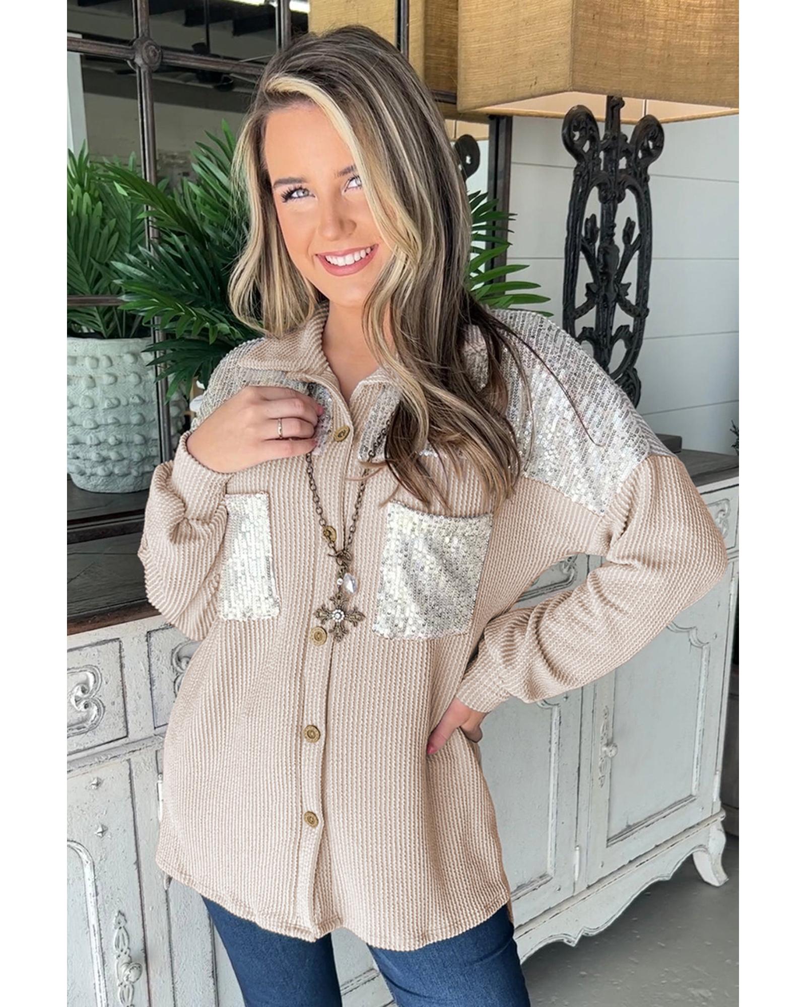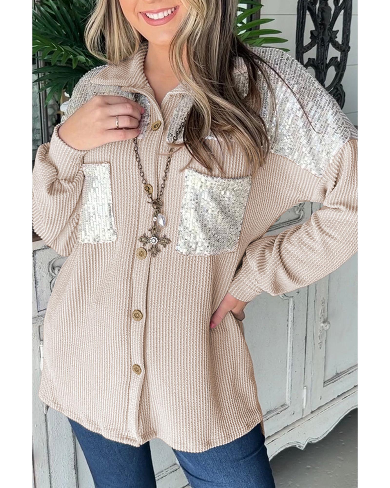 This shacket features a trendy fitted design that combines style and comfort, making it a versatile addition to casual women’s outerwear. The sequin patch adds a touch of sparkle, while the chest pocket enhances its fashionable appearance. Crafted from corded fabric, it offers both coziness and durability.