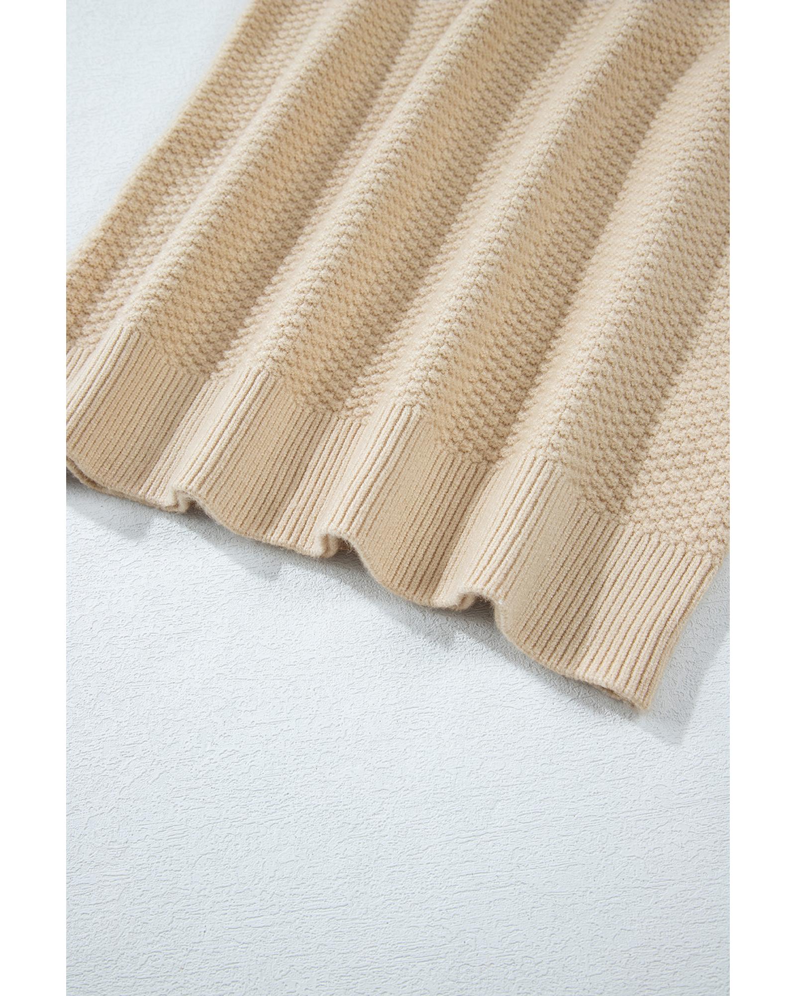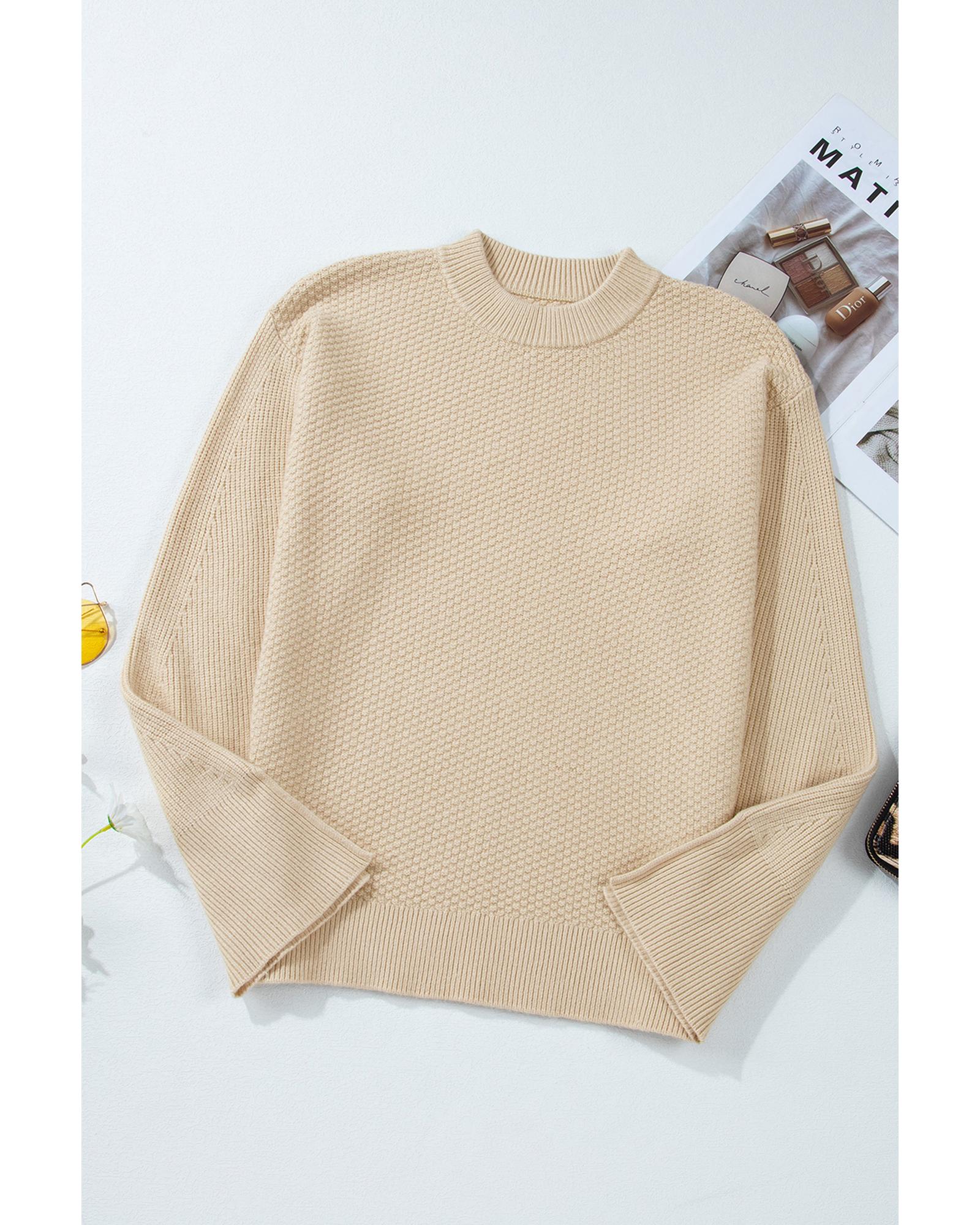 This loose sweater features a textured knit design with a relaxed fit, drop shoulder style, and slit cuffs for added elegance. Made from a soft and comfortable blend of materials, it offers a trendy and cozy look suitable for layering.