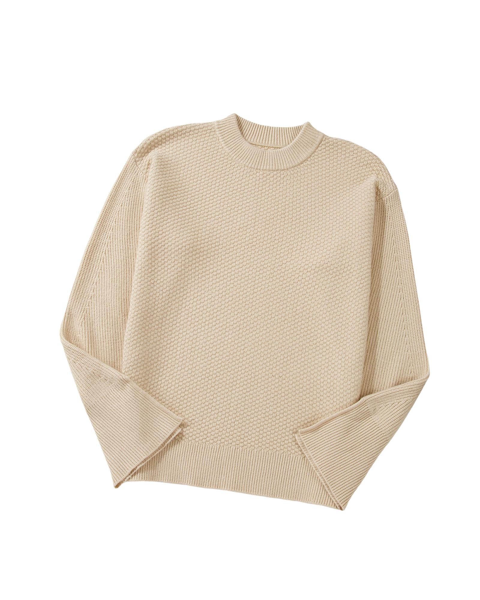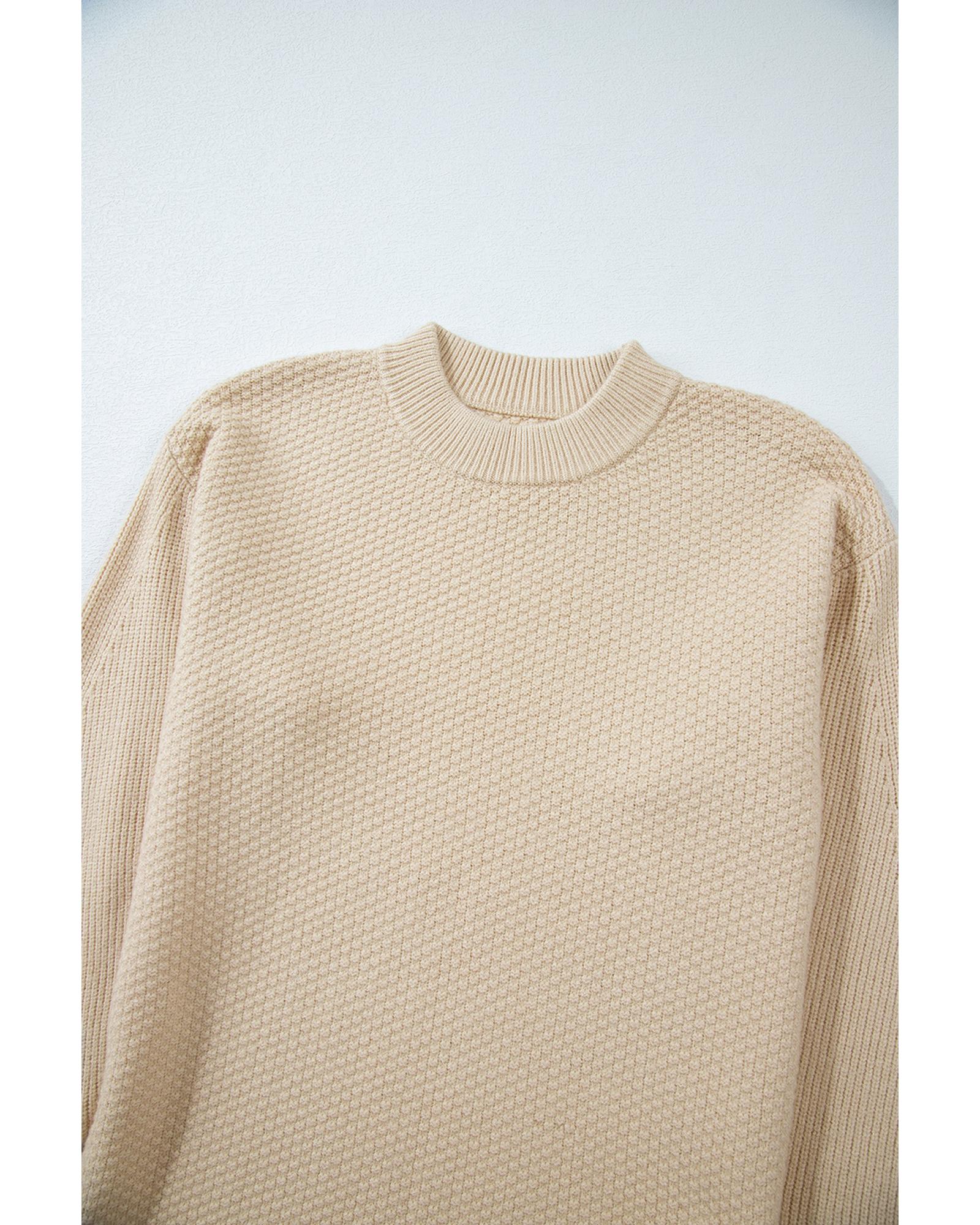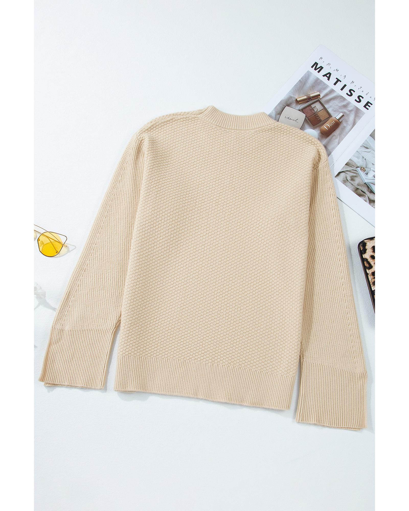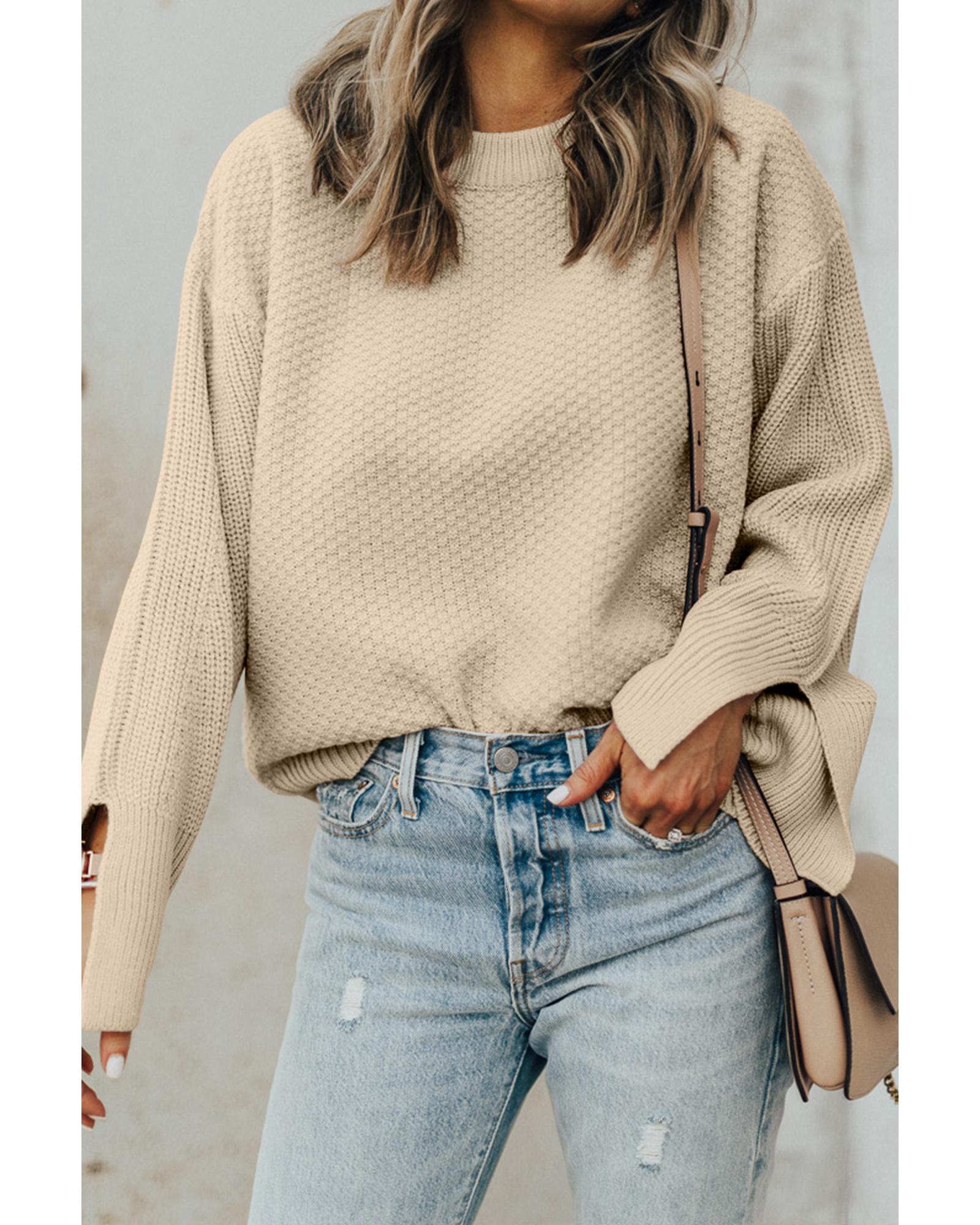 This sweater features a textured knit design with a relaxed fit, drop shoulder style, and slit cuffs for added elegance. Made from a soft and comfortable blend of materials, it offers a trendy and cozy look suitable for layering.