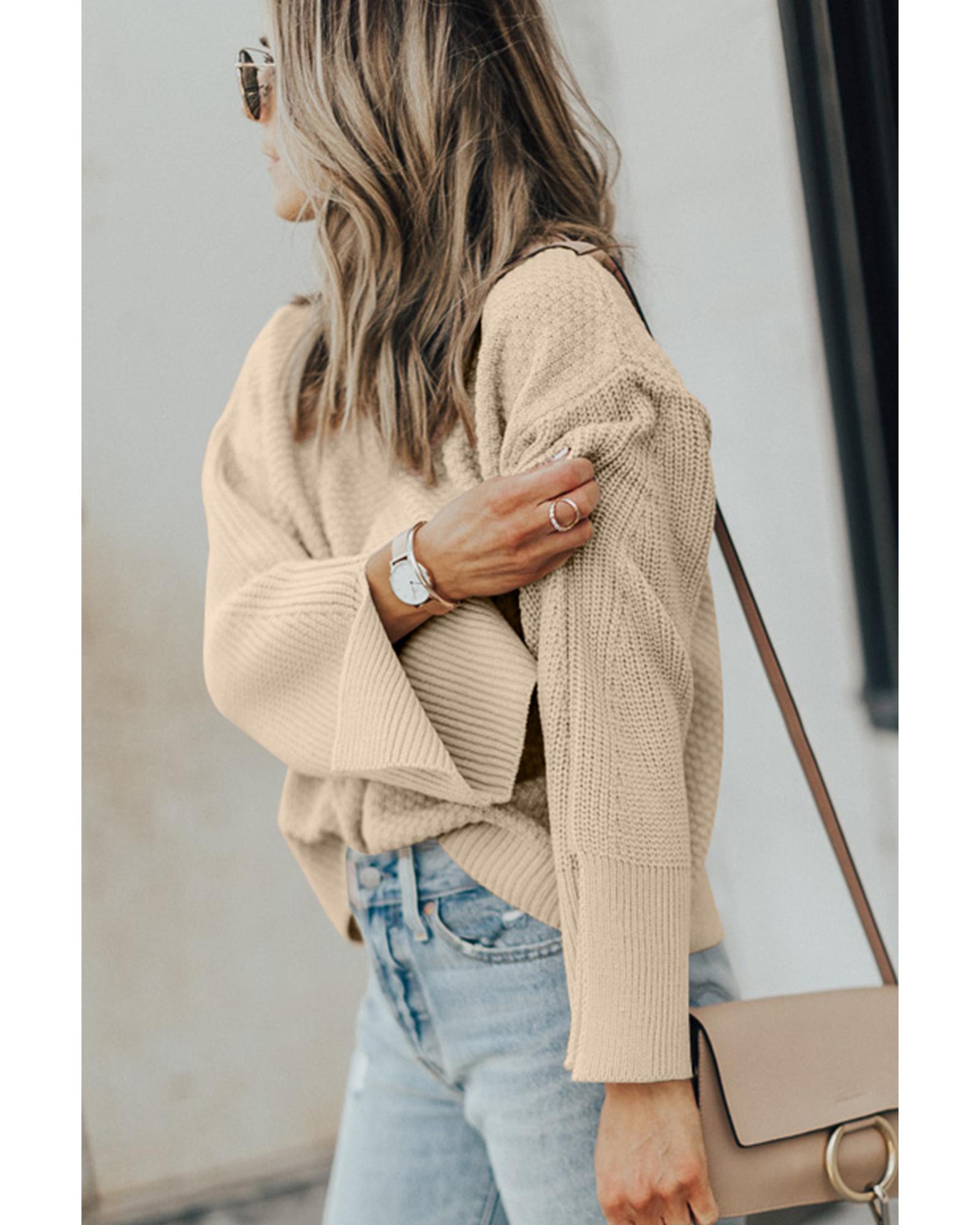 This loose-fitting sweater features a textured knit design with a relaxed drop shoulder silhouette, offering both comfort and style. Its split cuffs add a touch of elegance, making it suitable for casual and layered looks.