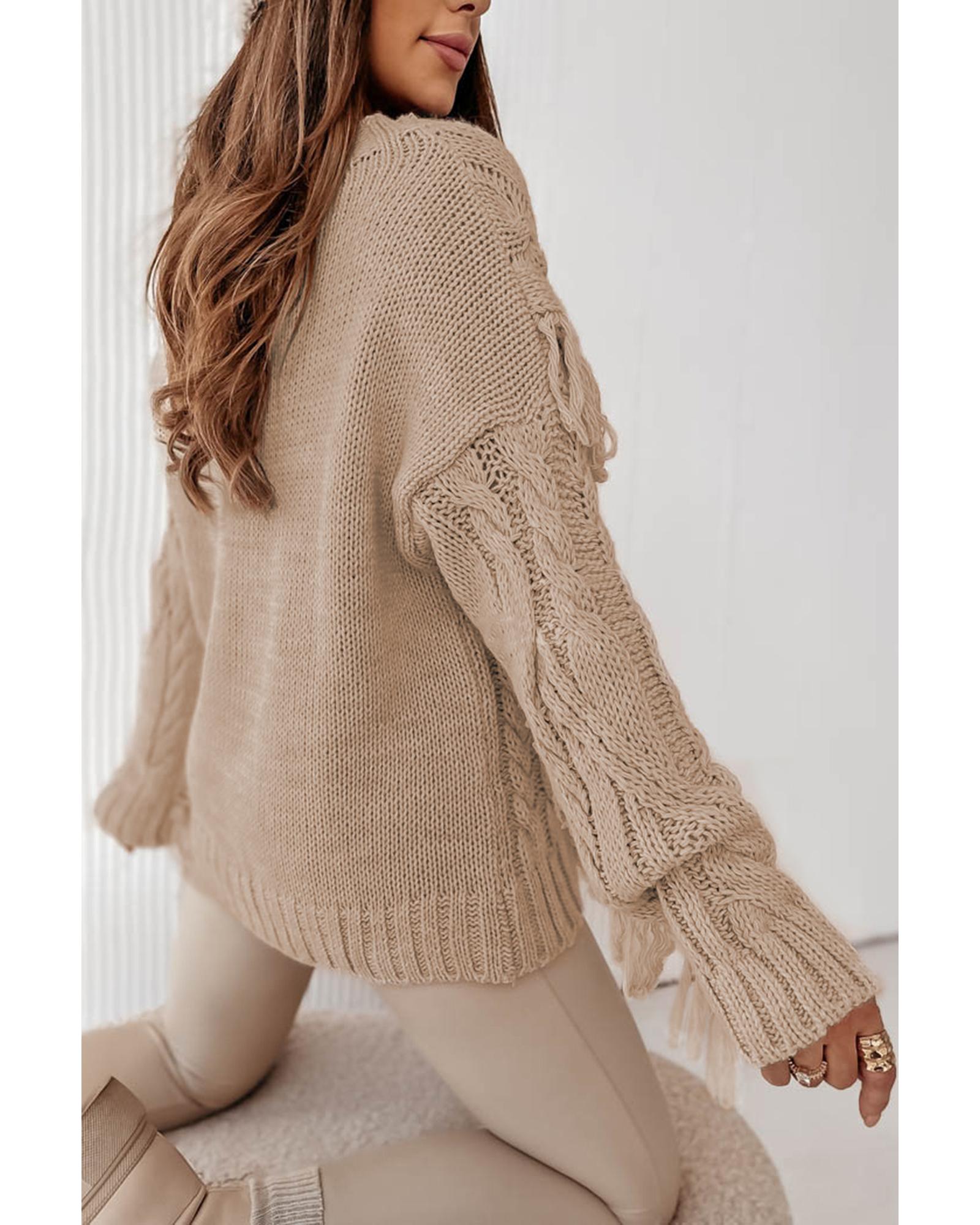 This Parchment Tasseled Braided Knit Sweater features a trendy fitted design with a neutral aesthetic suitable for various occasions. Crafted from soft, high-quality materials, it combines comfort with style, making it a versatile addition to any wardrobe.