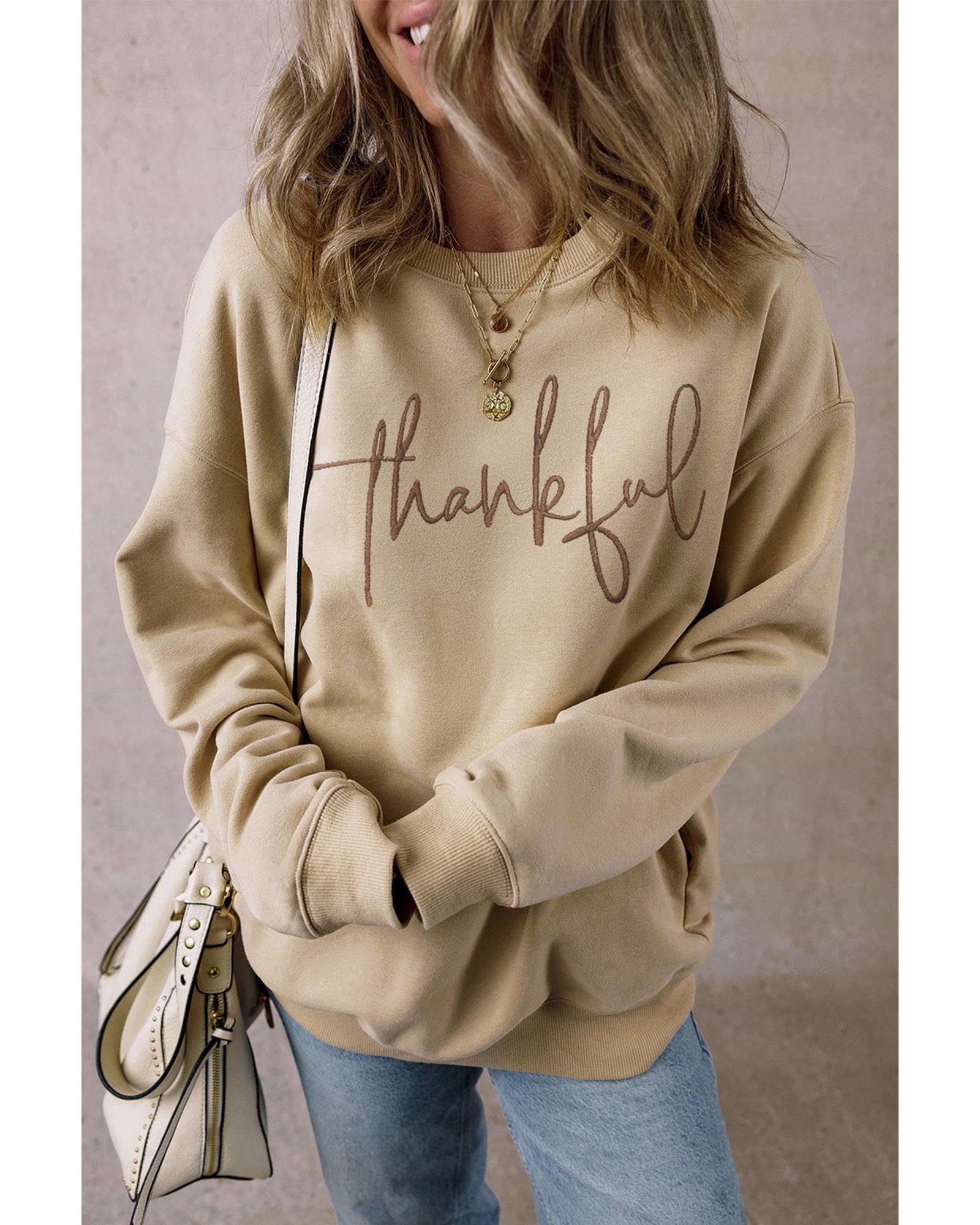 This embroidered drop shoulder pullover sweatshirt features a simple yet stylish design, perfect for expressing gratitude and suitable for casual wear. Its comfortable fit and trendy look make it an ideal choice for various occasions, especially during festive seasons.