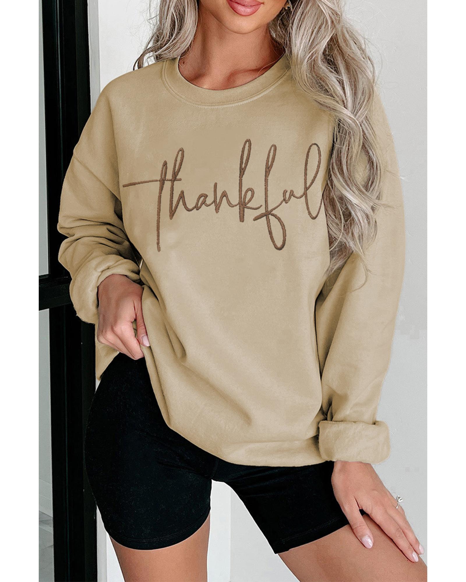 This embroidered drop shoulder pullover sweatshirt features a simple yet stylish design, perfect for expressing gratitude and celebrating special occasions like Thanksgiving Day. Its relaxed fit and classic crew neck provide a laid-back look that pairs easily with jeans or leggings, making it a versatile addition to your wardrobe.