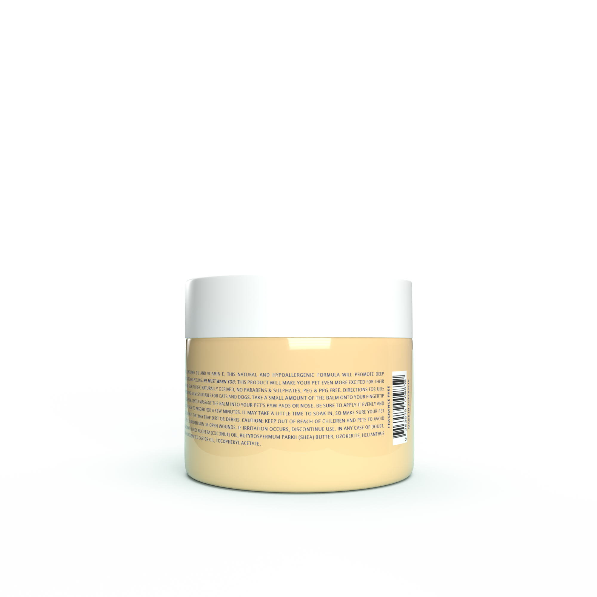 The package contains a hydrating balm suitable for pet use, designed to promote healthy, moisturized paws and noses. Keep out of reach of children and pets to prevent ingestion. Do not apply to broken skin or open wounds. Discontinue use if irritation occurs and consult a veterinarian if needed.