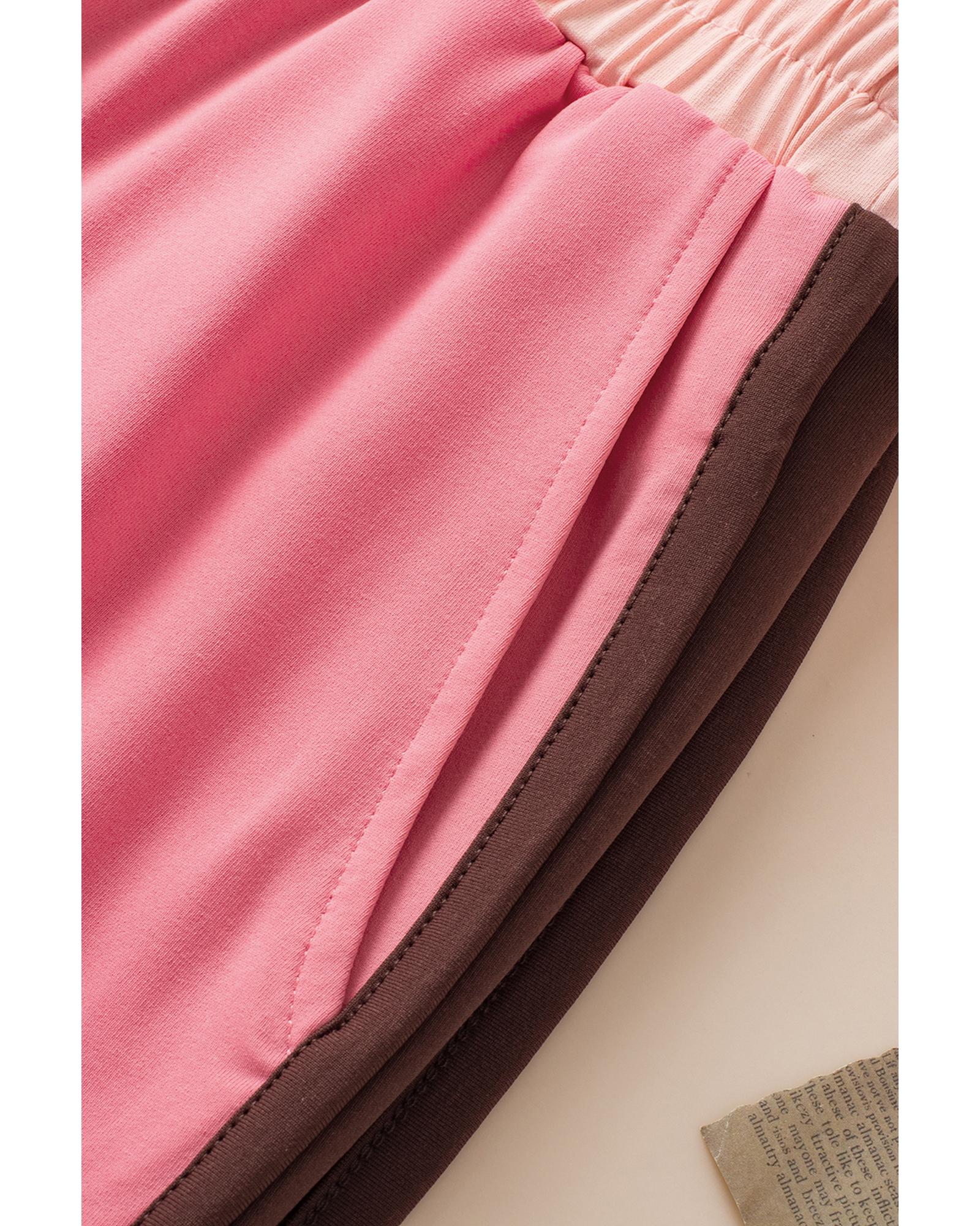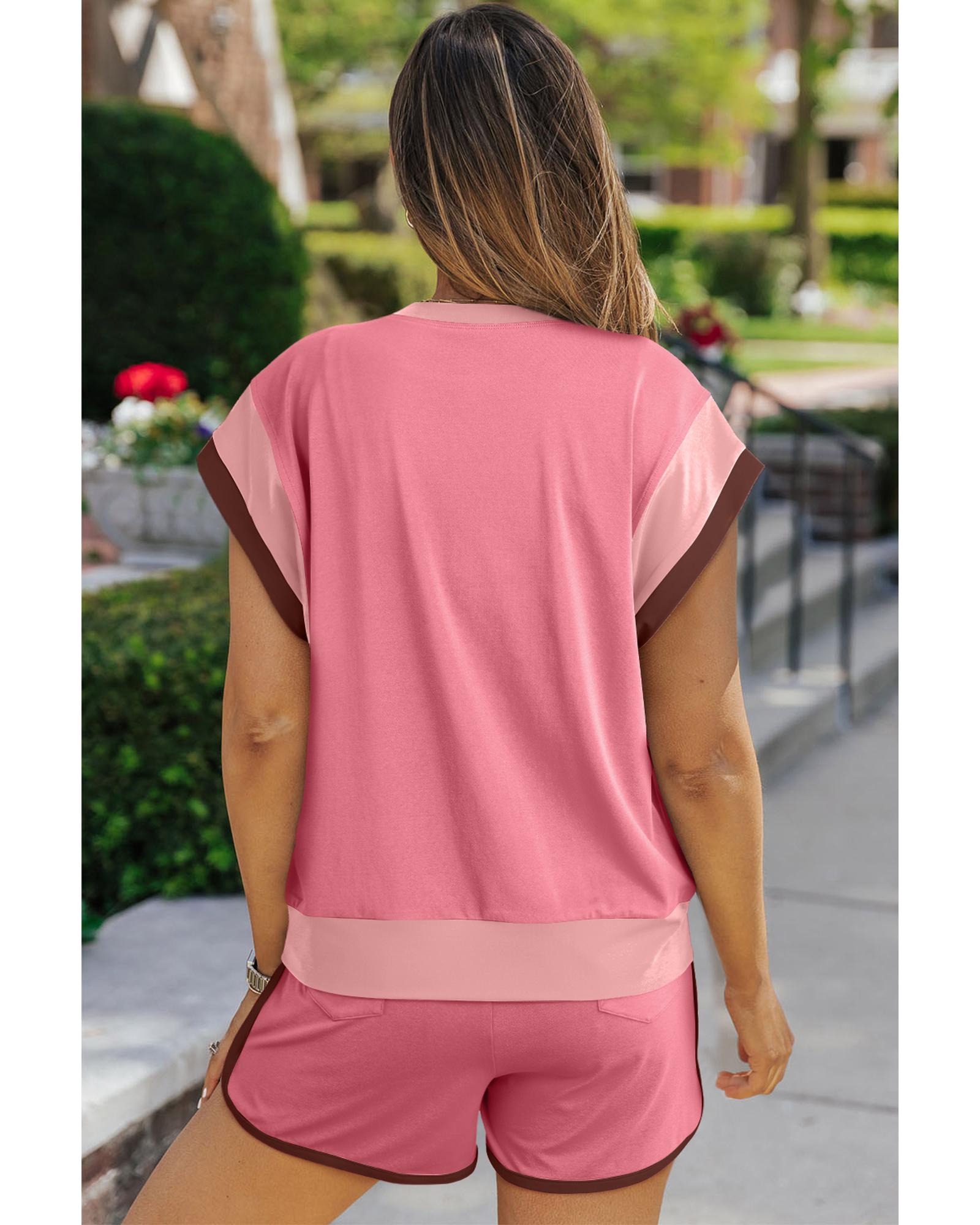 This stylish cap sleeve tee and shorts set features a trendy colorblock design with contrast trim, offering a fashionable and casual look suitable for daily wear. The relaxed fit ensures comfort for all-day wear, making it a versatile addition to your wardrobe.
