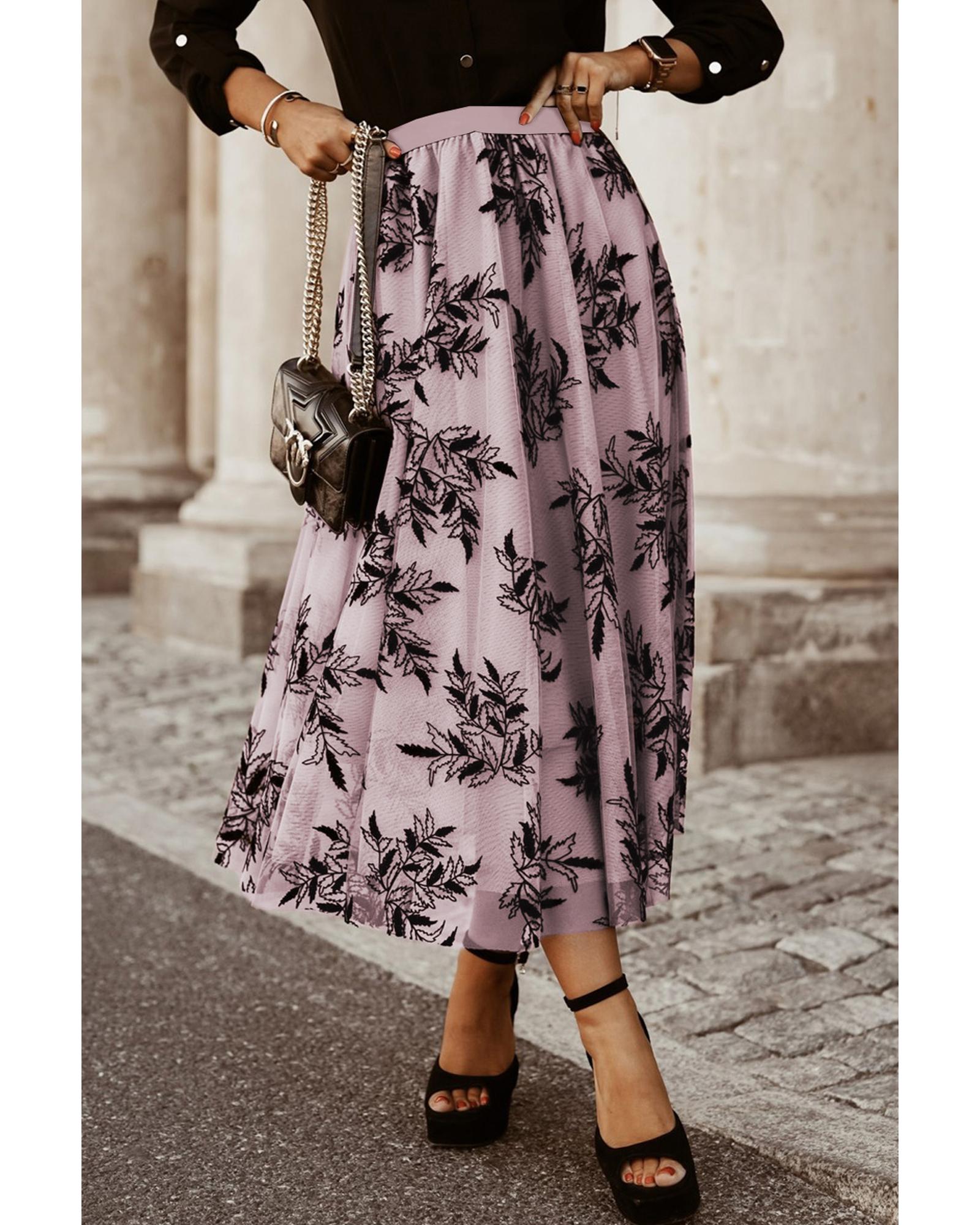 This high waist maxi skirt features elegant floral and leaf embroidery, creating a sophisticated and fashionable look. Its flowy design offers comfort and versatility, making it suitable for various daily occasions. The skirt’s high waist accentuates a slender waistline and pairs well with different tops and accessories for a stylish ensemble.
