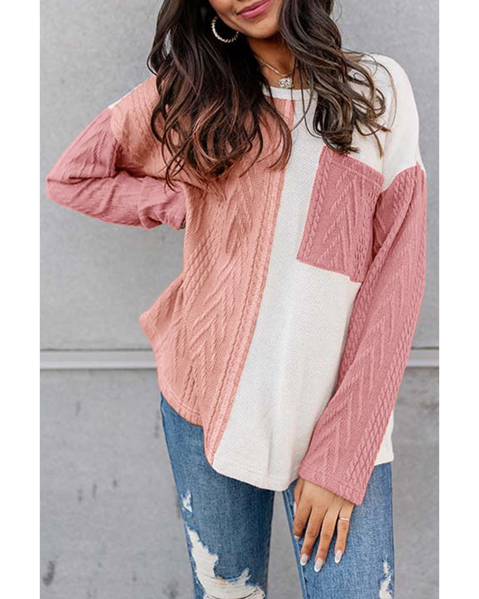 Peach Blossom Long Sleeve Colorblock Chest Pocket Textured Knit Top – M