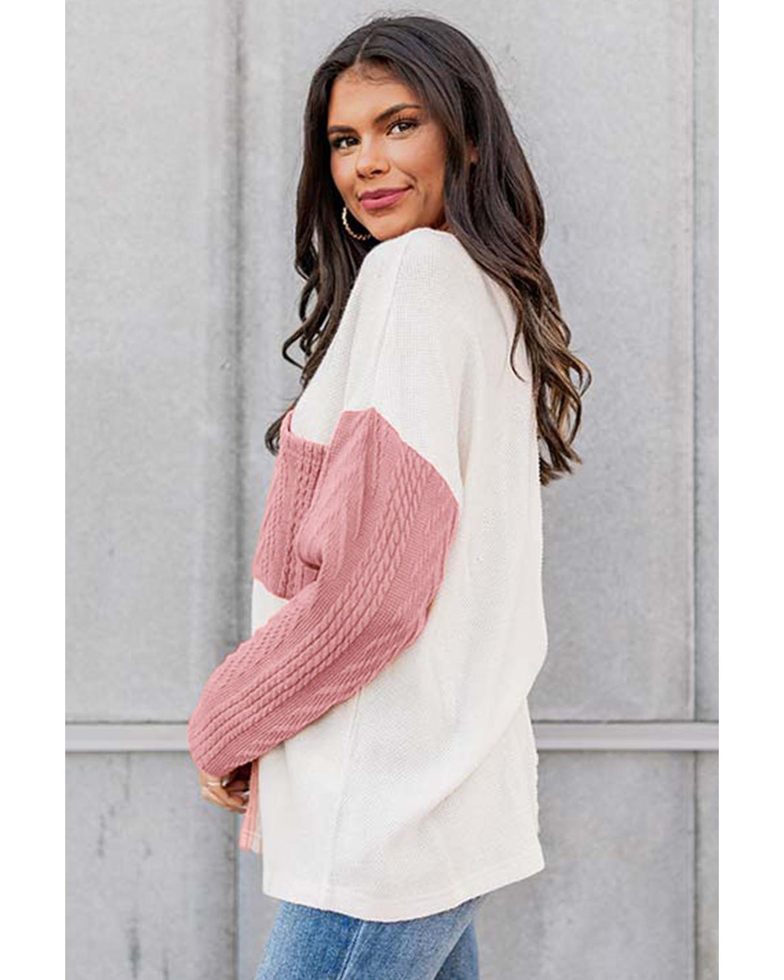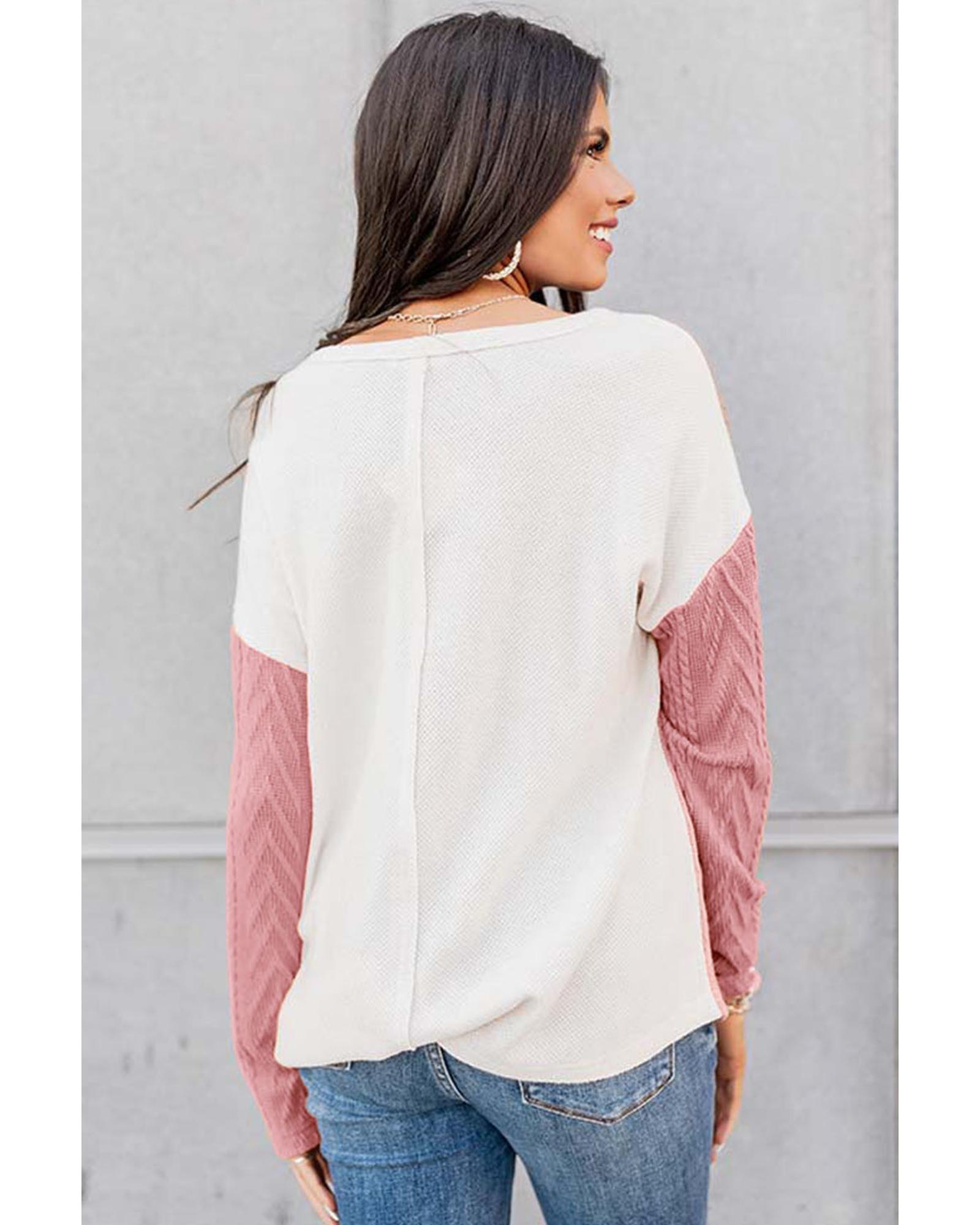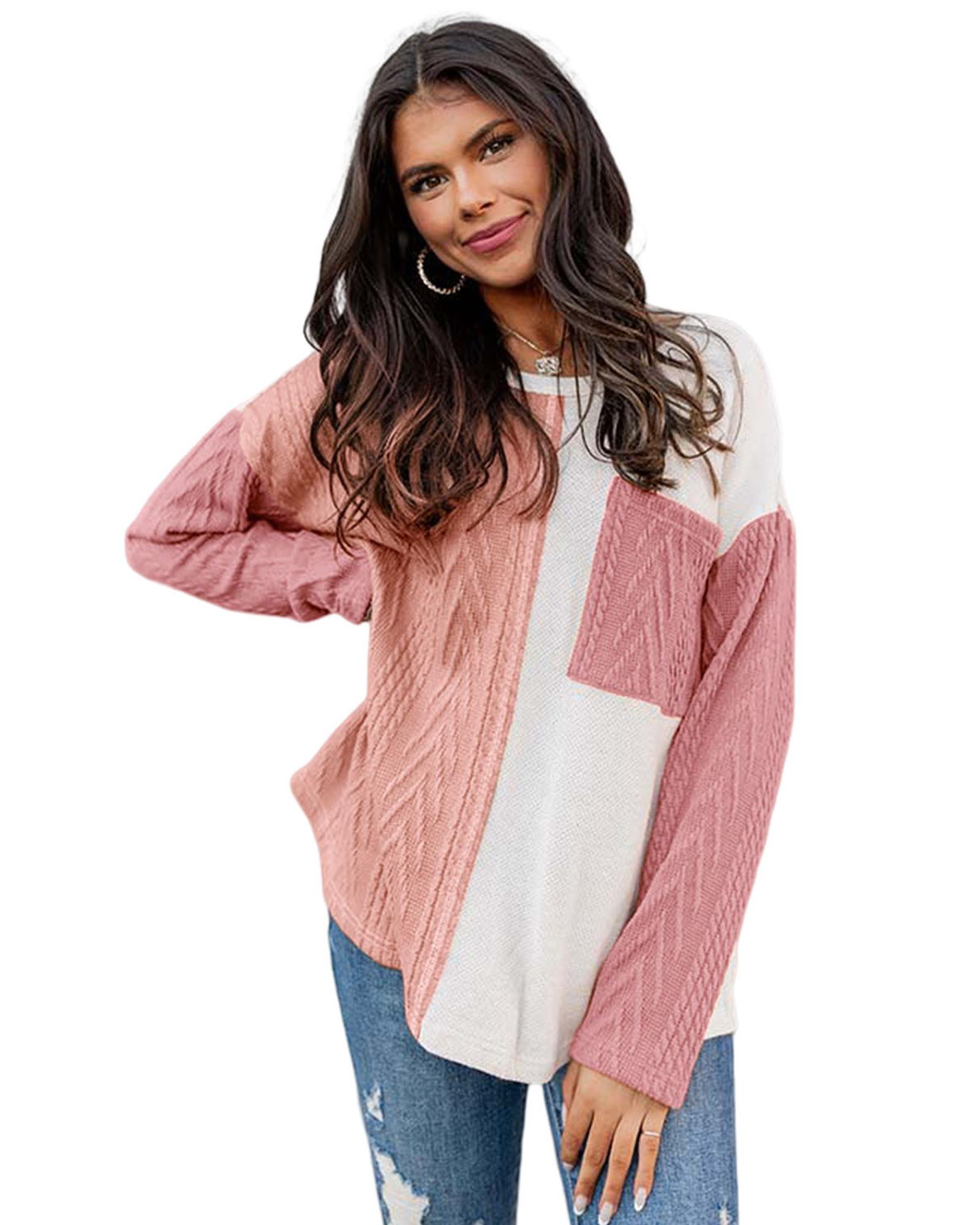 Peach Blossom Long Sleeve Colorblock Chest Pocket Textured Knit Top – S