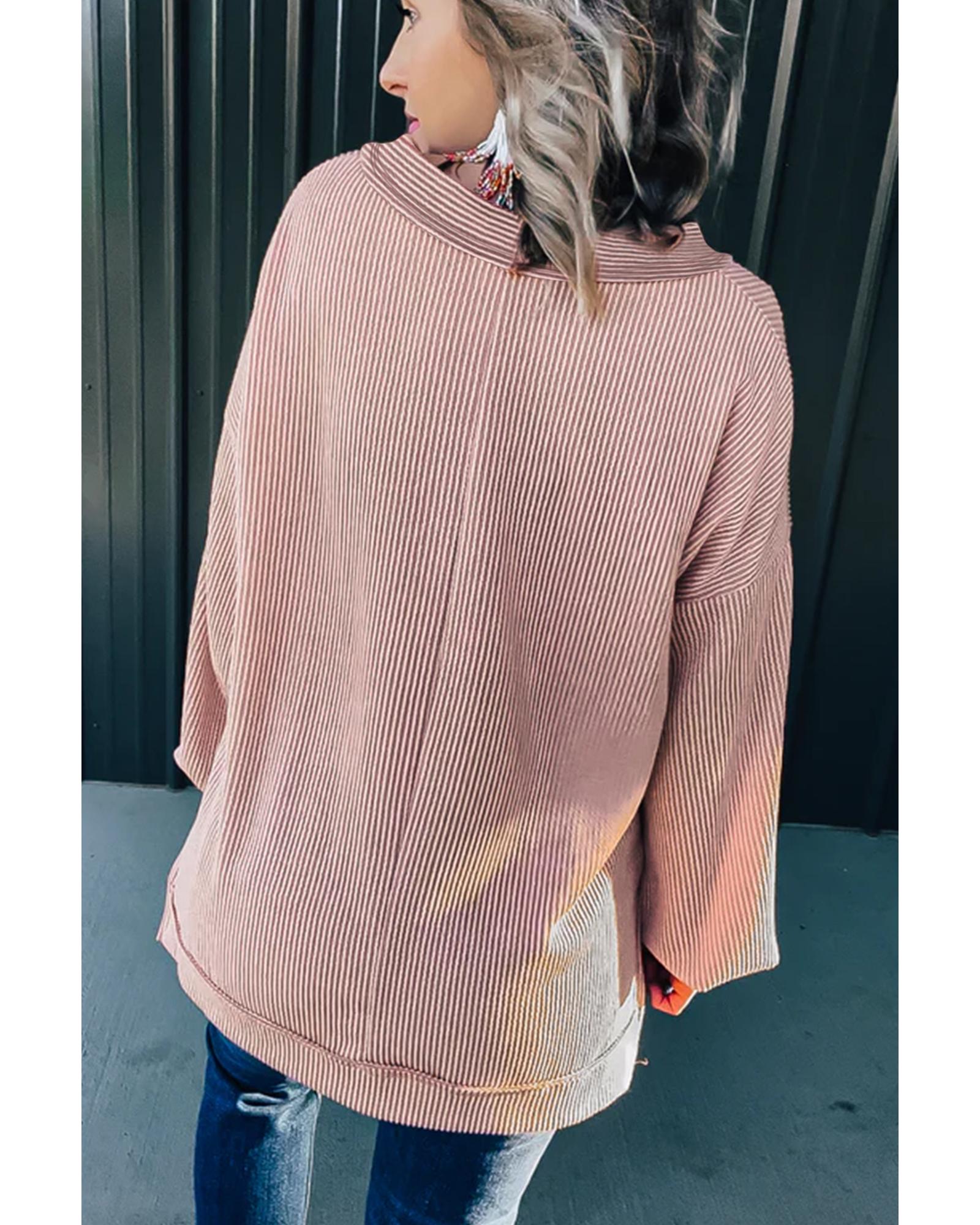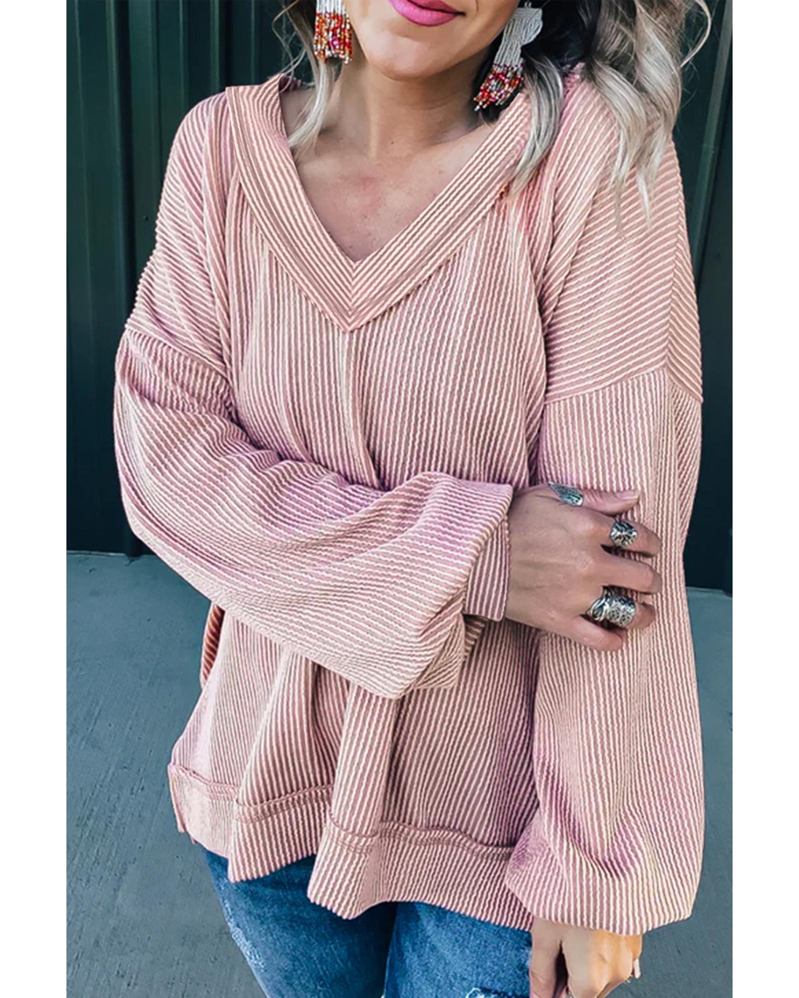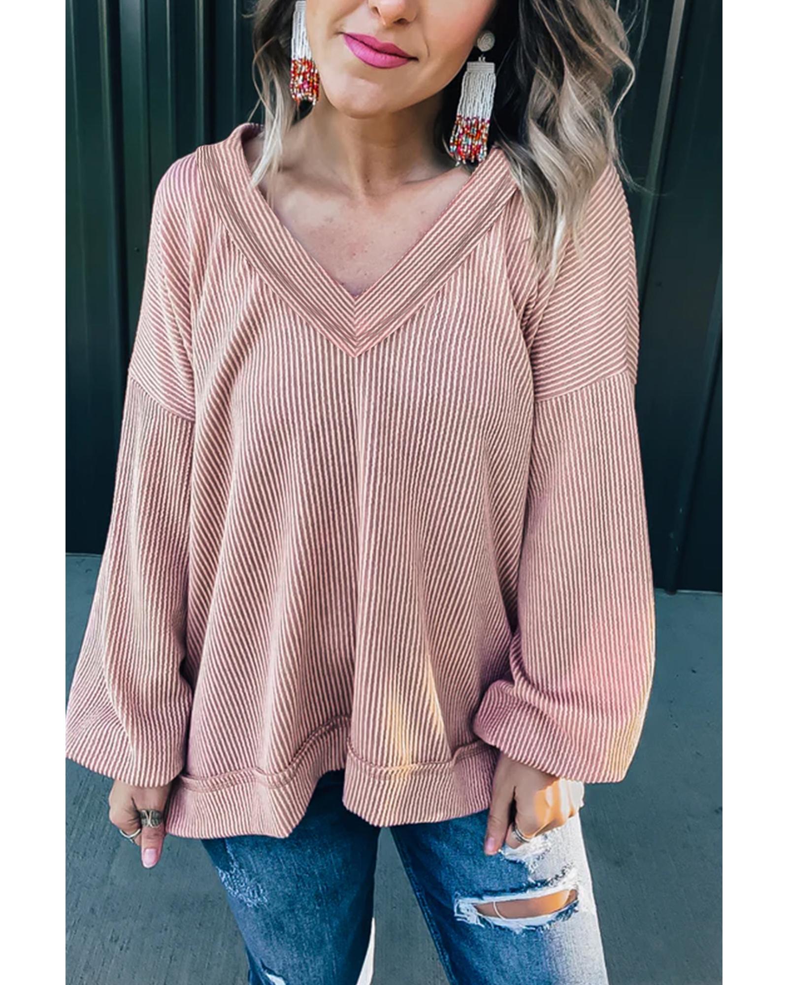 Peach Blossom Loose V Neck Bubble Sleeve Knit Ribbed Top – M