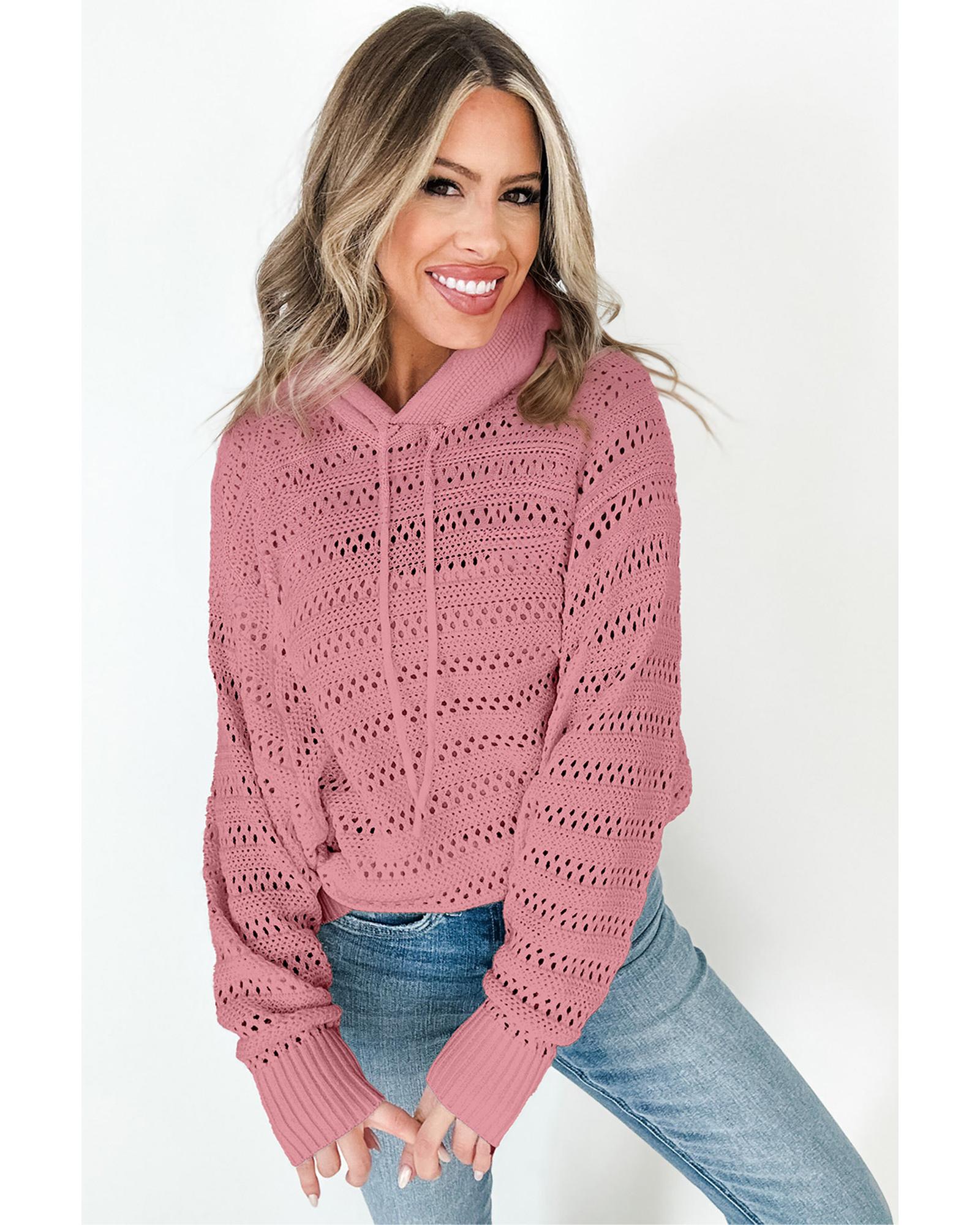 This Pointelle Knit Raglan Sleeve Hooded Sweater combines a trendy fitted silhouette with intricate knit details. Designed for comfort and style, it features cozy raglan sleeves and a versatile hood with a drawstring, making it suitable for casual wear and easy to pair with various outfits.