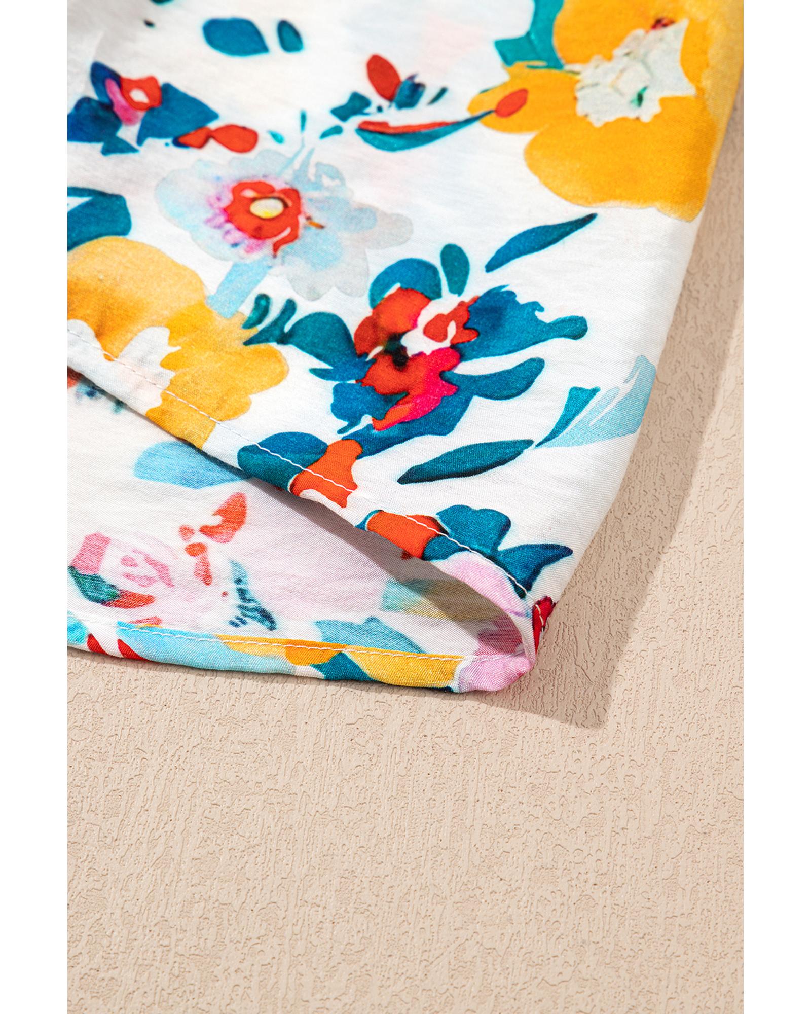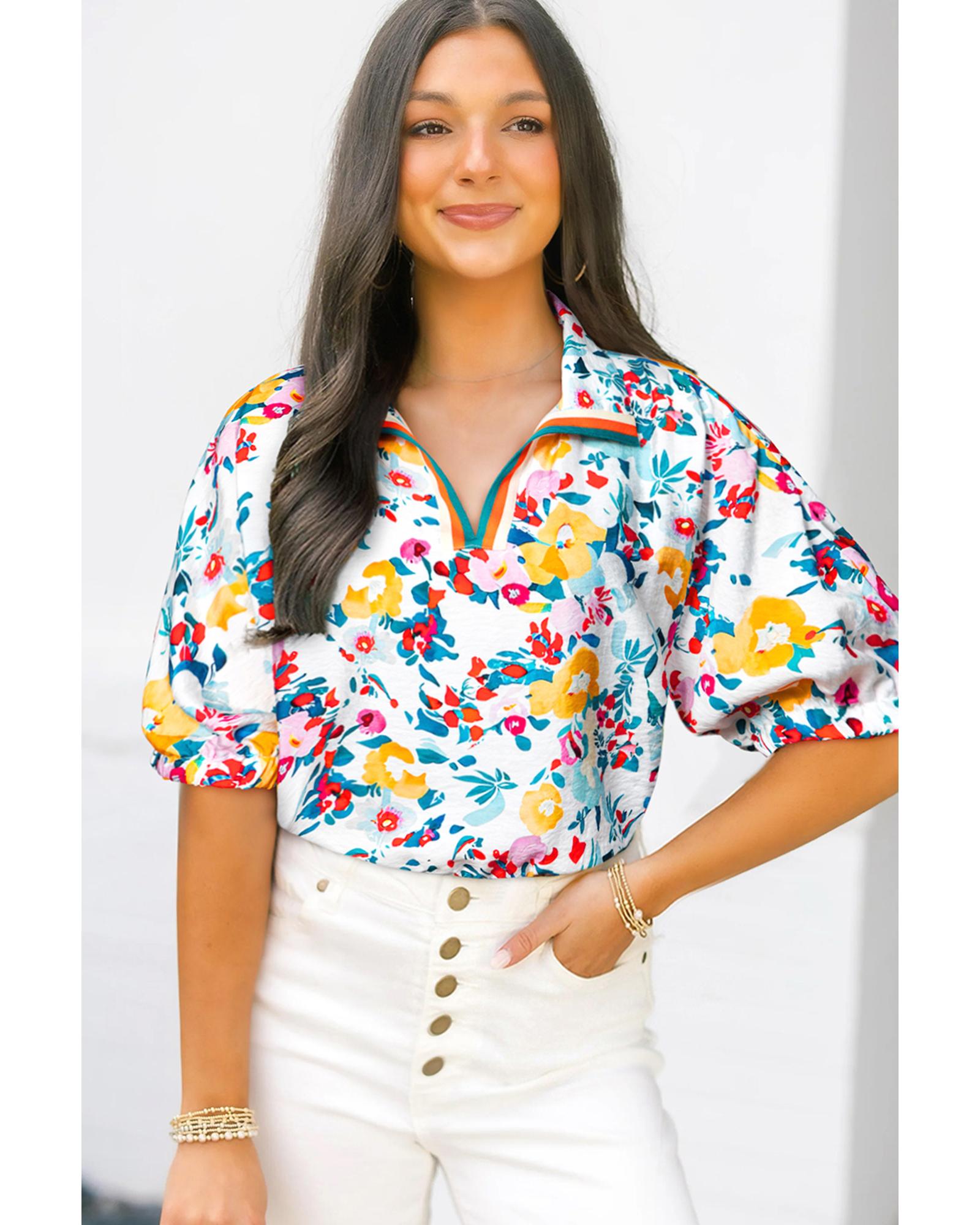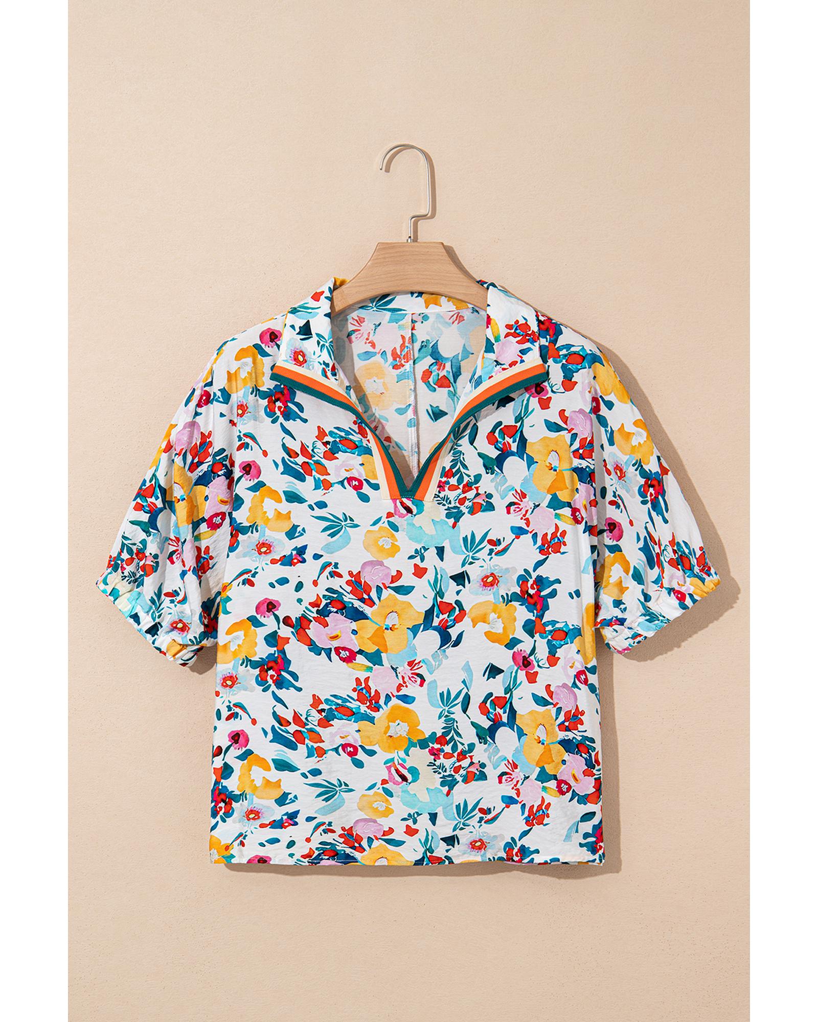 This blouse features a vibrant floral print and a stylish slit V-neck design, making it a versatile addition to your wardrobe. Its short puff sleeves with elastic cuffs add a touch of elegance, suitable for both casual and dressy occasions.